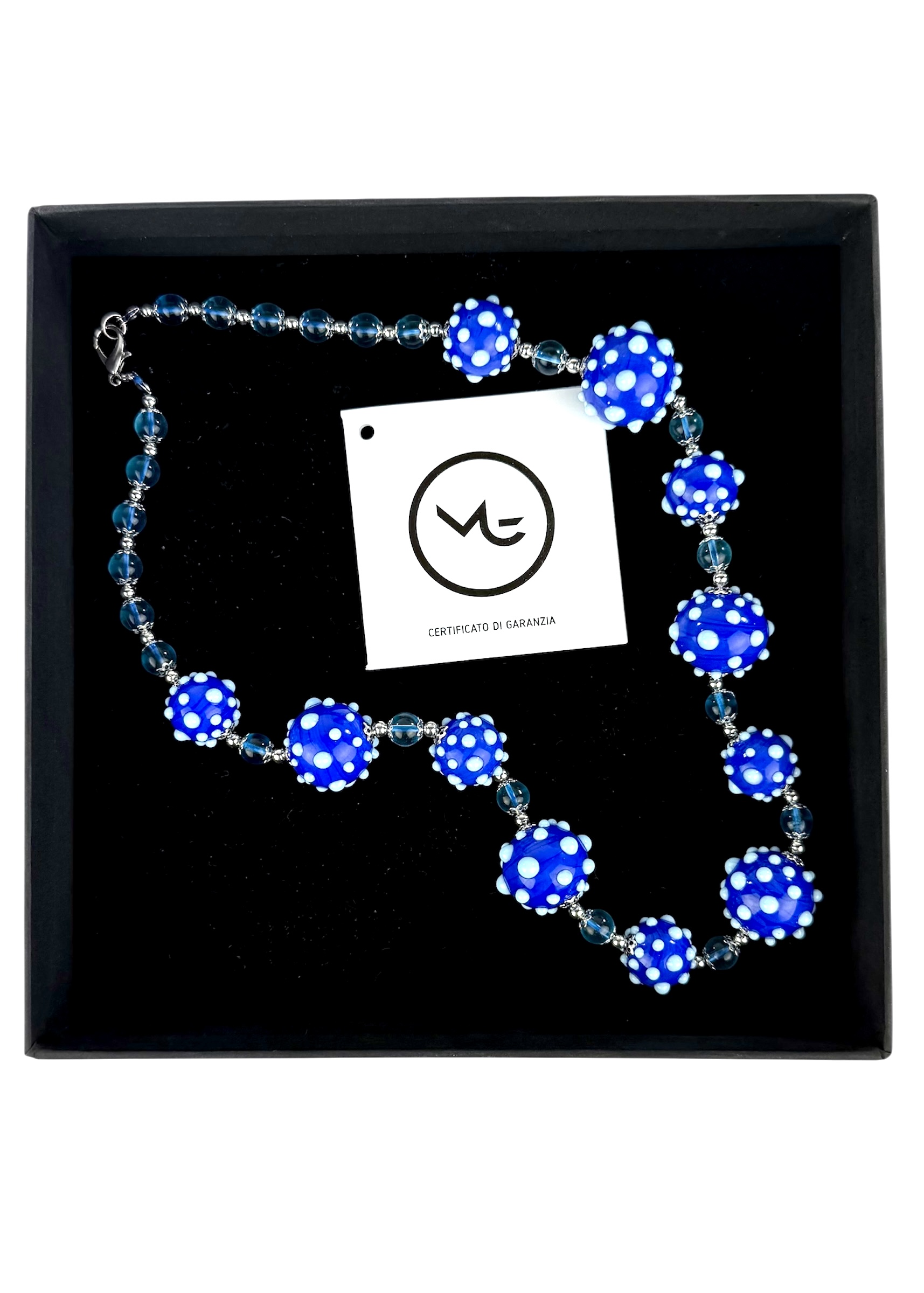 The parure is composed of spheres with decorations made and assembled one by one with needle and thread by our master glassmaker.