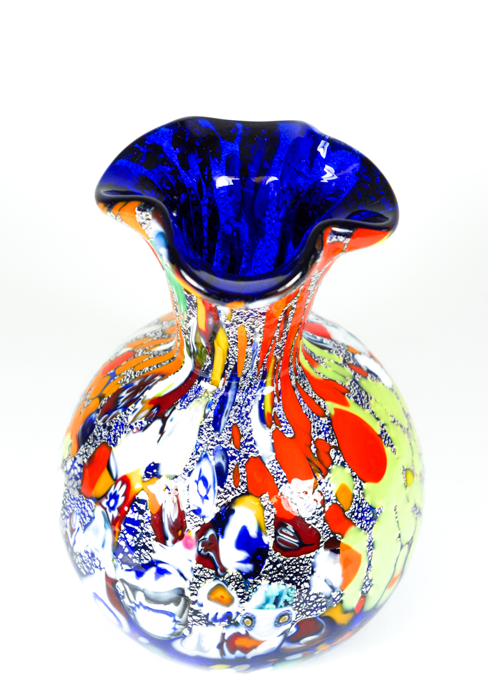 Venetian blown glass blue vase with assorted filigree decorations, Millefiori, “Mace” and silver.