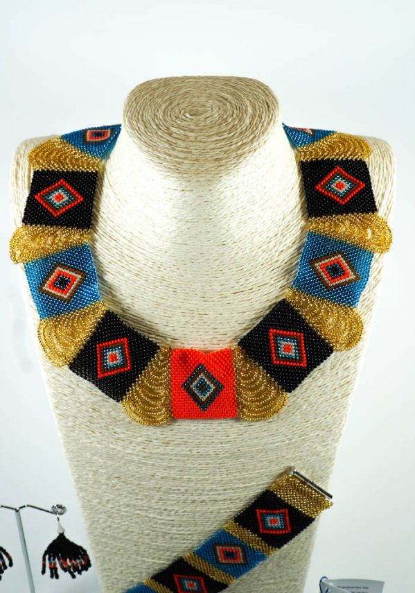 Enchanting set “Maia”, consisting of necklace, bracelet and earrings, entirely carried out by hand with micro beads in Murano glass colored and in 24 carats gold.