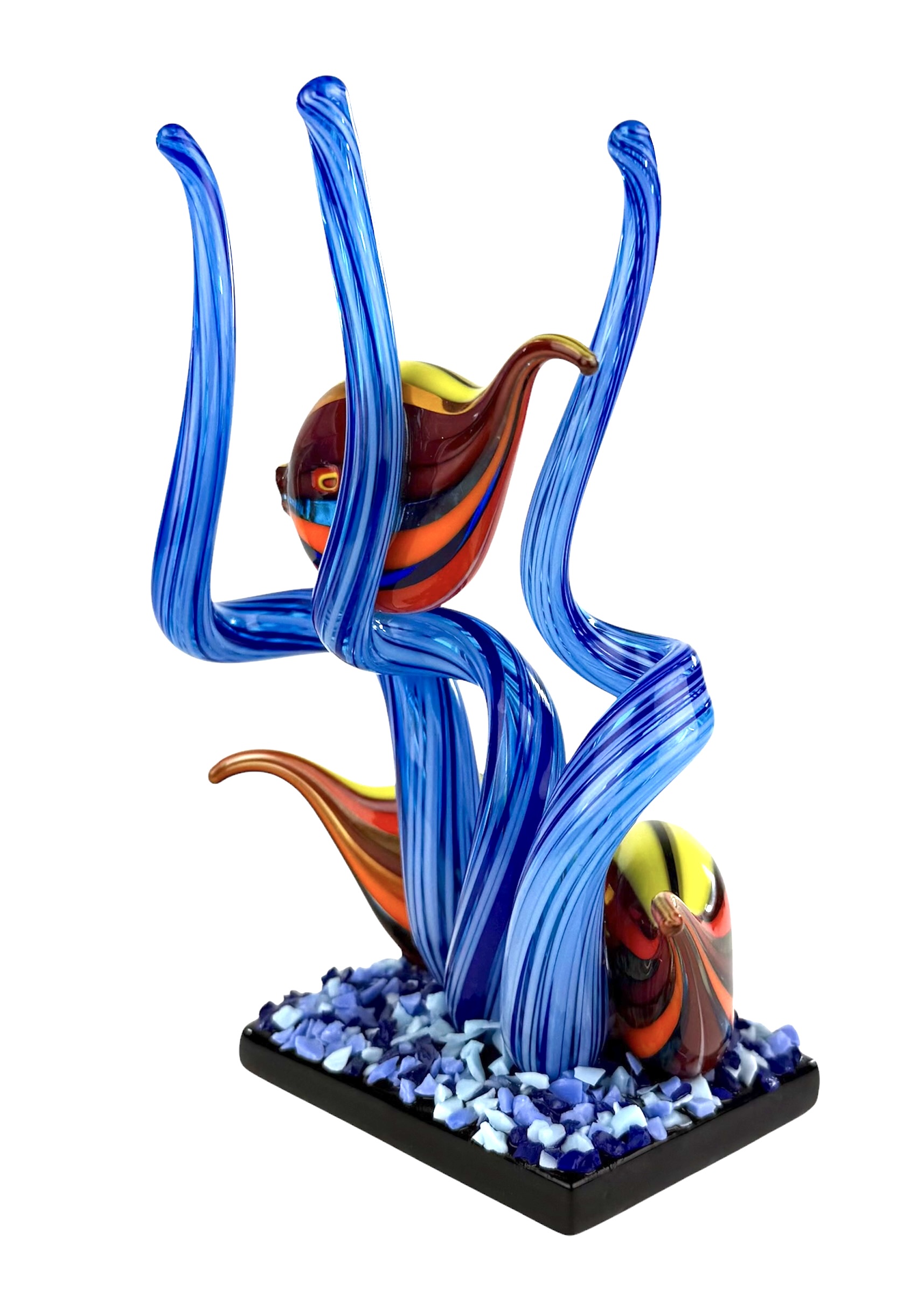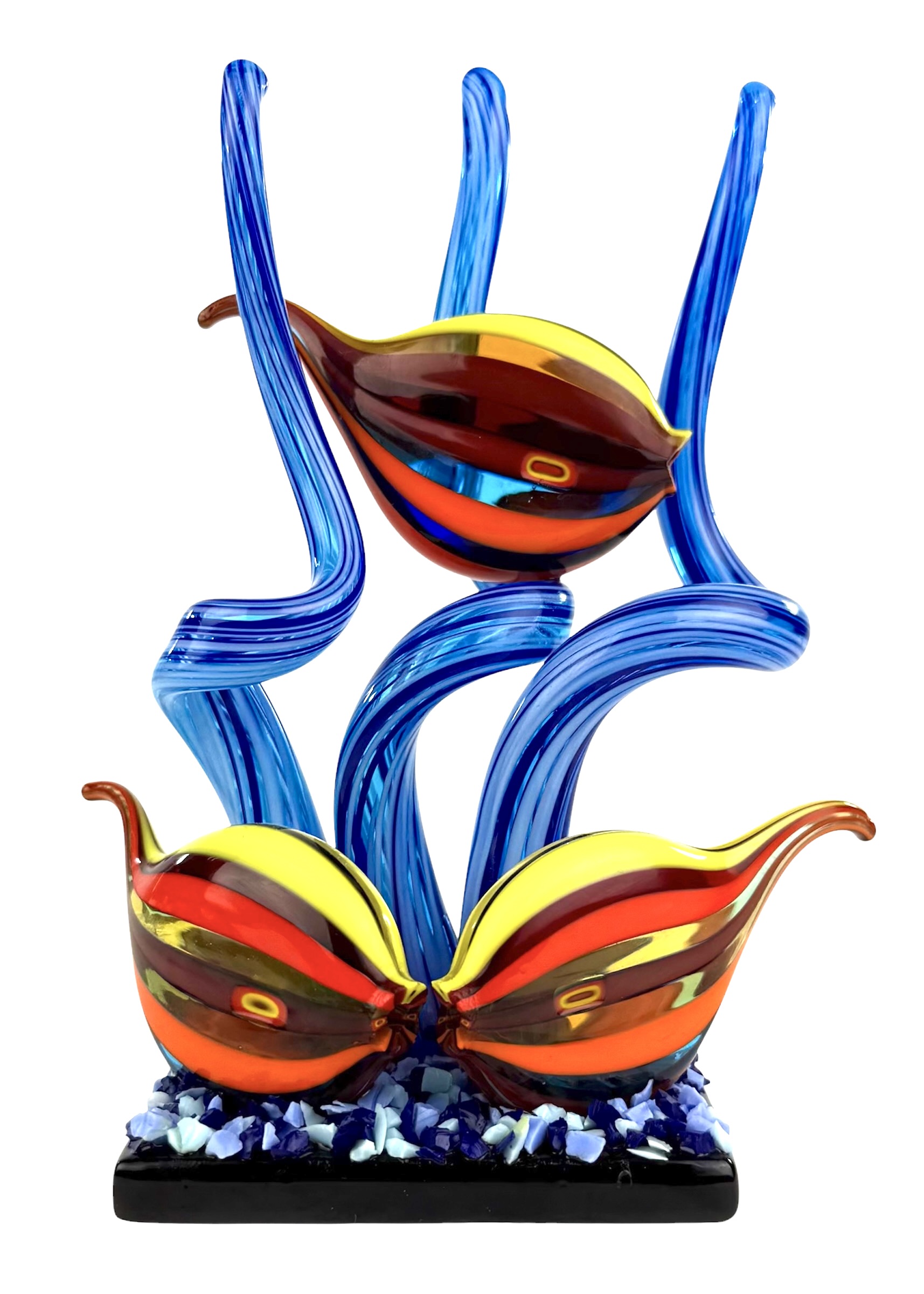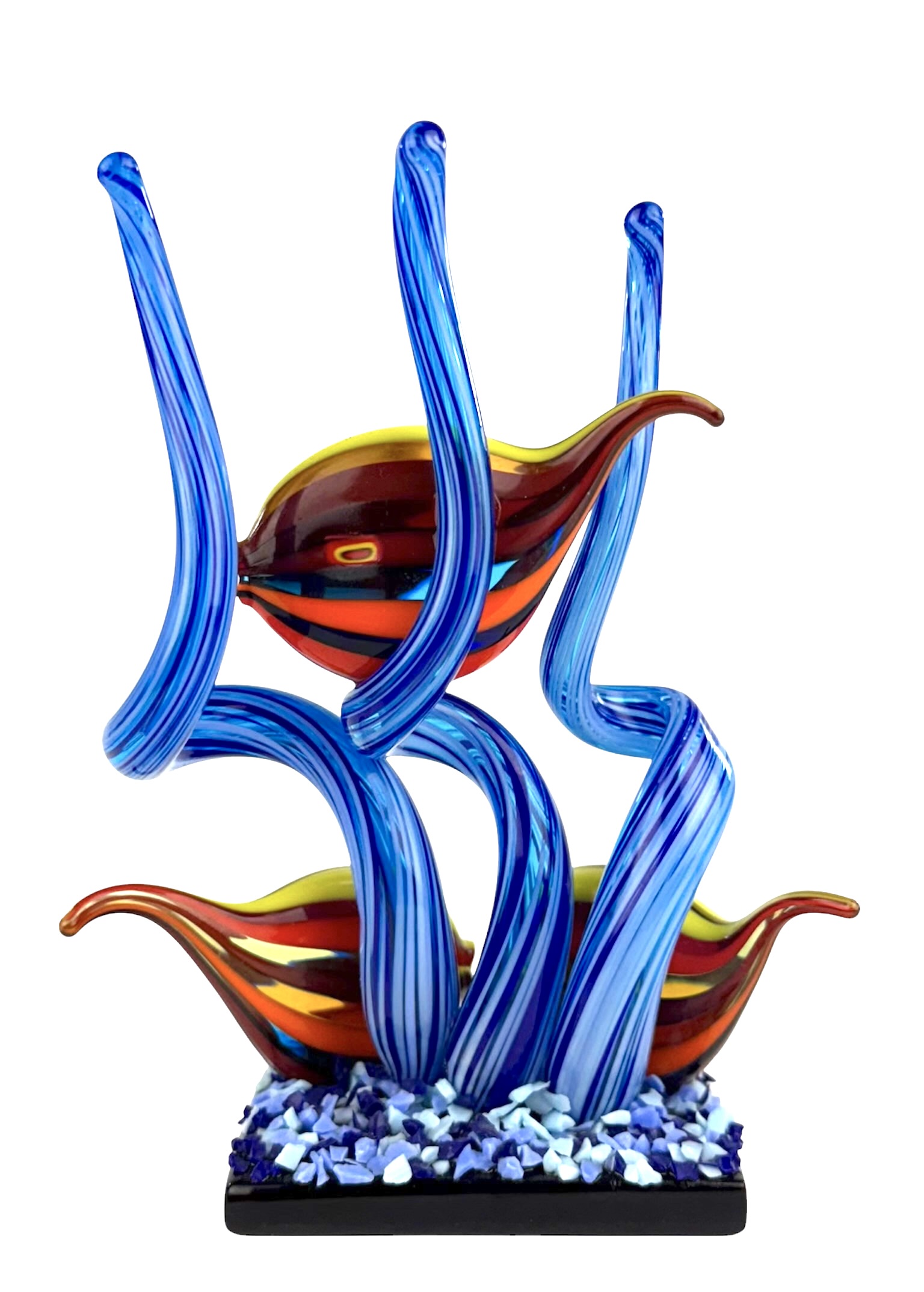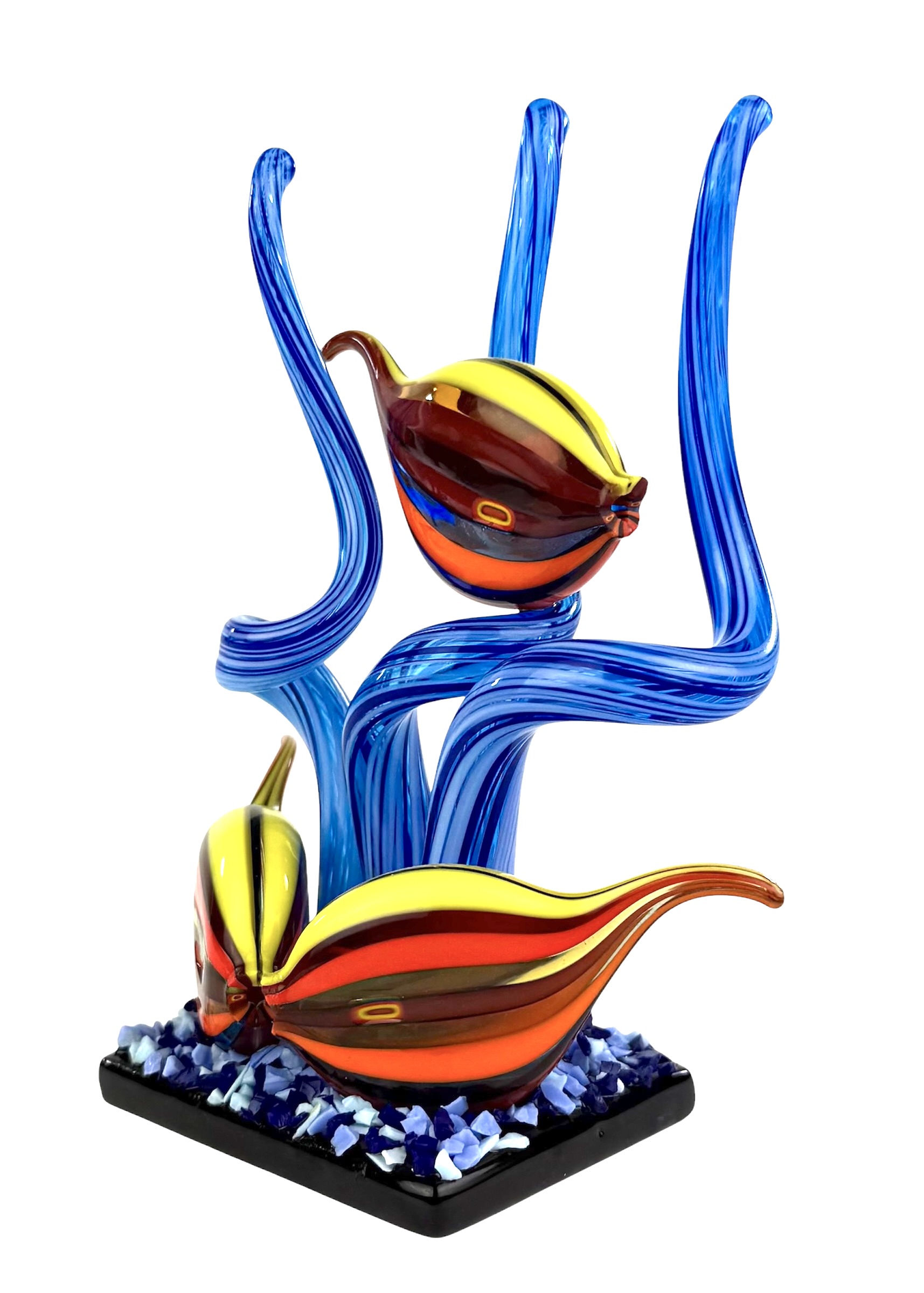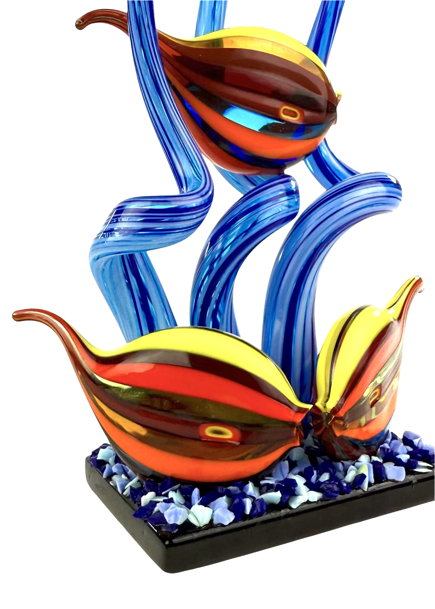 Murano glass aquarium with 3 tropical fish in multicolored kanne and 3 algae.