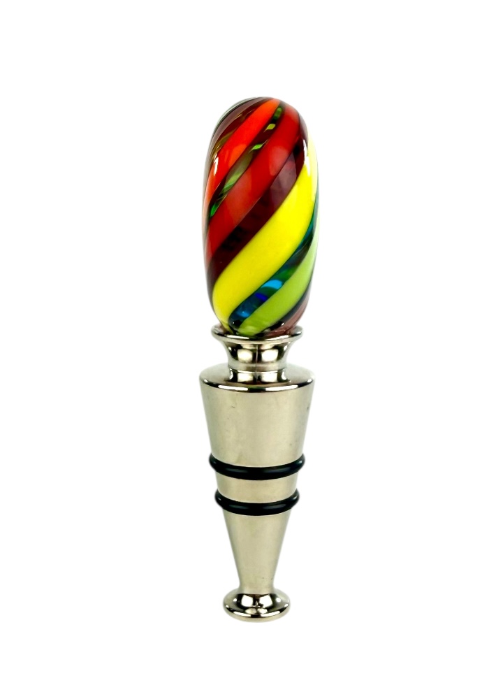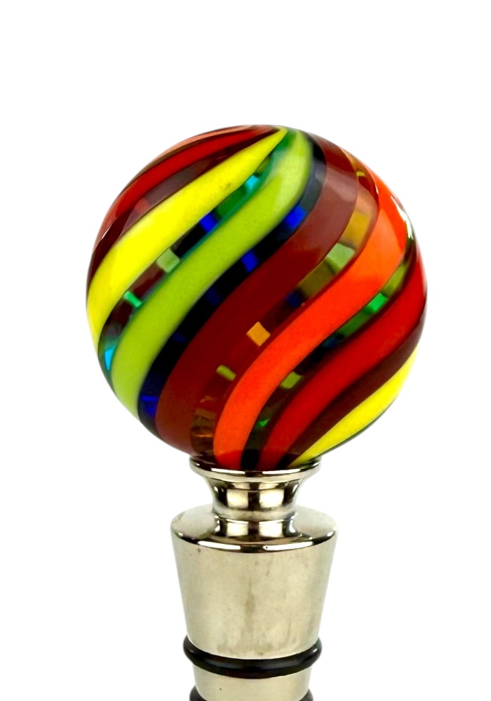 Murano glass bottle stopper with blue, light blue, green, amber, yellow, orange and red kanne.