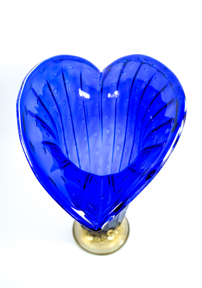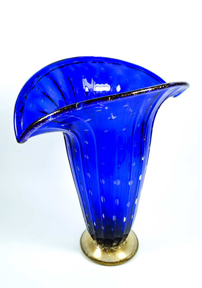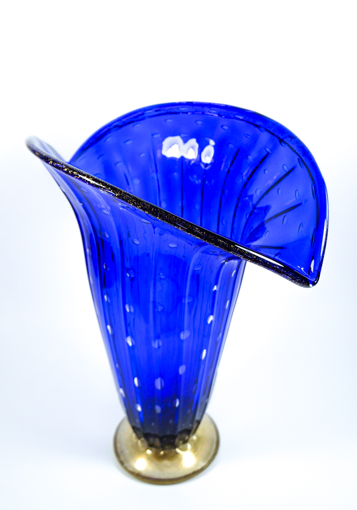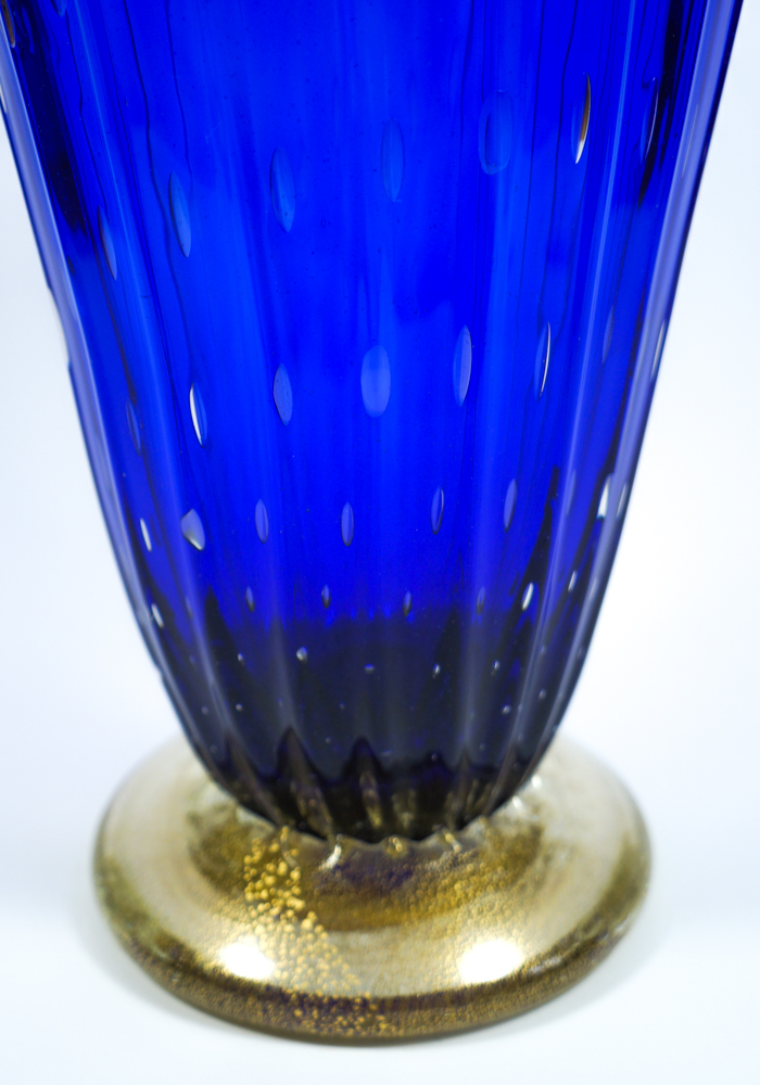 Handmade blue venetian glass vase with 24kt gold decorations. Work performed by Murano artisans Imperio Rossi and Costantini. Vase signed with cold engraving by artist. The Murano glass vase has the label Marchio Vetro Artistico®.