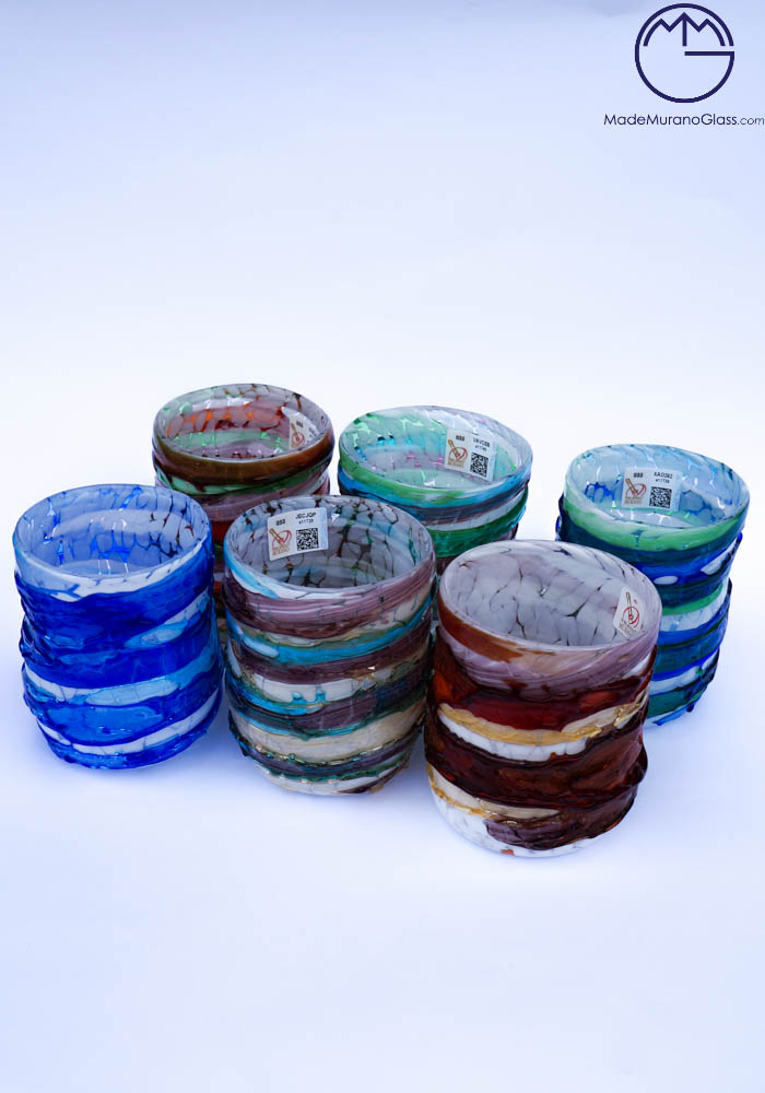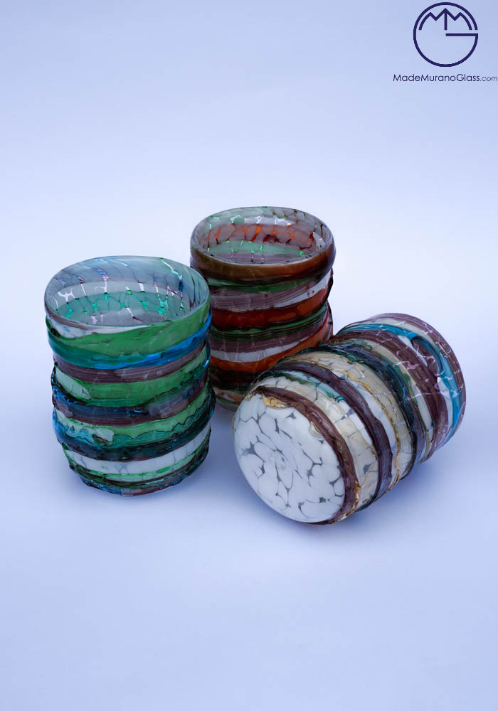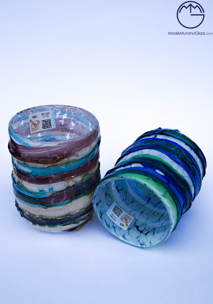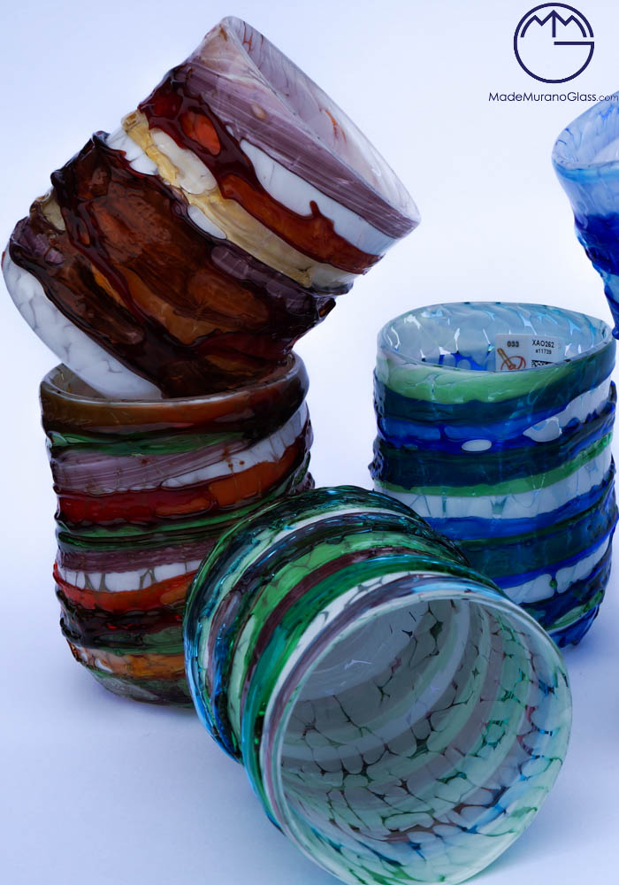 Set of 6 glasses made of venetian blown glass, handmade throught the ancient technique called “Sbruffi” by Murano artisans. It consists of 6 glasses with assorted coloured relieves as photos. This opera is signed with cold engraving by the glass Master (Imperio Rossi). This fantastic set Murano glasses has the label Marchio Vetro Artistico®.