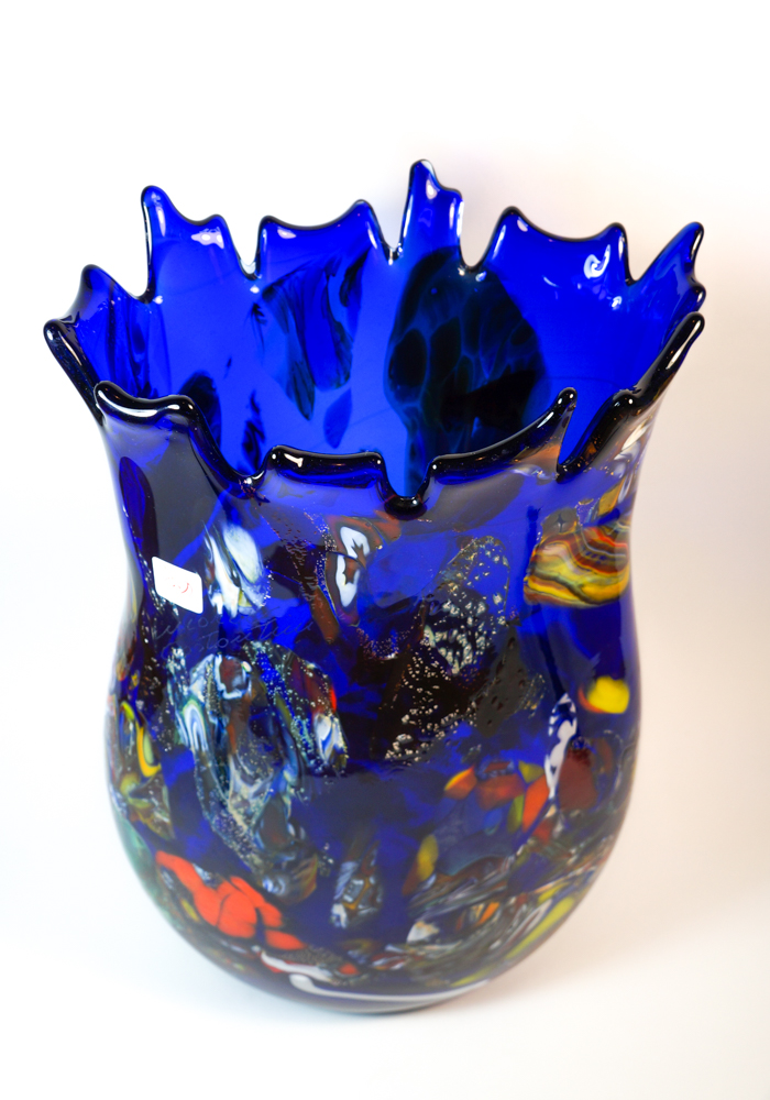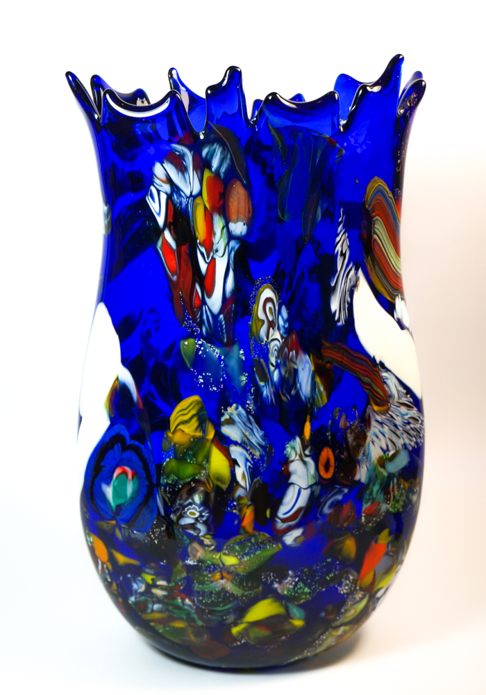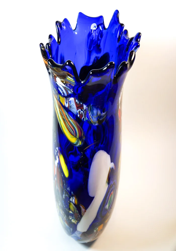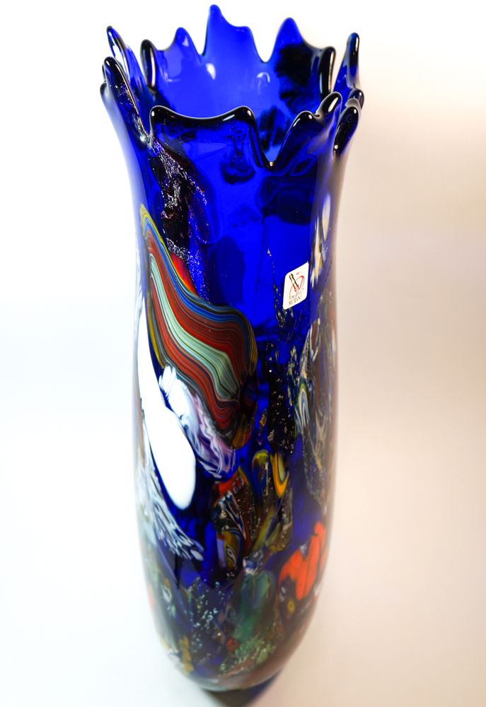 Murano blown glass blue vase with assorted filigree decorations, Millefiori, “Mace” and silver. “Mario Costantini” glassmaker Master mixes these colors in an ever different way, making the works so unique and inimitable. Vase signed with cold engraving as photos. The venetian glass vase has the label Marchio Vetro Artistico®. View Photo.