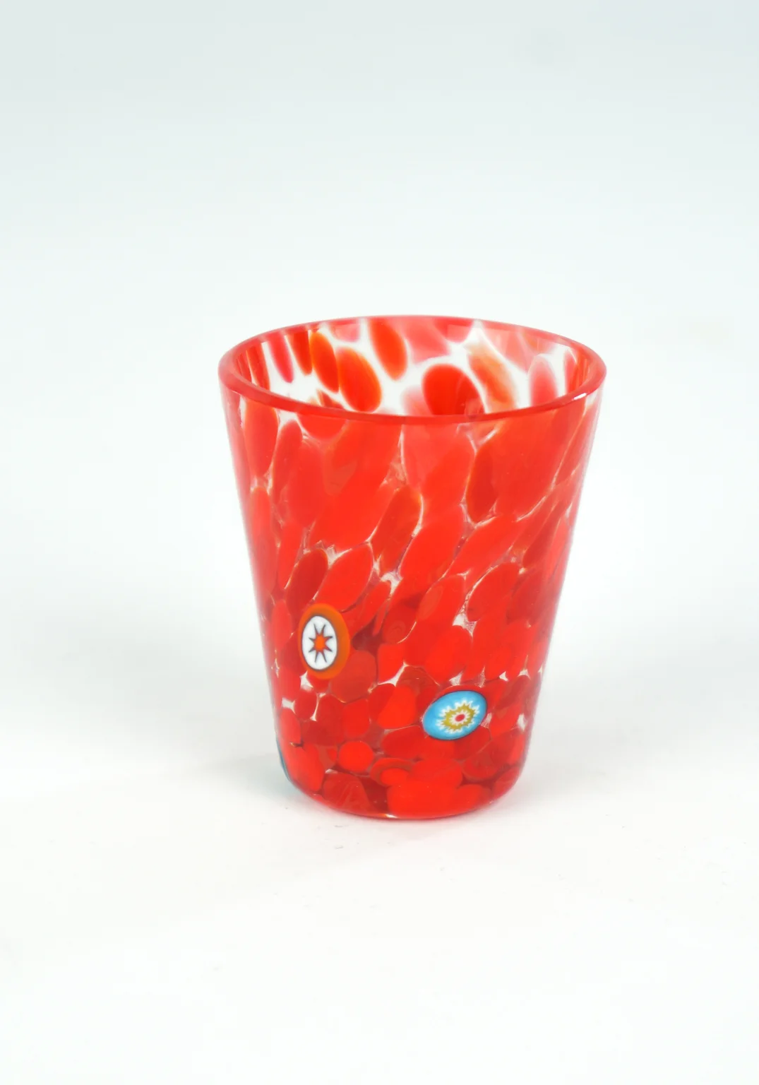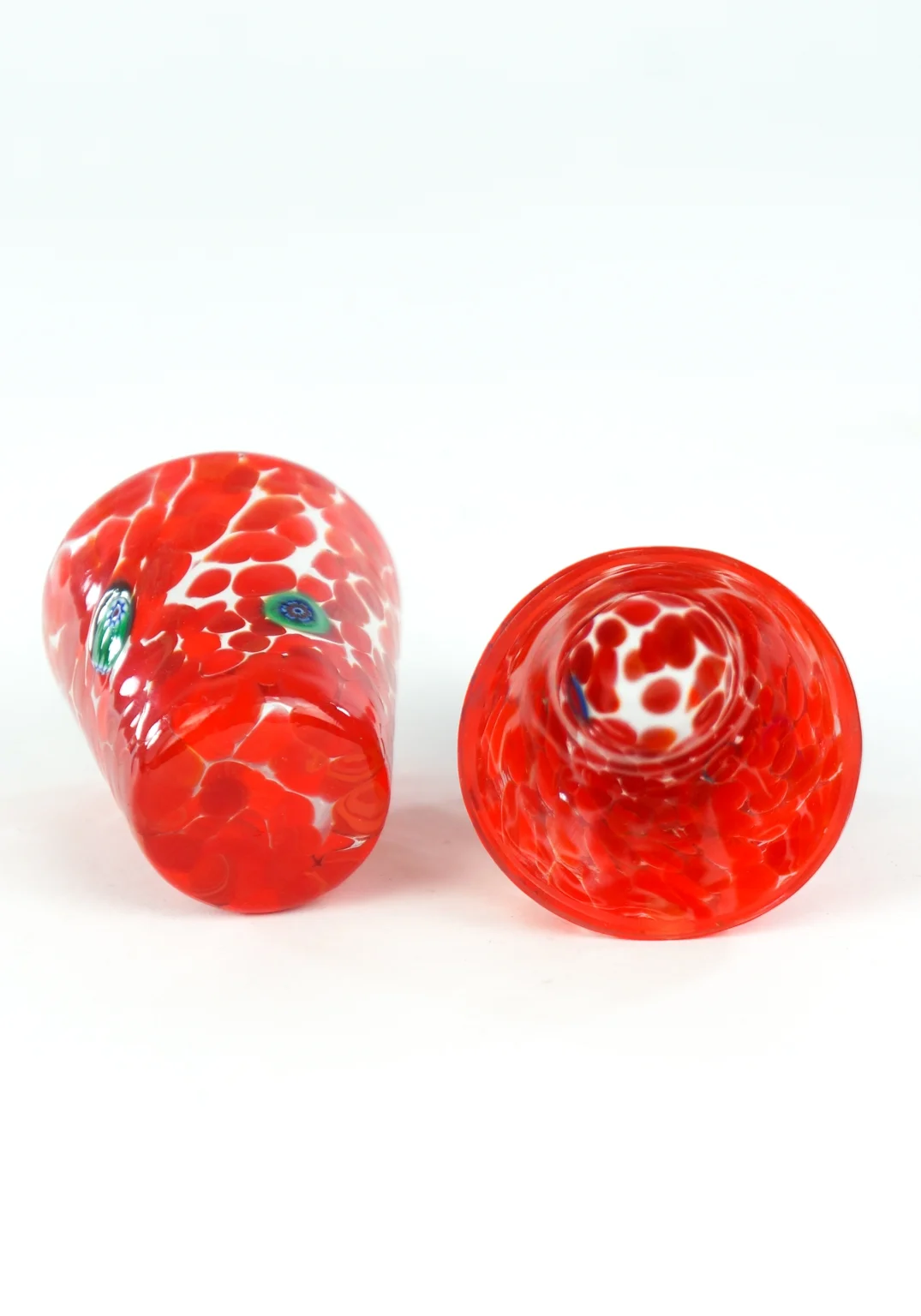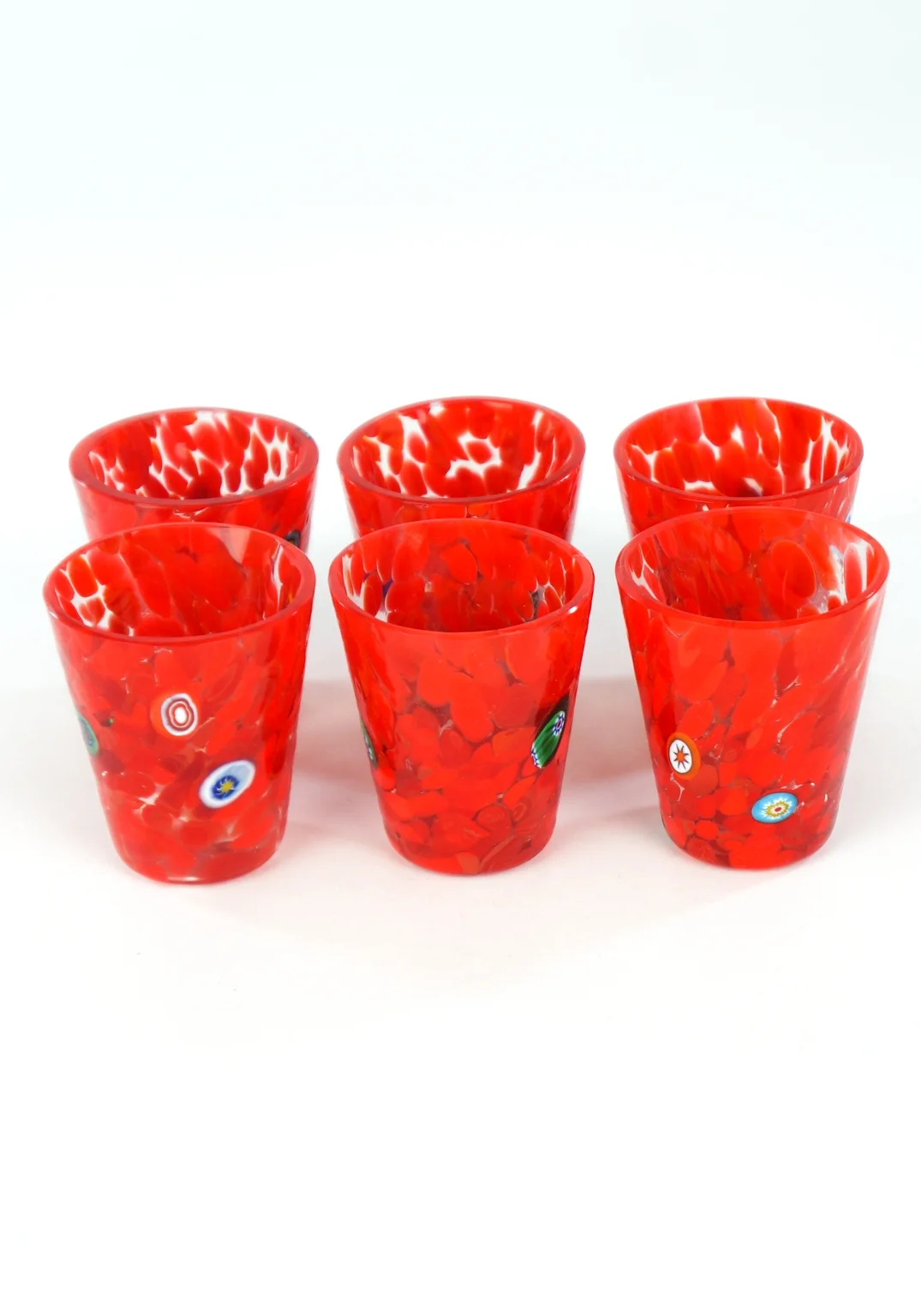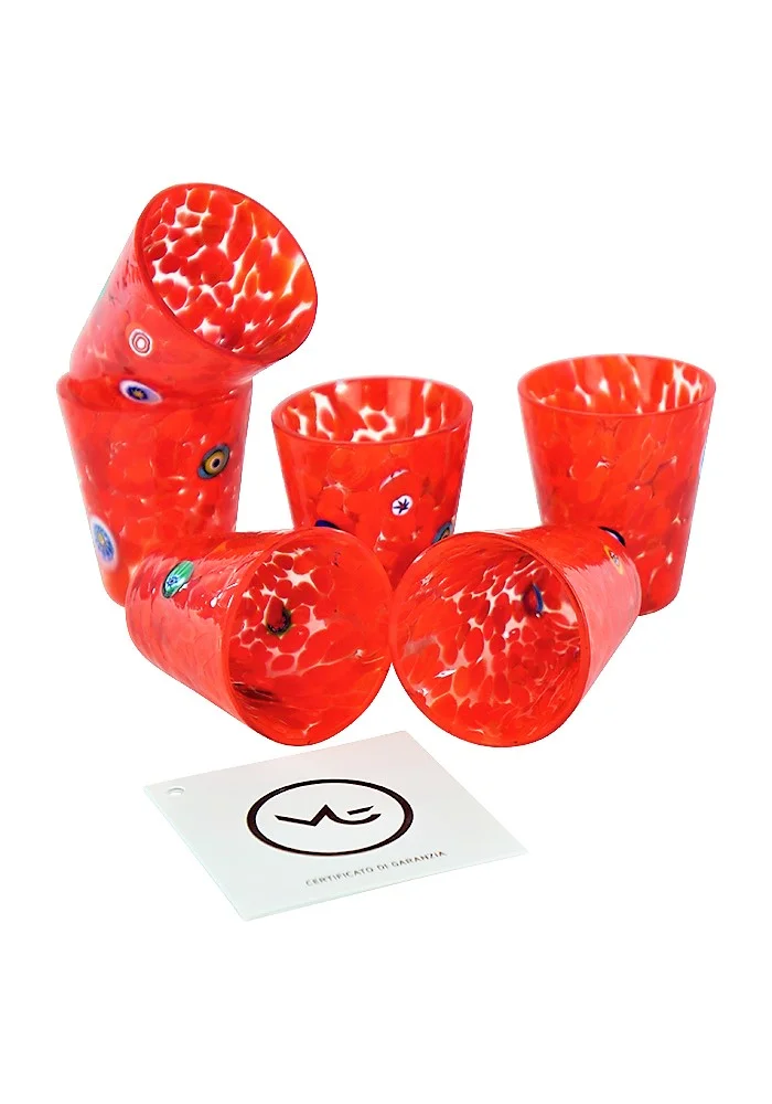 Exclusive set of 6 red liqueur glasses with Millefiori murrina decorations.