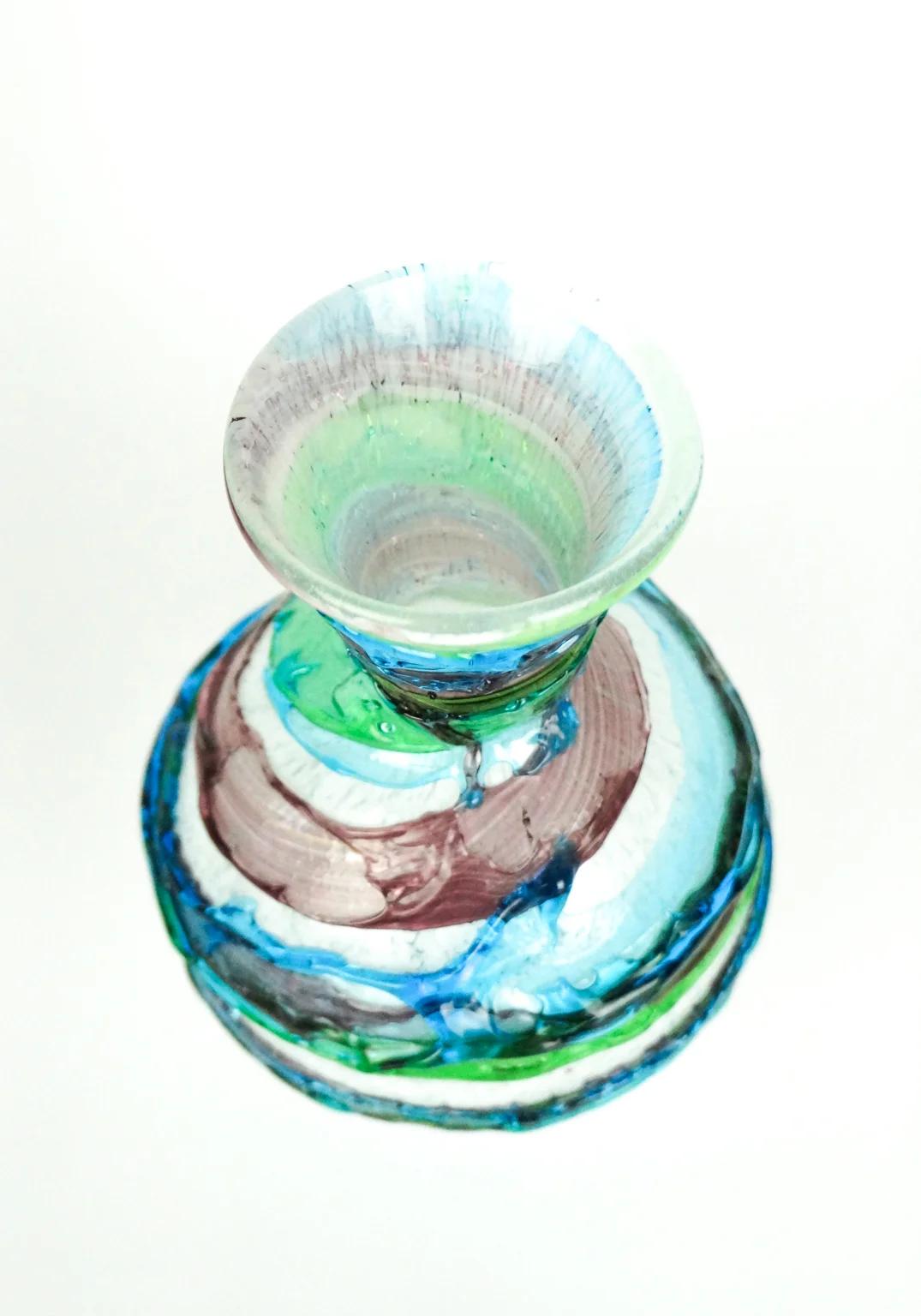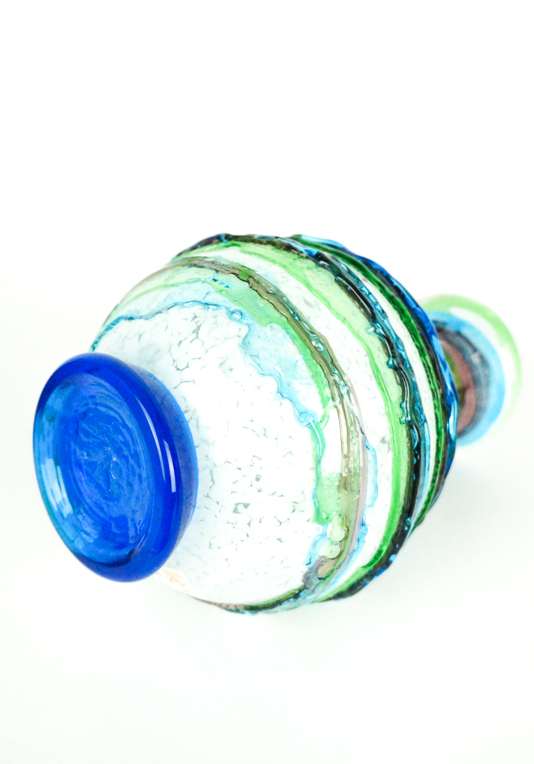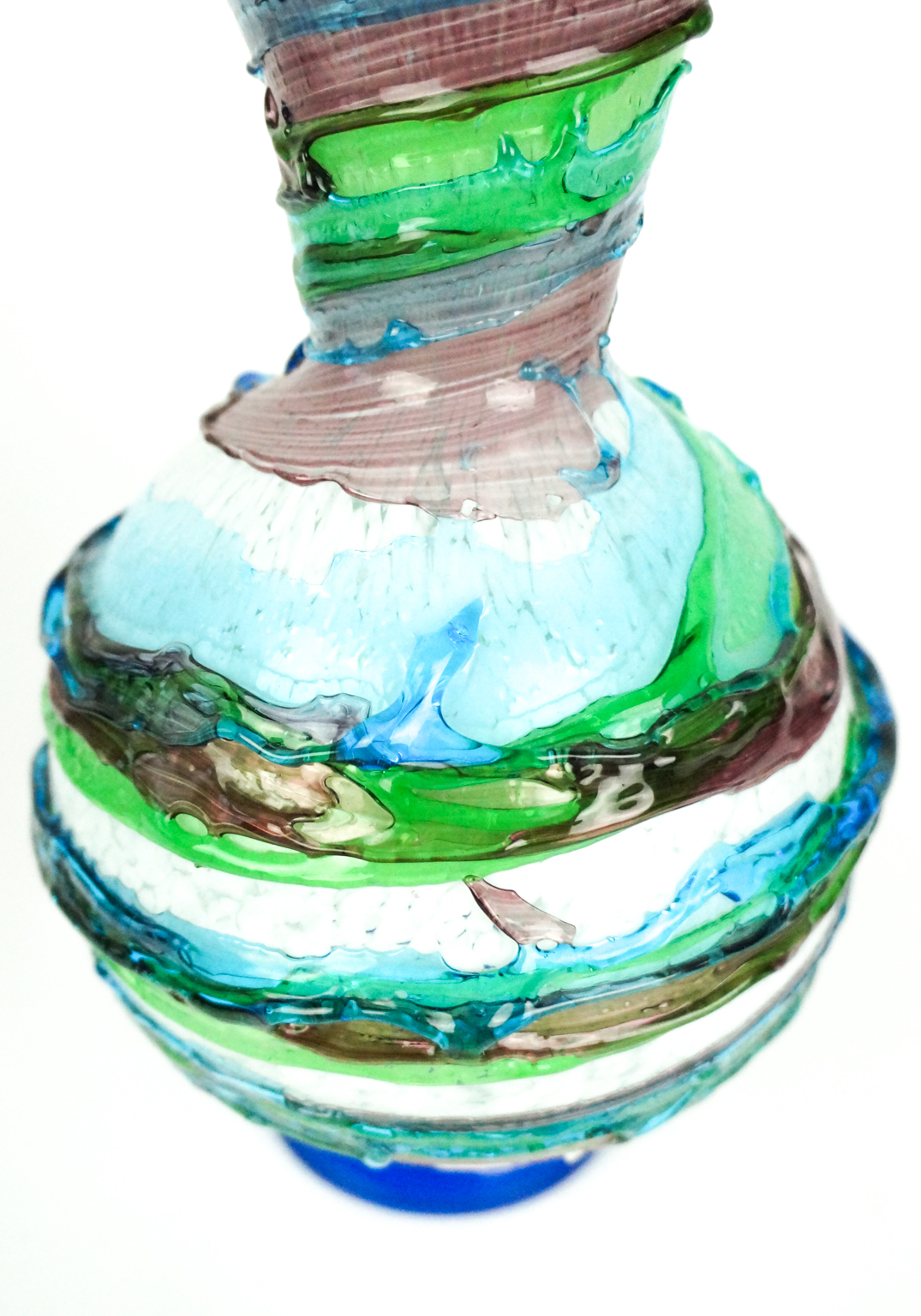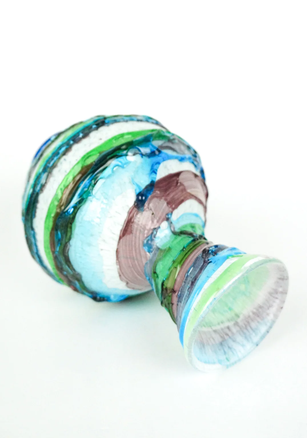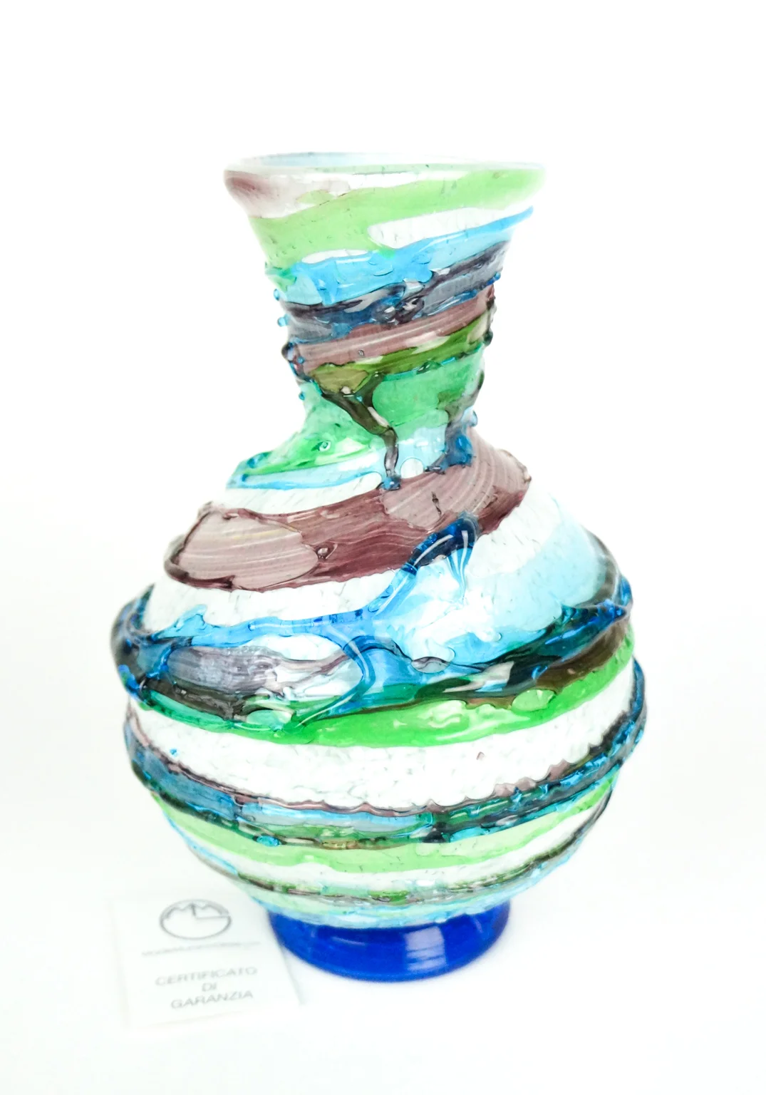 Made Murano blown glass Vase with coulure in relief applicated on the Opera, green, aquamarine, amethyst and white inside, this processing is called “Sbruffo”.