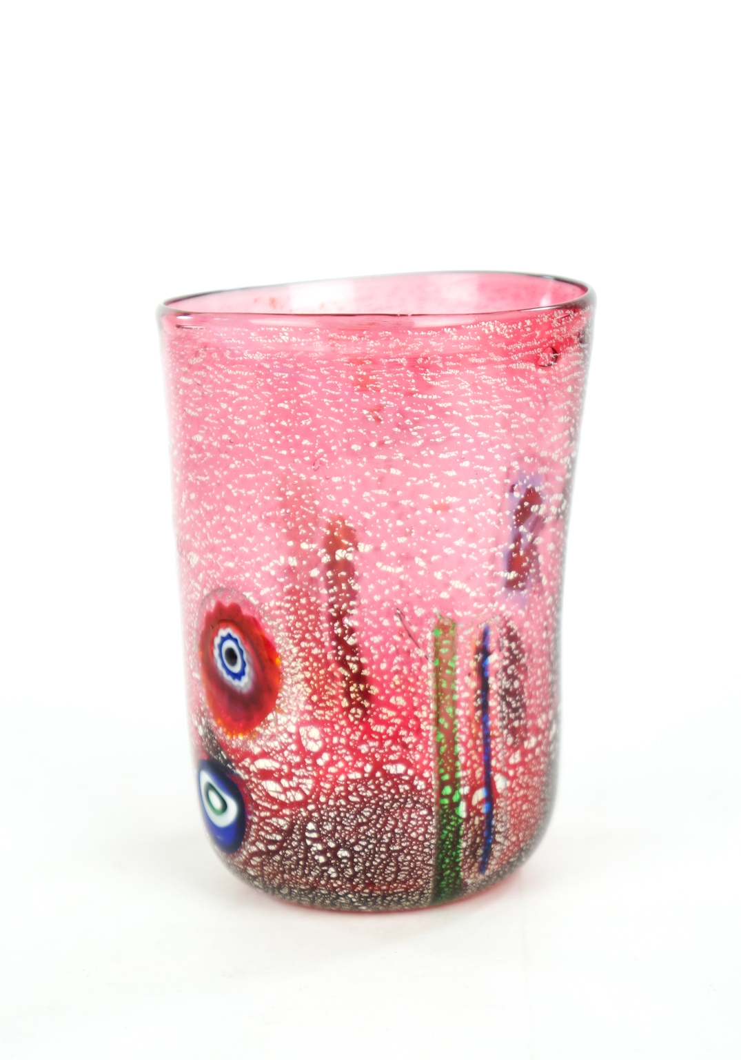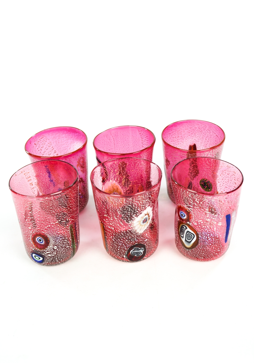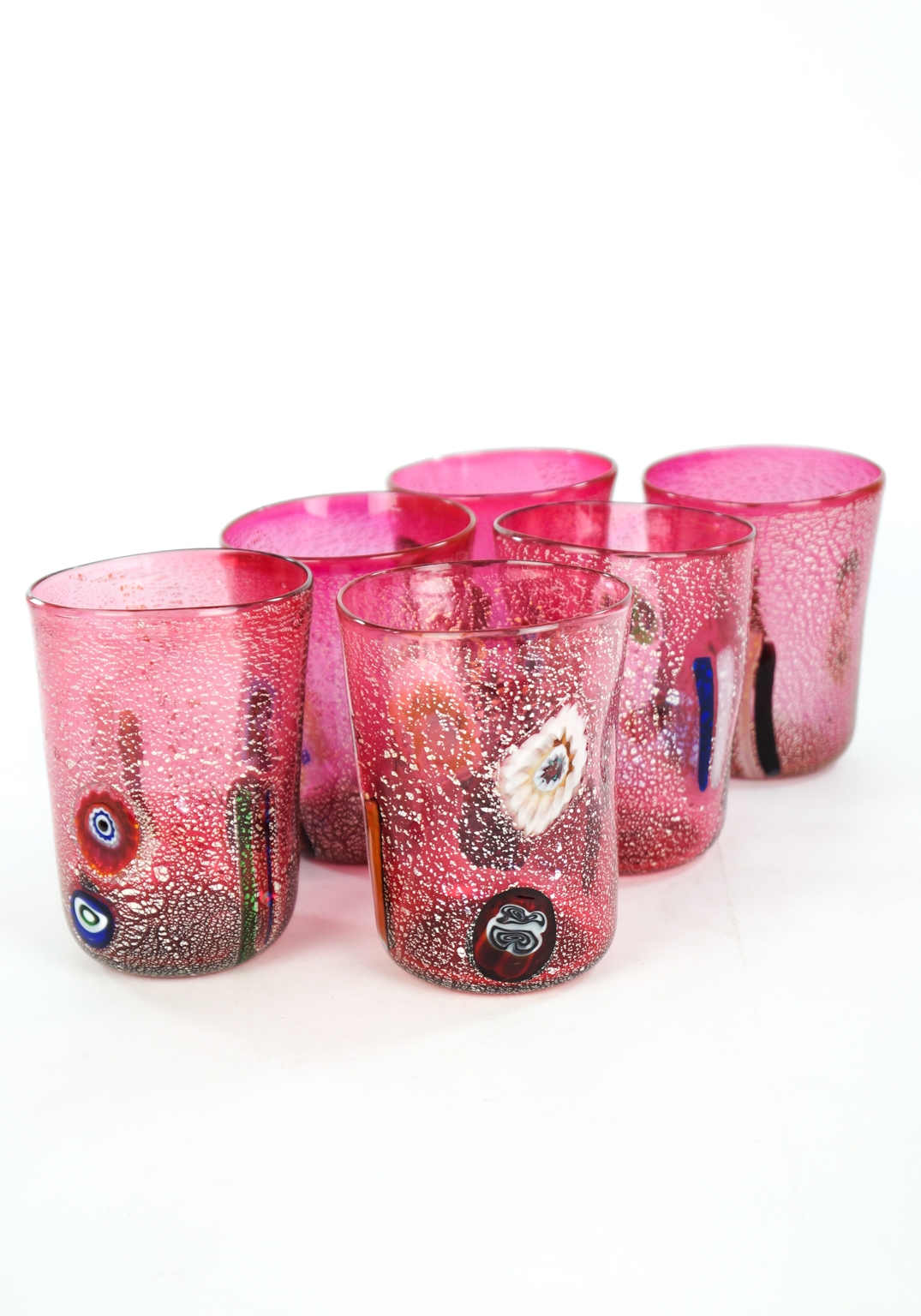 The set includes Six Murano Glass Tumblers with decoration in murrina Millefiori and real silver leaf.