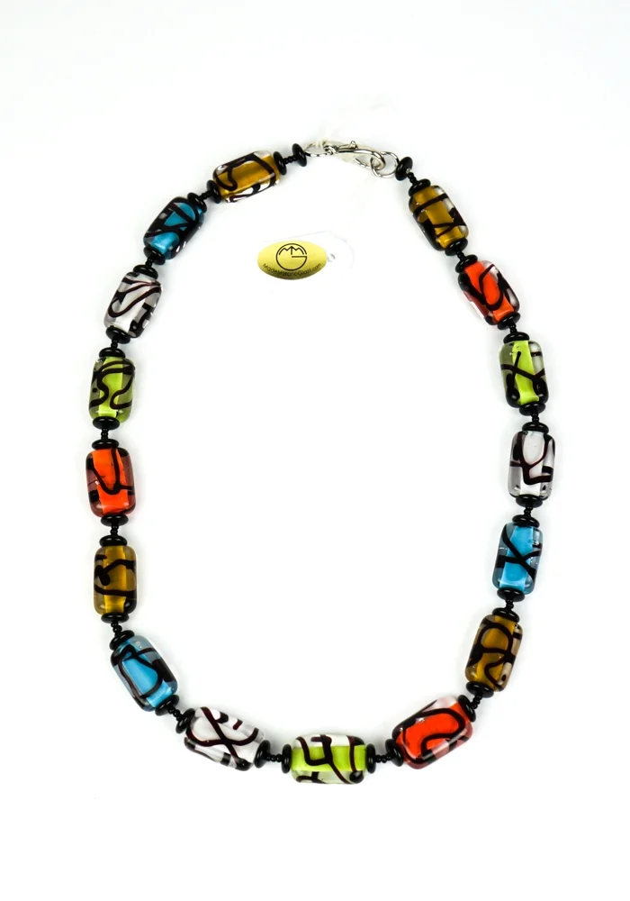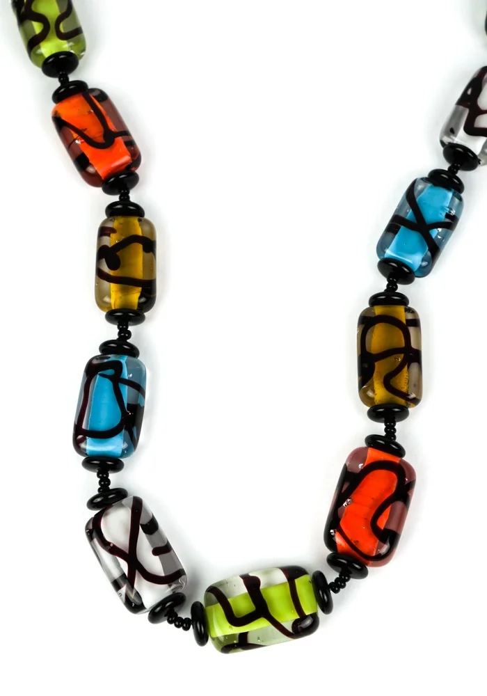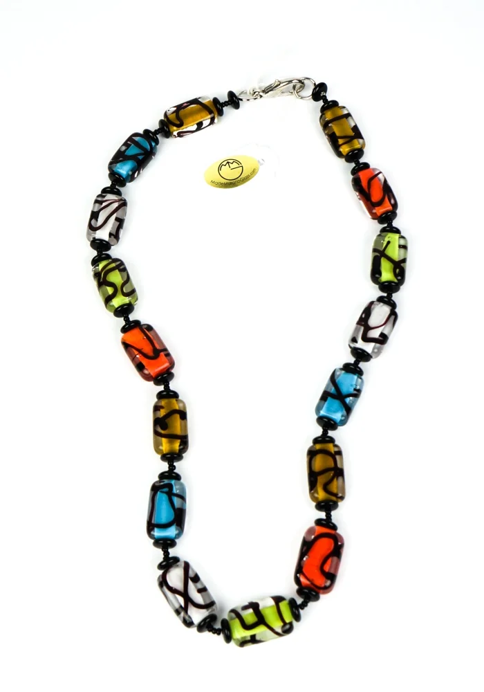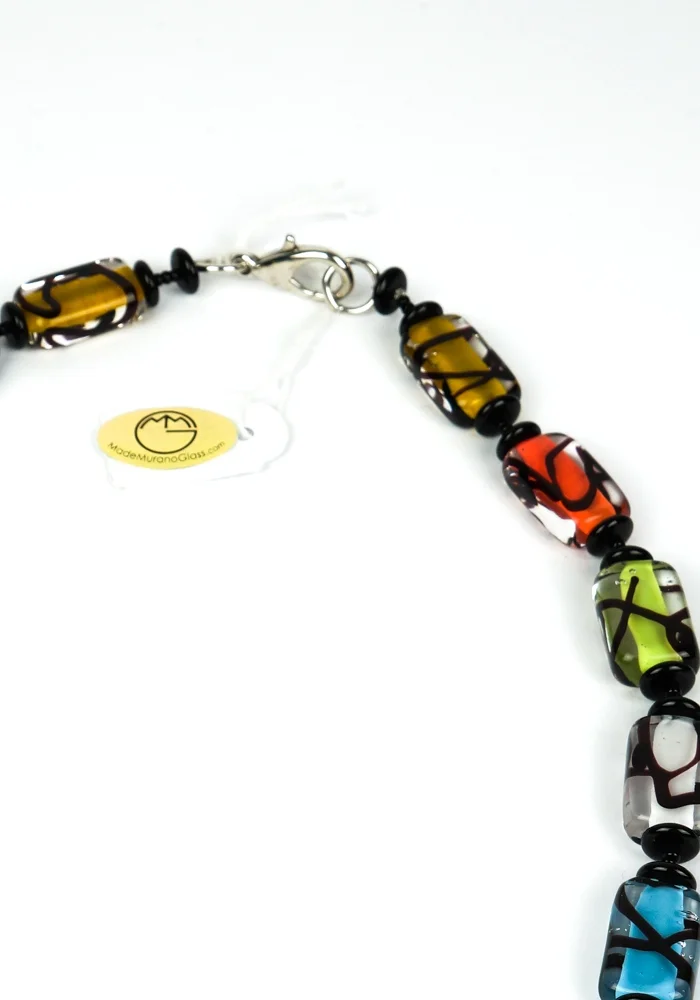 Exclusive Murano glass necklace made entirely by hand in green, white, light blue, amber, red with decorations in black drippings.