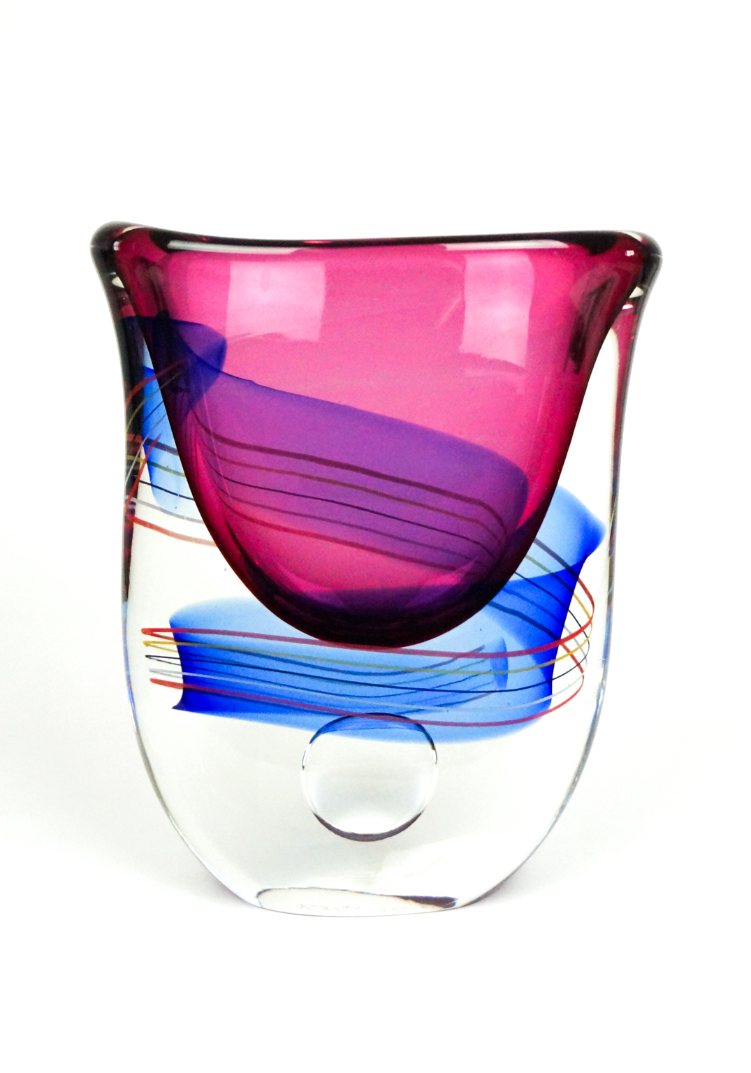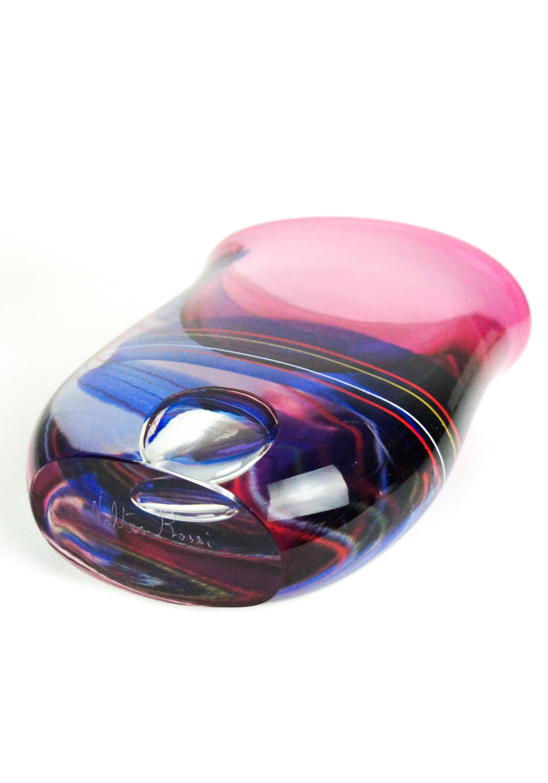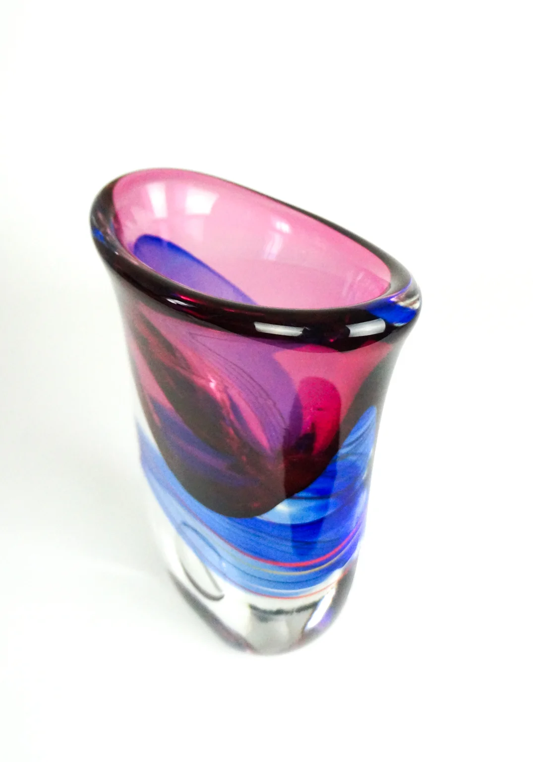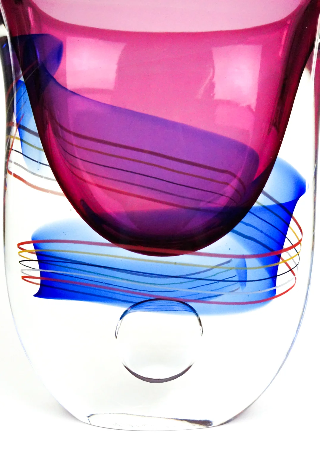 Exclusive Murano blown glass vase entirely handmade in thick, transparent crystal, ruby, blue color with colored filigree threads.