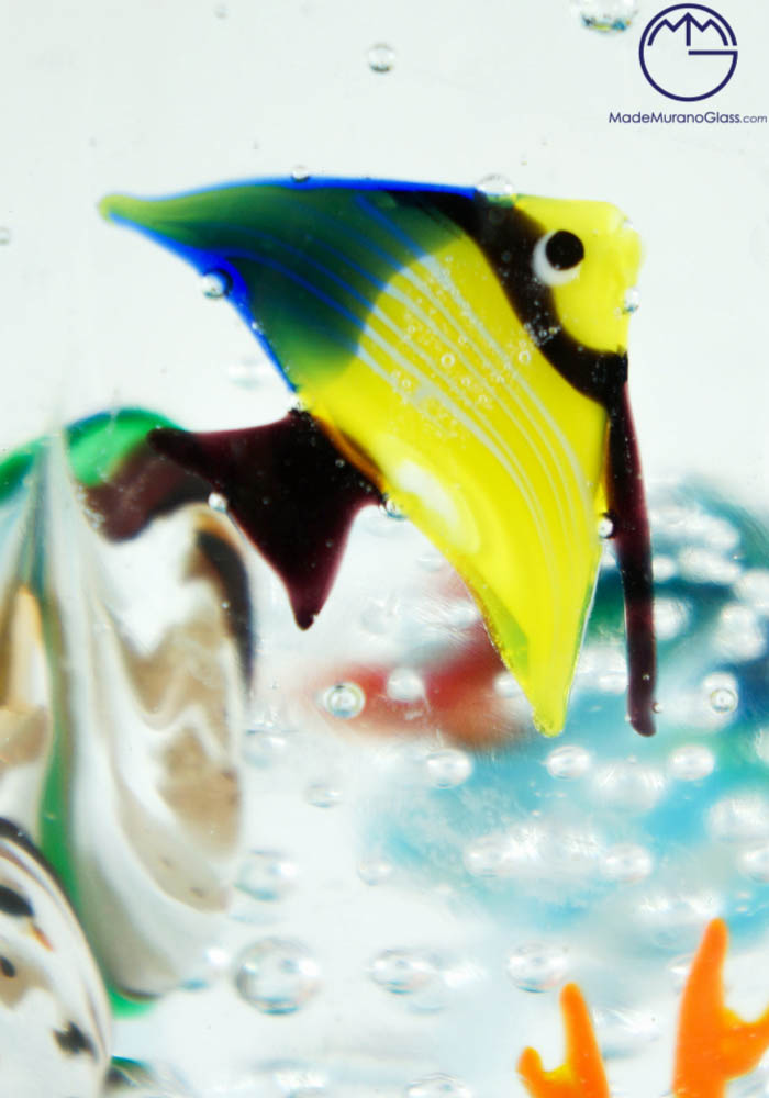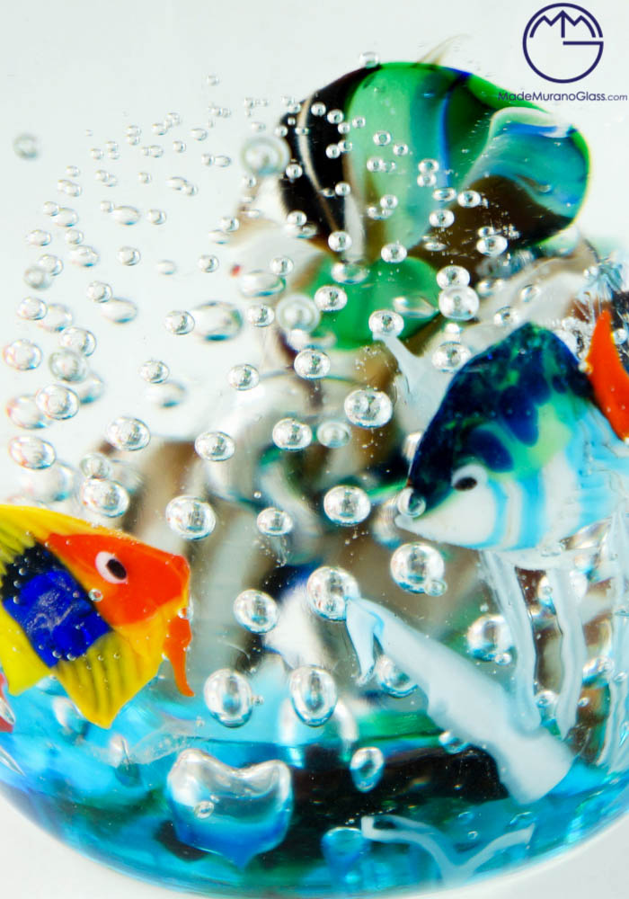 Magnificent Murano glass aquarium with jellyfish. To perform this amazing work Murano artisans use two different techniques: “lume” and “sommerso” working. The fist is used to produce Murano glass fish and the second is used to cover the fish. This work, produced in venetian glass, is signed by Master Murano artisans who make it unique and inimitable.