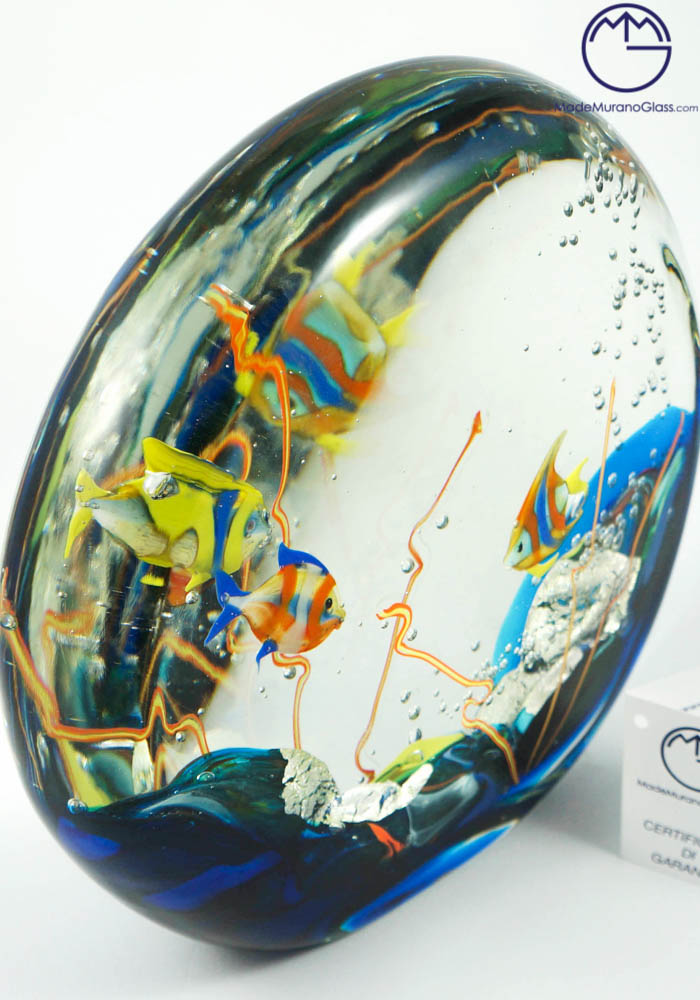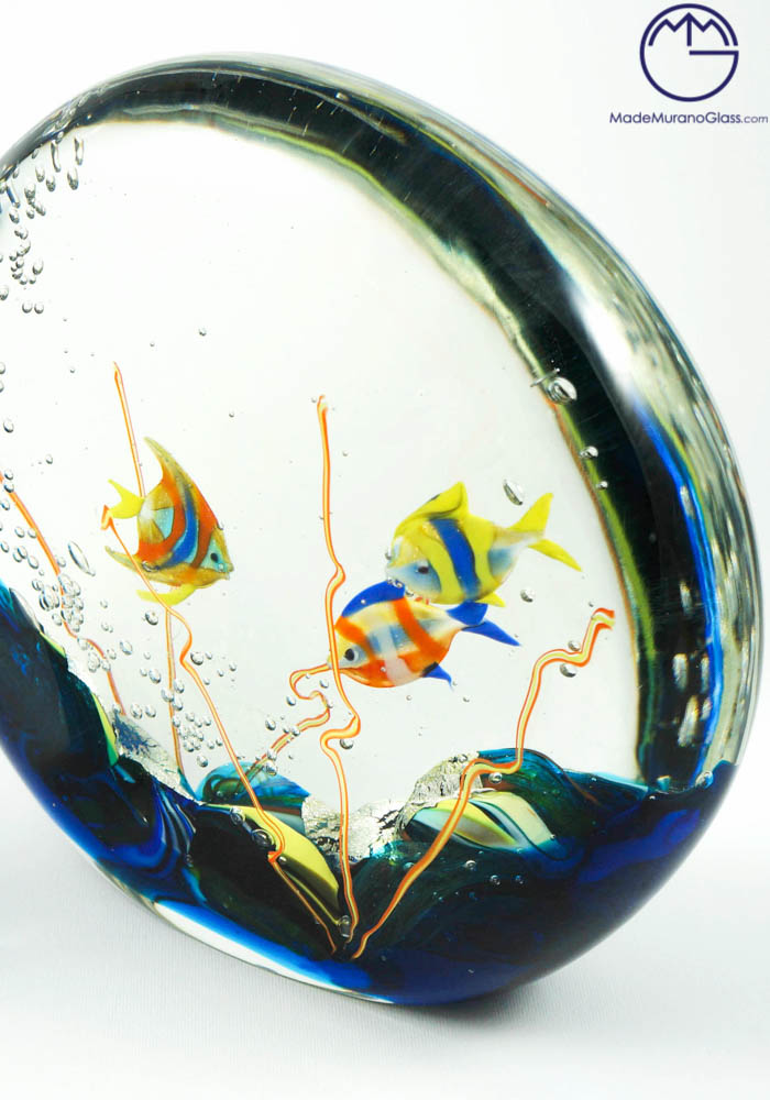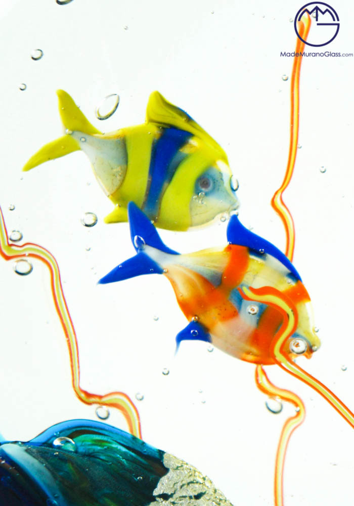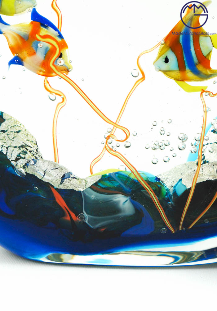 Magnificent Murano glass aquarium with jellyfish. To perform this amazing work Murano artisans use two different techniques: “lume” and “sommerso” working. The fist is used to produce Murano glass fish and the second is used to cover the fish. This work, produced in venetian glass, is signed by Master Murano artisan (Alberto Donà) who make it unique and inimitable.
