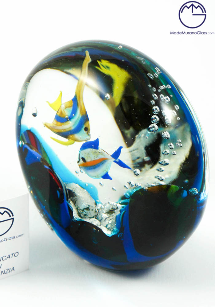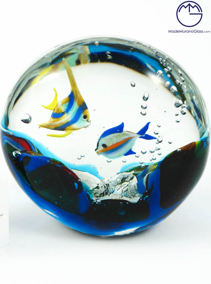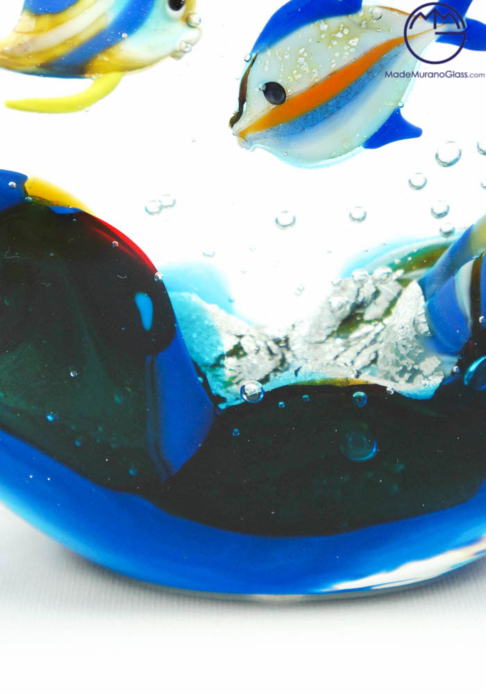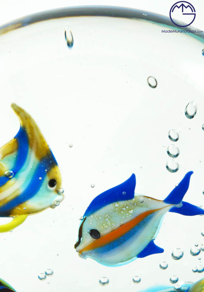 Magnificent Murano glass aquarium with jellyfish. To perform this amazing work Murano artisans use two different techniques: “lume” and “sommerso” working. The fist is used to produce Murano glass fish and the second is used to cover the fish. This work, produced in venetian glass, is signed by Master Murano artisan (Alberto Donà) who make it unique and inimitable.