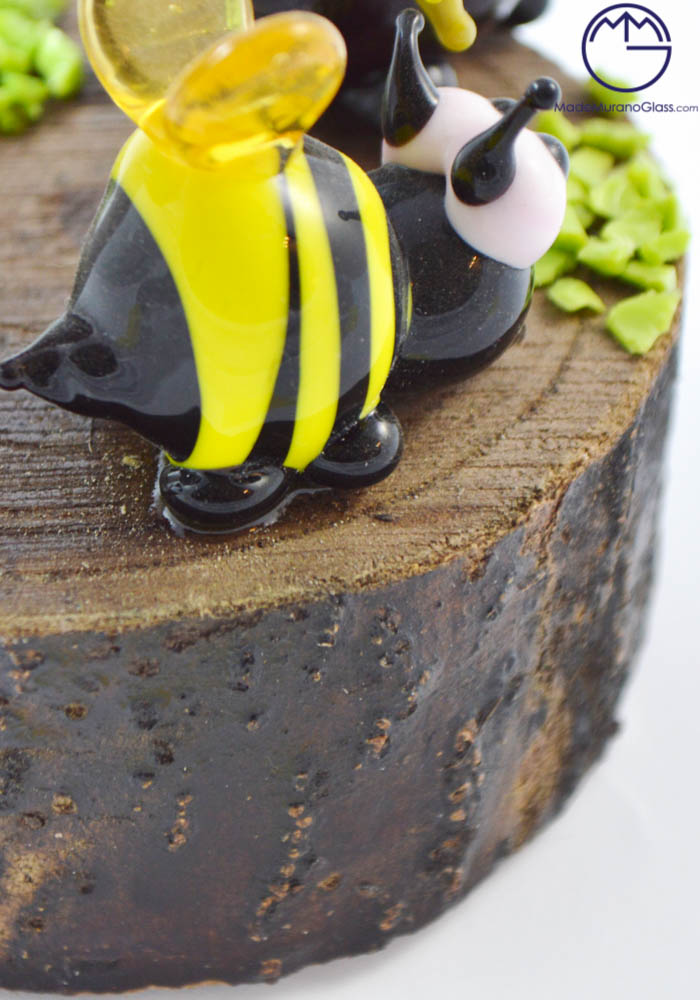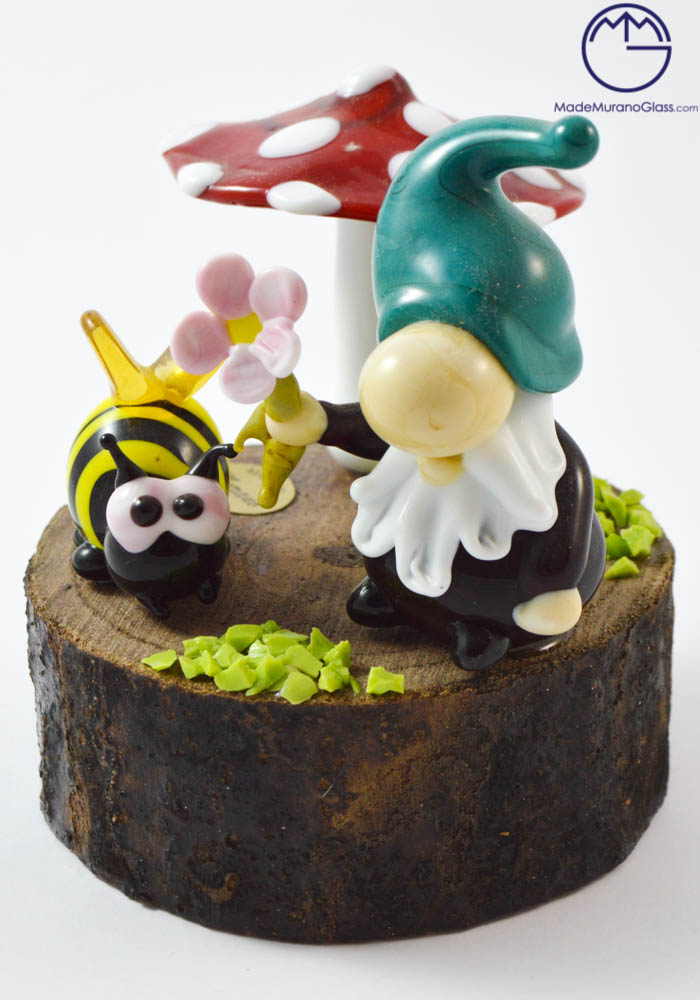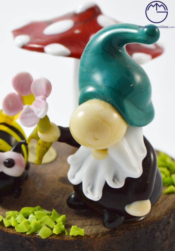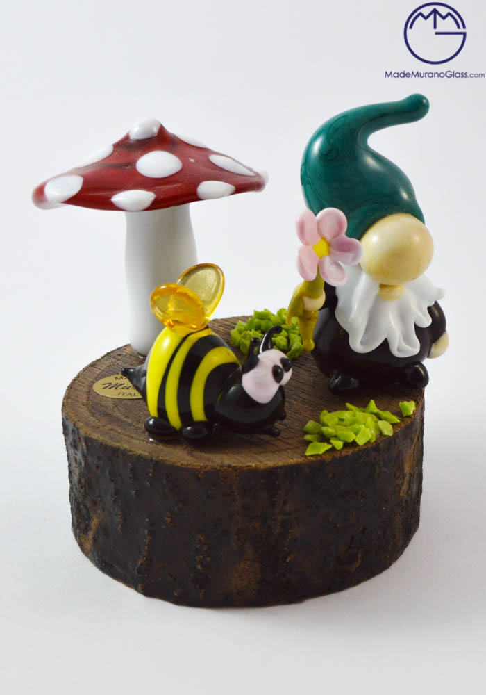 Exclusive Murano glass objects completely handcrafted in the best venetian glass factory with “lume” processing. This work point out Murano artisans skills. The gnome, mushroom and bee are specially glued to a piece of wood.