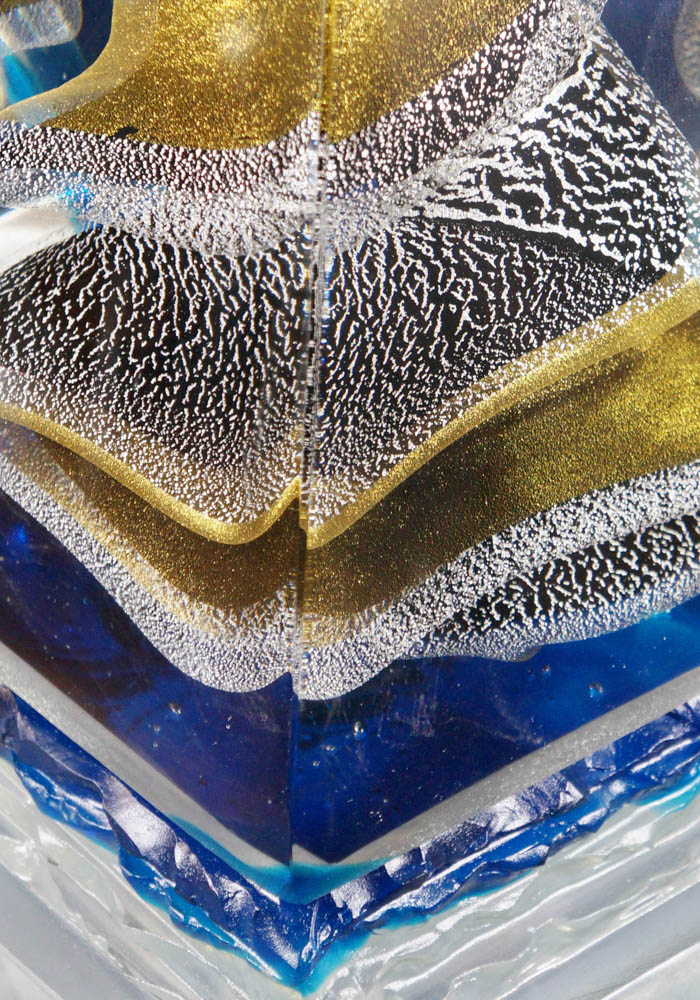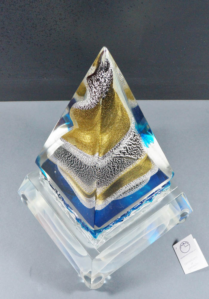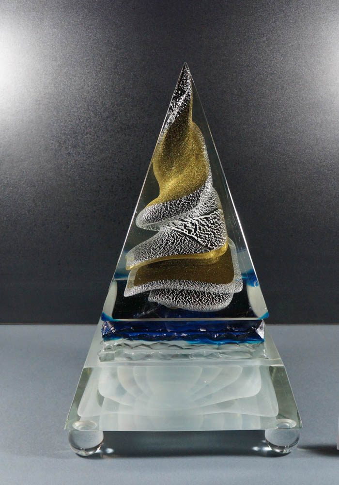 To carry out this fantastic pyramid in Murano glass is necessary to use two different working techniques: shaping the Murano glass in order to create shape and colours and after make it polished. Turning the work at various angles you can see the vortex effect made from silver leaf and avventurine. Master Murano artisans Alberto DonĂ sign the work making it unique and inimitable.