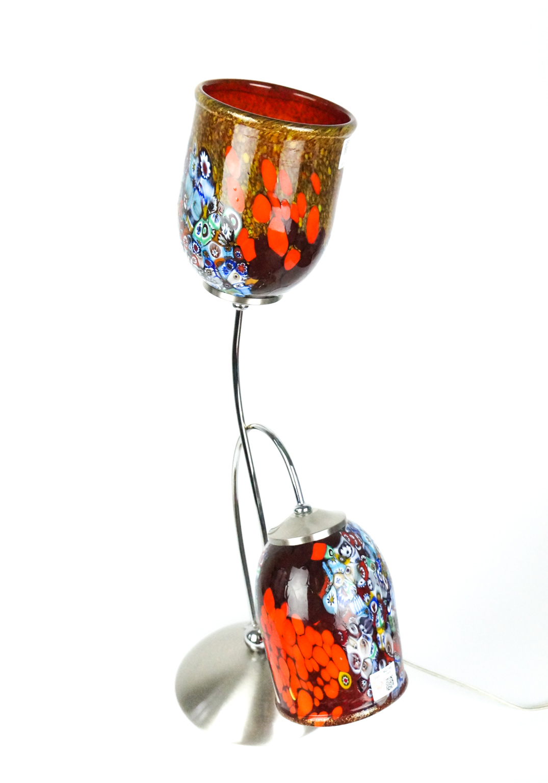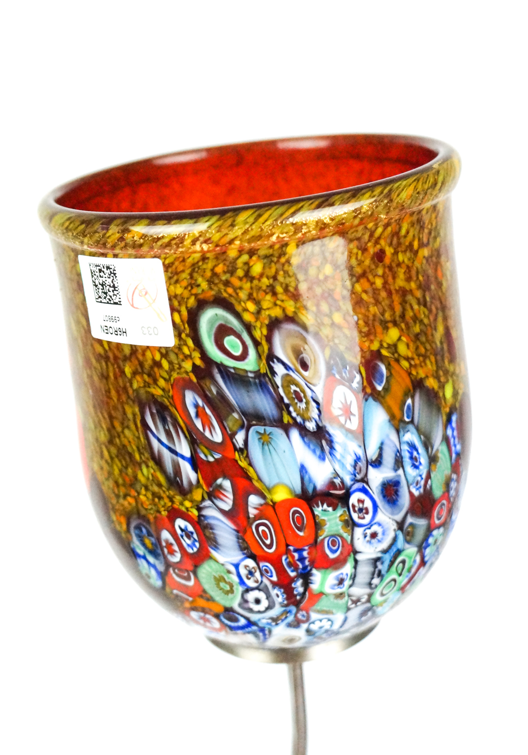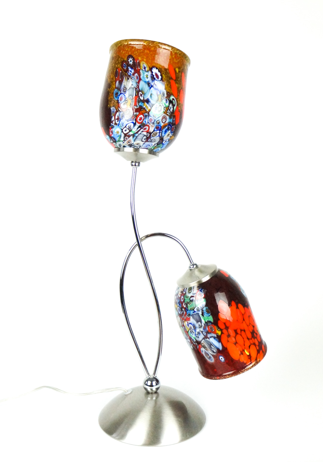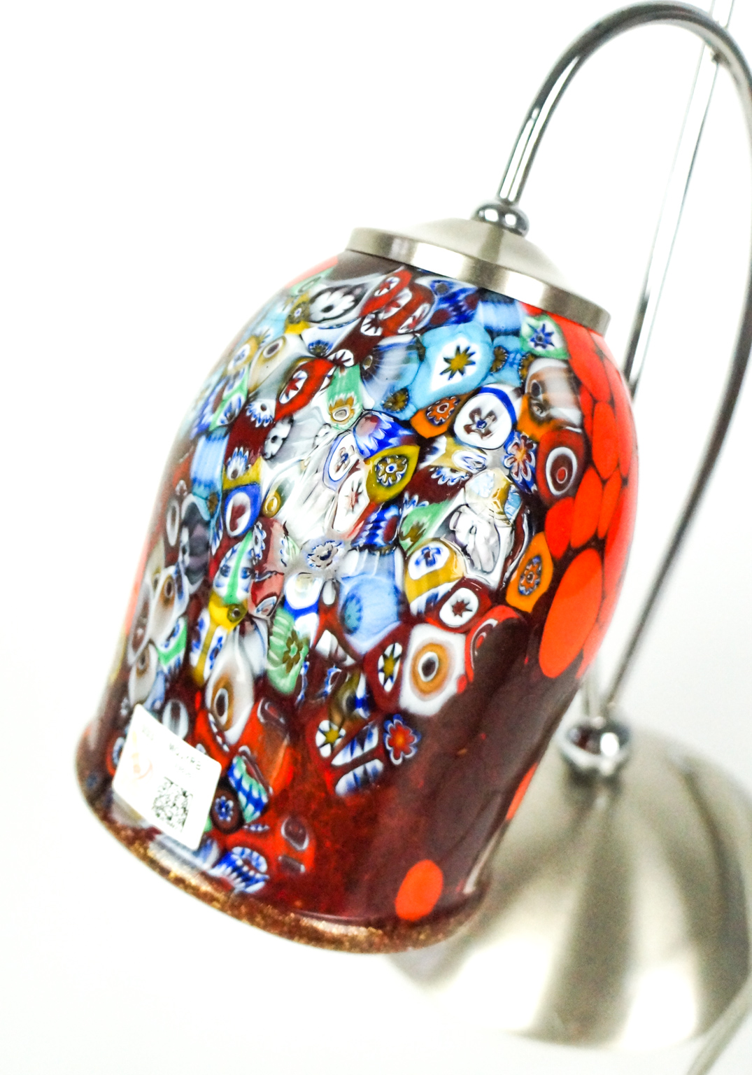 Table lamp with 2 lights in blown Murano glass entirely handmade in red color with Millefiori murrina decoration and multicolored glass flakes.