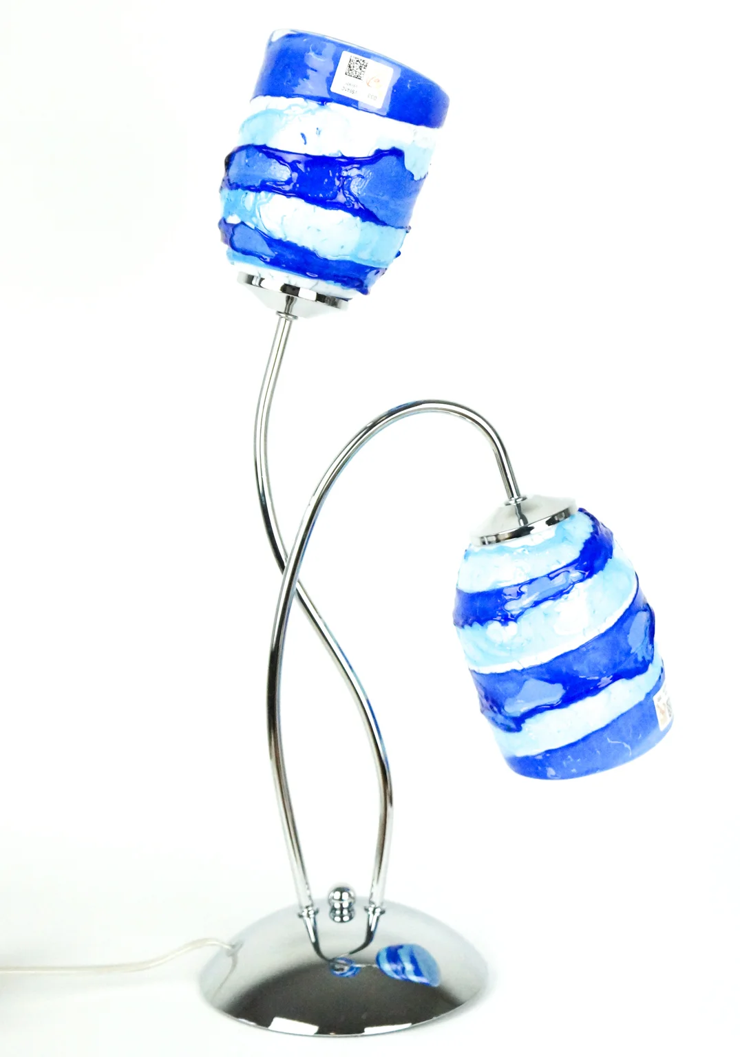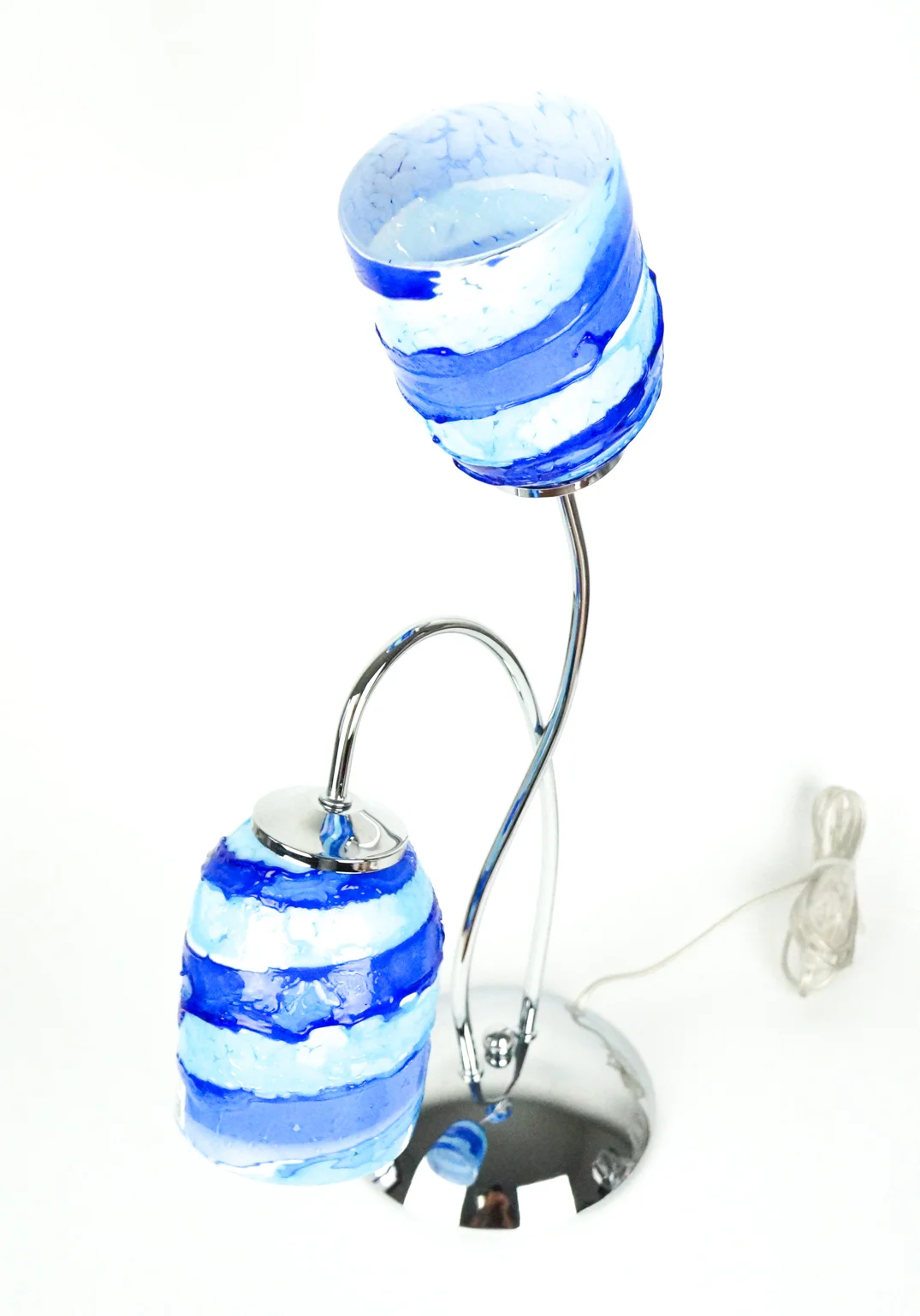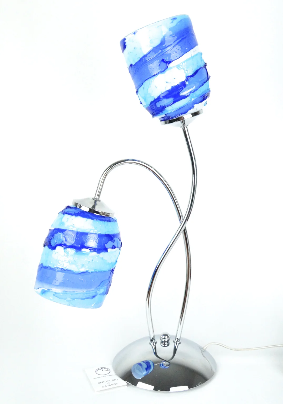 Table lamp with 2 lights in Murano blown glass entirely handmade with Sruffo (relief glass pouring) blue, aquamarine and white interior.