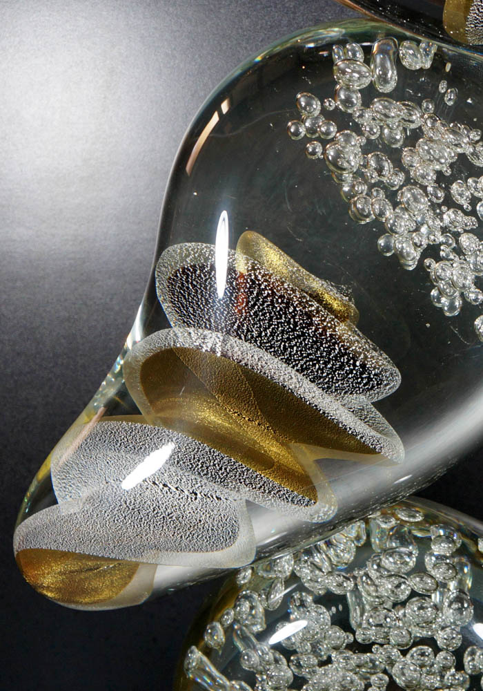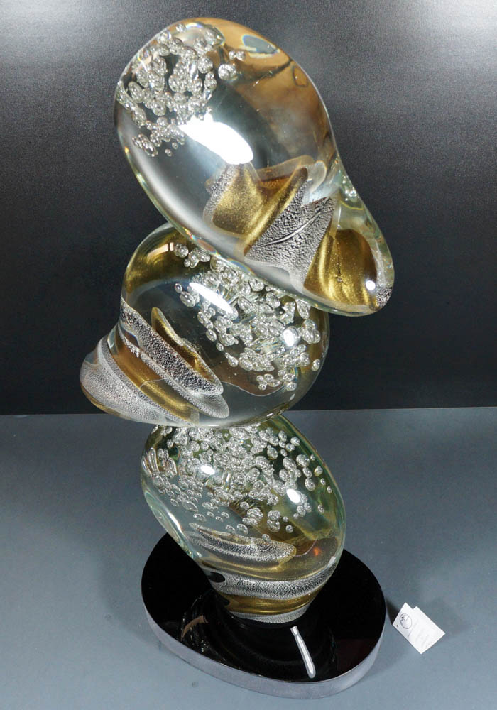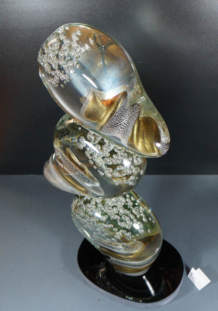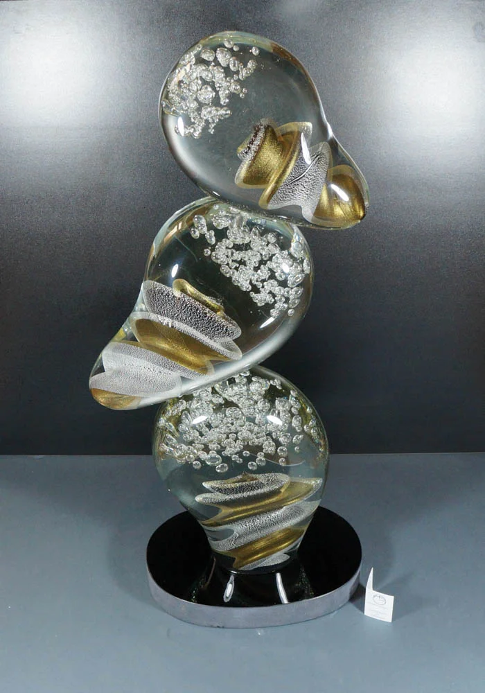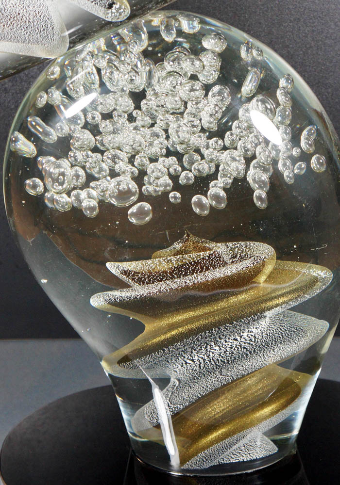 To carry out this fantastic sculpture in Murano glass is necessary to use two different working techniques: shaping the Murano glass in order to create shape and colours and after make it polished. Turning the work at various angles you can see the vortex effect made from silver leaf mixed with avventurina and with bubbles in Murano crystals. Master Murano artisans (Alberto Donà) sign the work making it unique and inimitable.