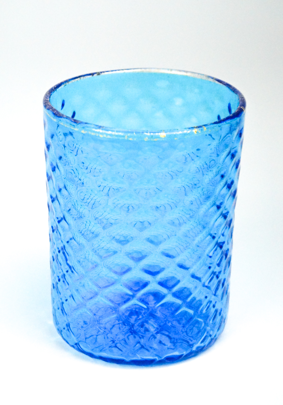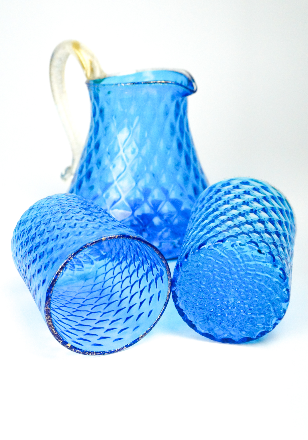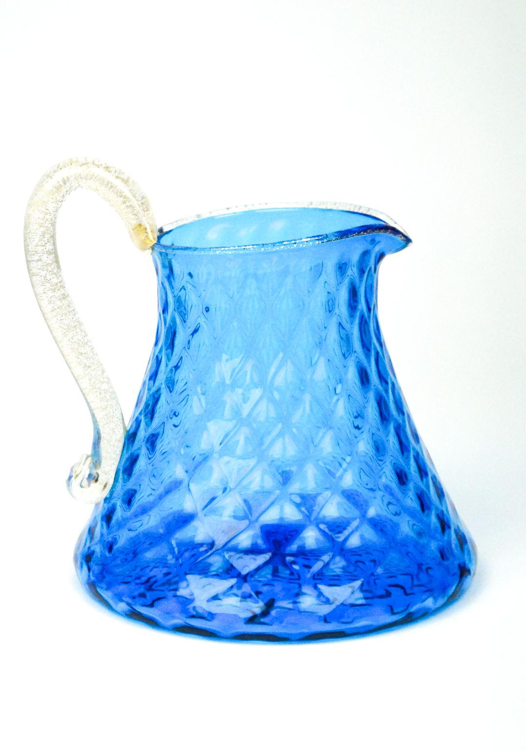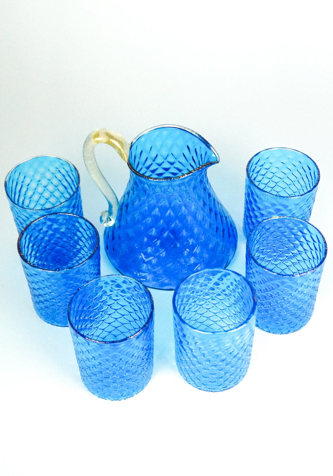 Nabucco is a Set composed of 6 drinking glasses for water or wine with Jug in Murano glass entirely handmade in light blue color with 24k gold leaf details.