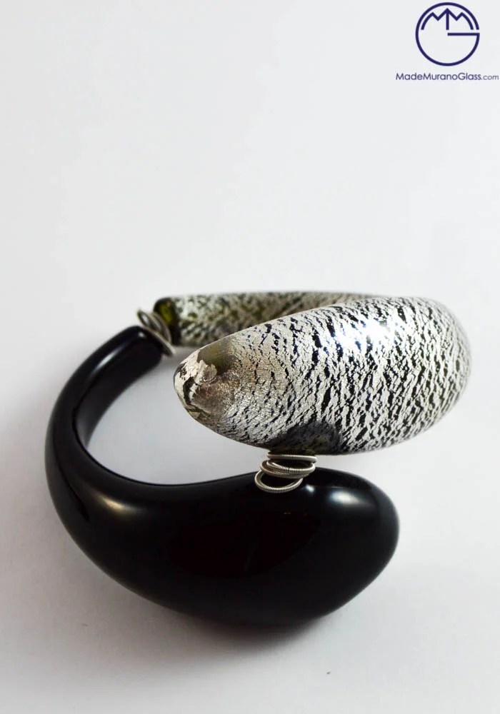 Magnificent necklace and bracelet in Murano glass with two drops colours black and silver leaf. Handmade and produced by Murano artisans (De Mio) with ancient “lume” technique.