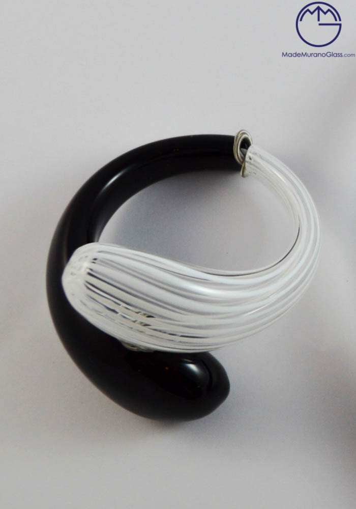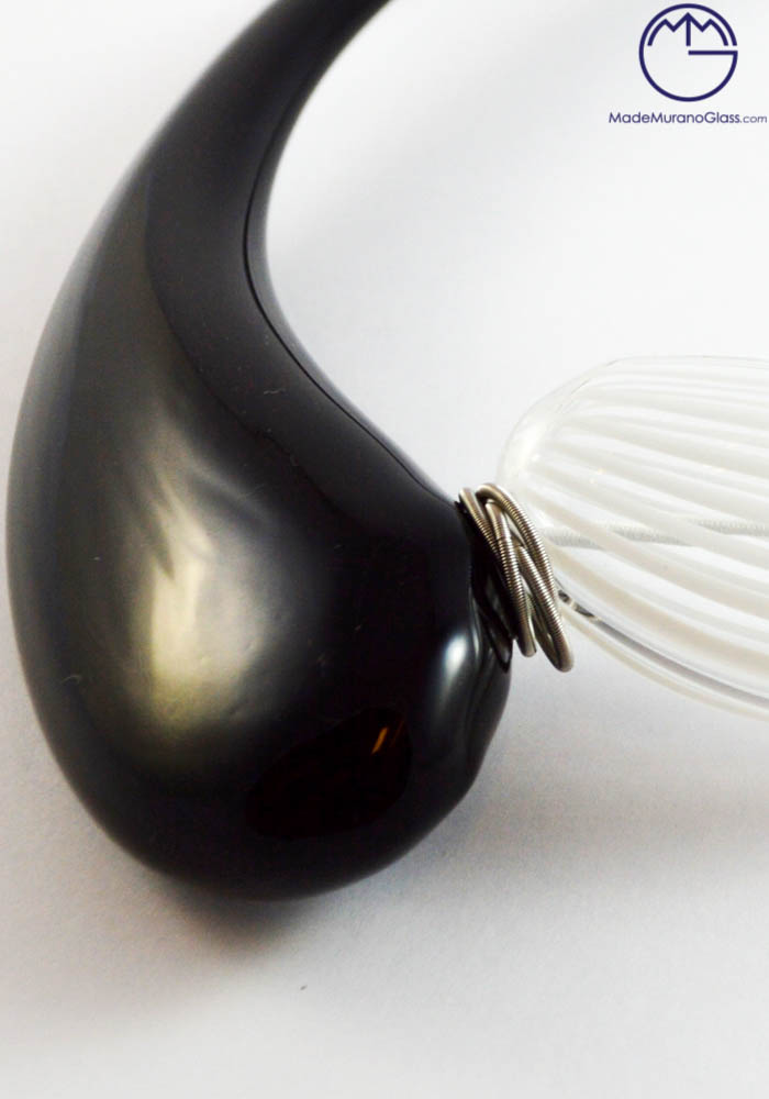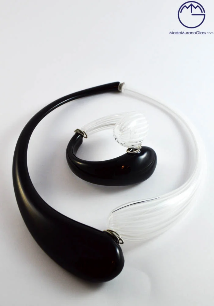 Magnificent necklace and bracelet in venetian blown glass with two drops colour black and white “filigrana”. Handmade and produced by Murano artisans (De Mio) with ancient “lume” technique. The necklace’s measures are adaptable to any neck (thanks to a rubber band inside). The necklace and bracelet is very light.