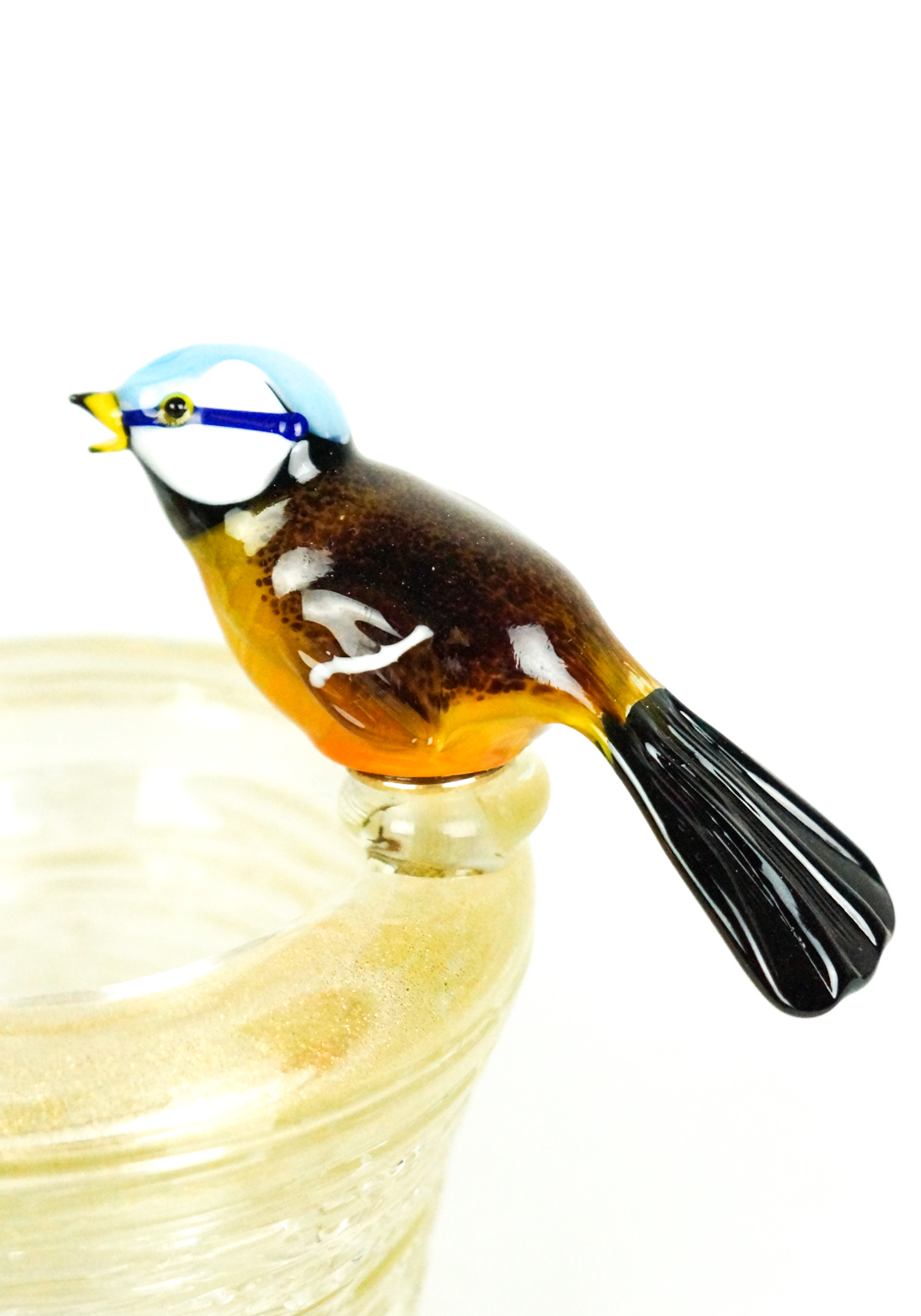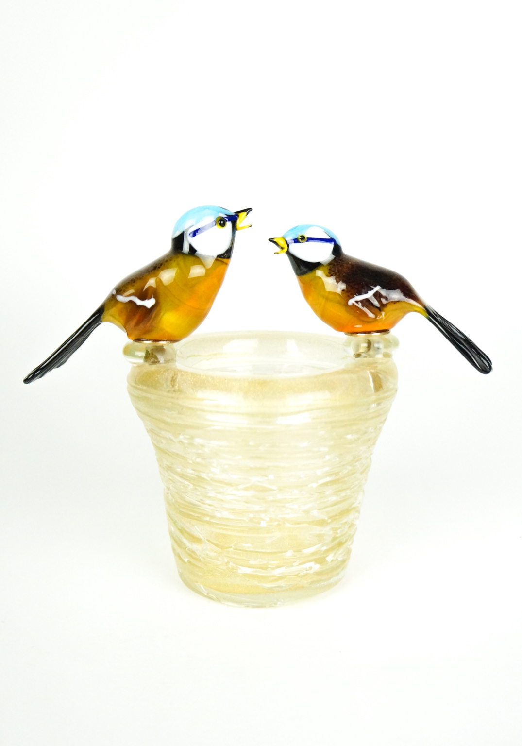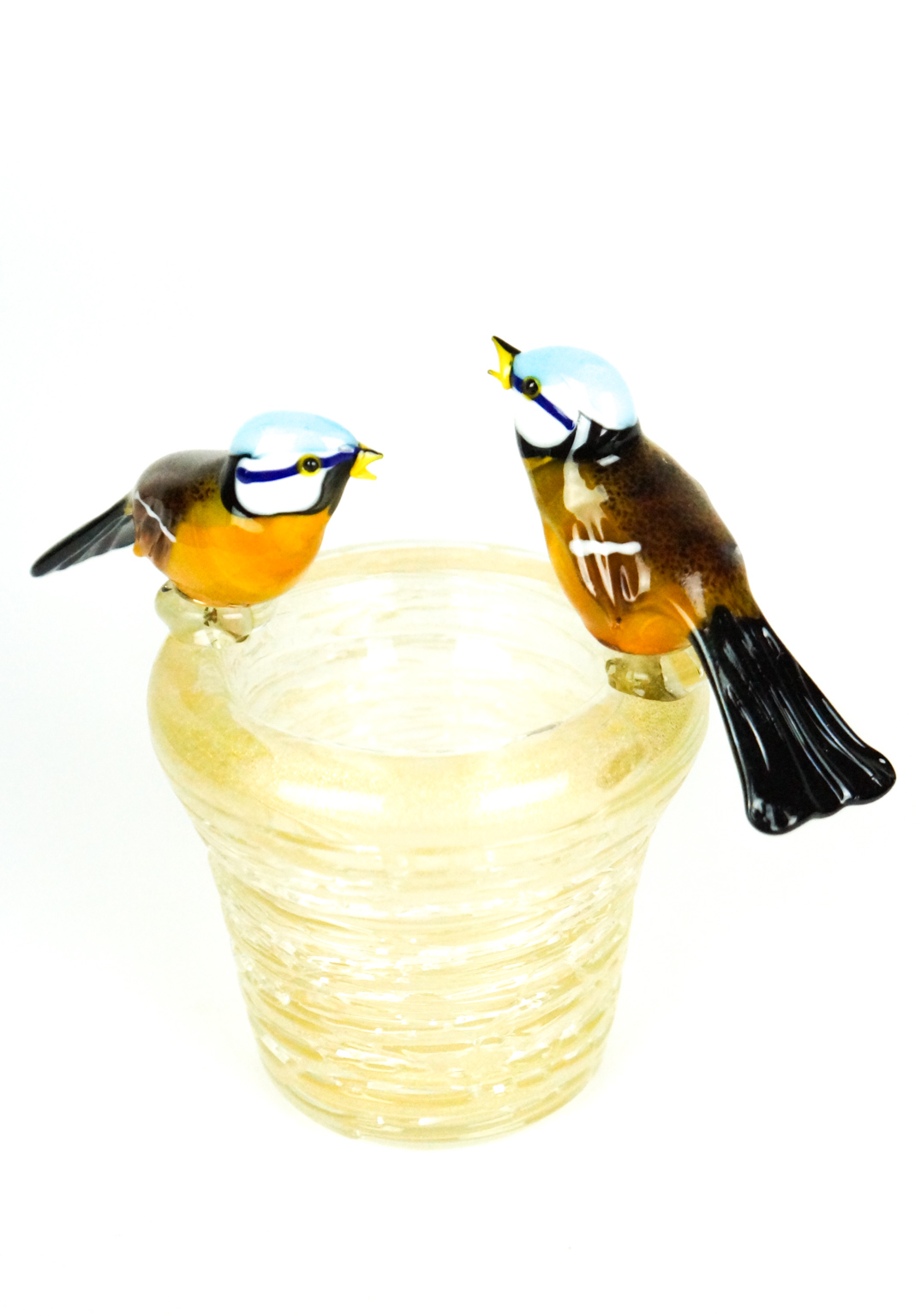 Nest with 2 birds, Gardellini, in multicolor Murano glass and silver leaf with nest in real 24kt gold leaf. To perform this fantastic work, two Murano glass processing techniques are needed: the nest is made with the blown glass technique. Birds are made with the Lume technique. Sculpture that can be used as a centerpiece. Work signed on the bottom