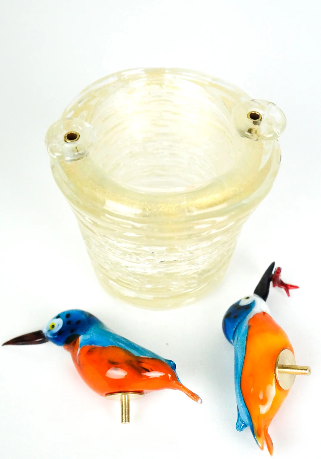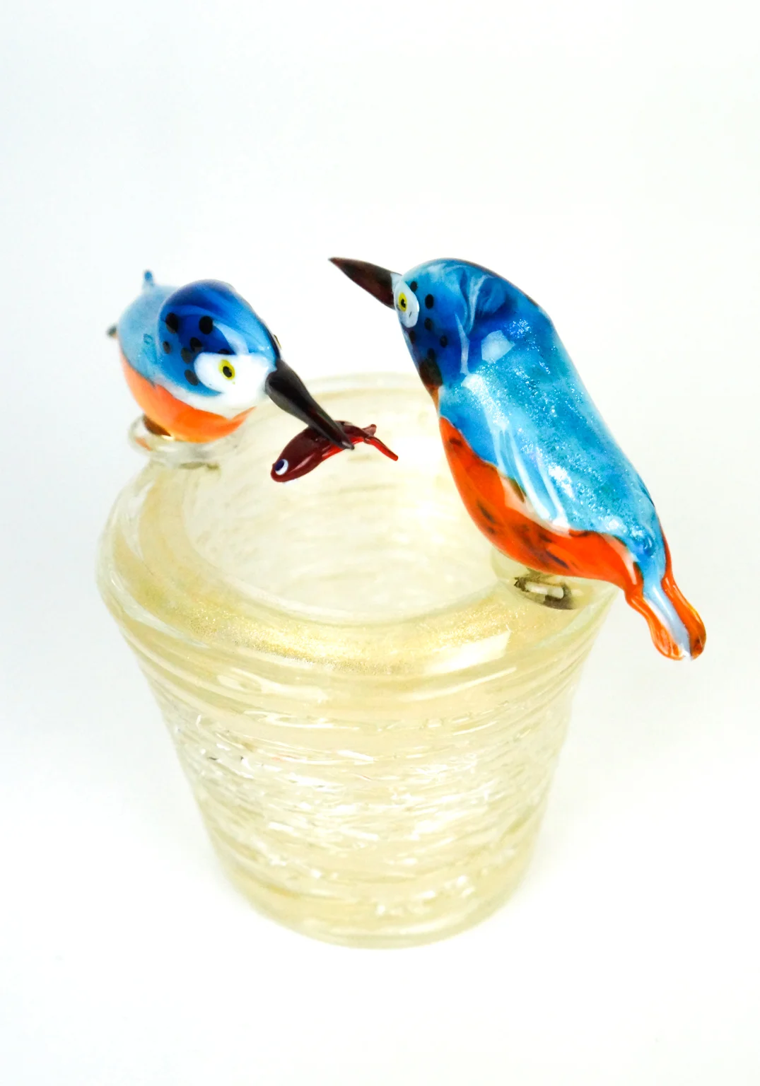 Nest with 2 birds, Kingfisher, in multicolor Murano glass and silver leaf with nest in real 24kt gold leaf. To perform this fantastic work, two Murano glass processing techniques are needed: the nest is made with the blown glass technique. Birds are made with the Lume technique. Sculpture that can be used as a centerpiece. Work signed on the bottom