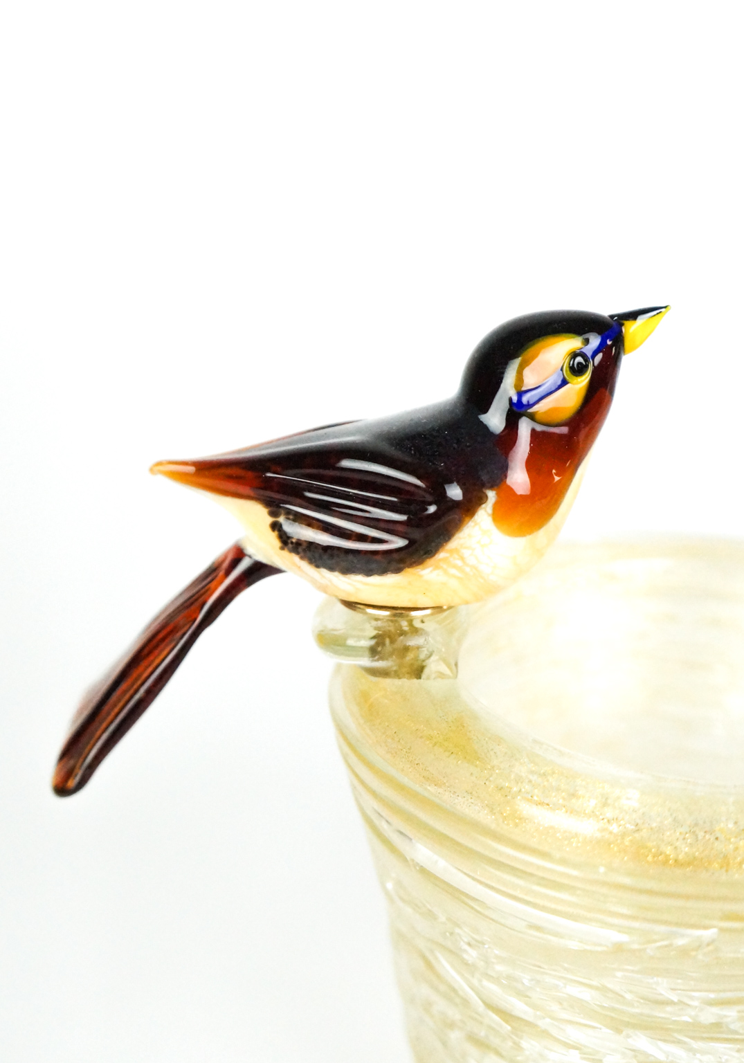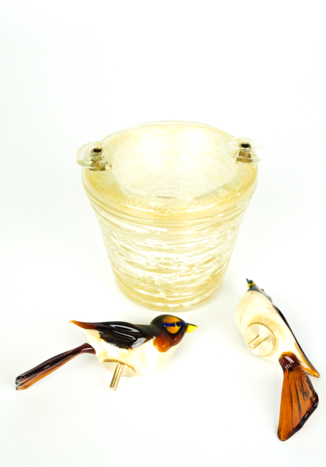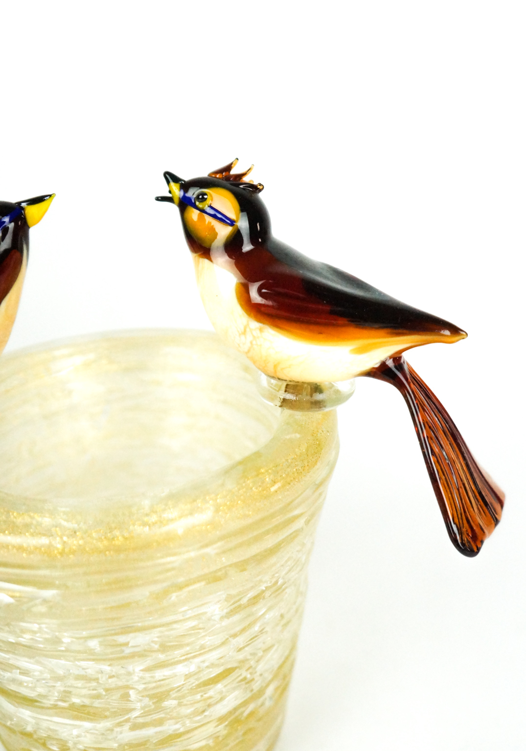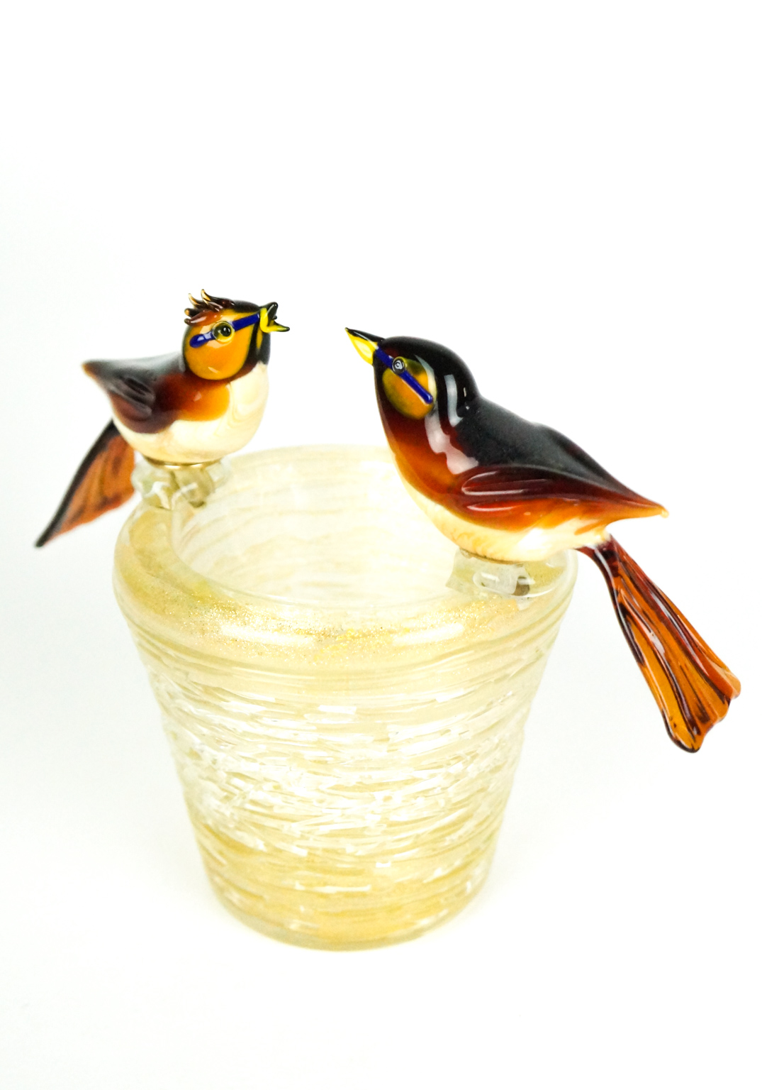 Nest with 2 birds in multicolor Murano glass with nest in real 24kt gold leaf. To perform this fantastic work, two Murano glass processing techniques are needed: the nest is made with the blown glass technique. Birds are made with the Lume technique. Sculpture that can be used as a centerpiece. Work signed on the bottom