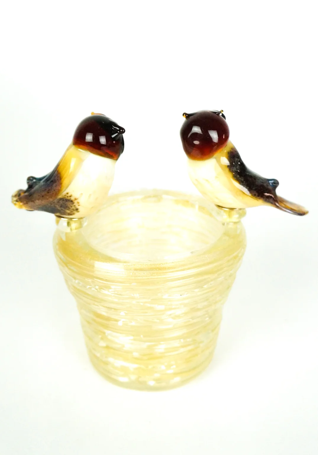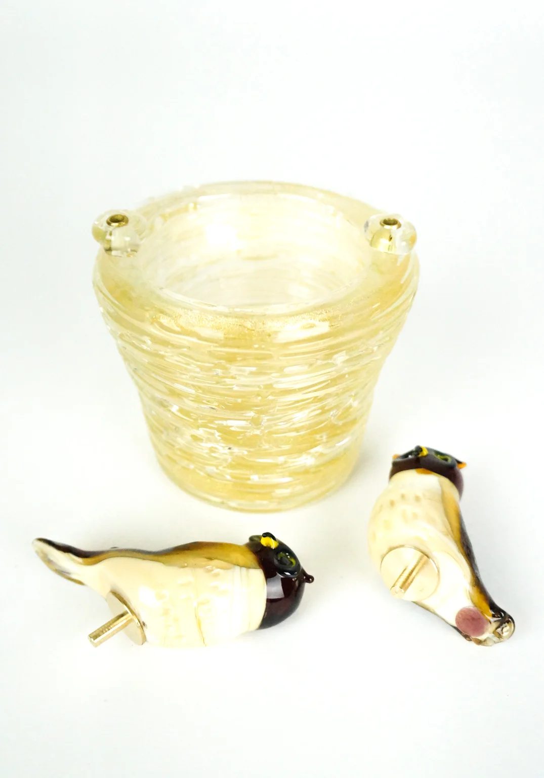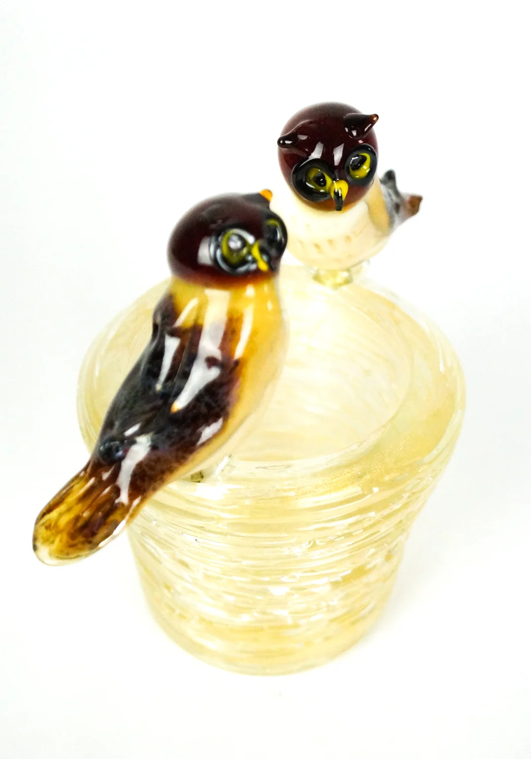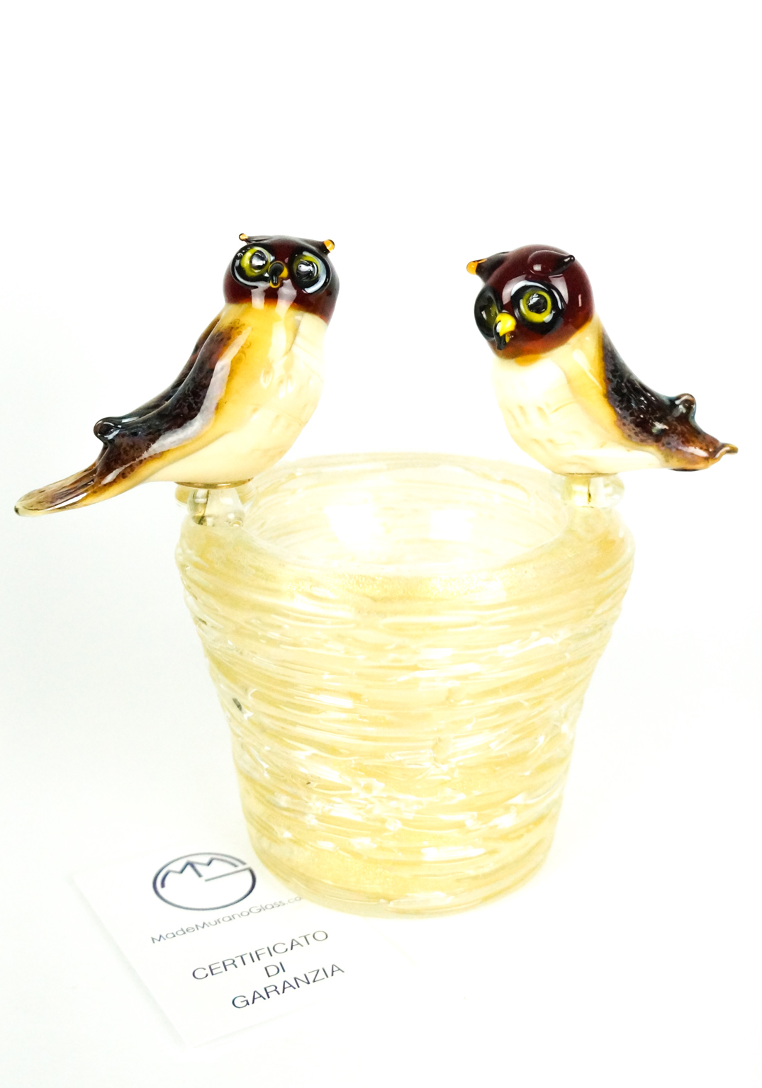 Nest with 2 Owls in multicolor Murano glass with nest in real 24kt gold leaf. To perform this fantastic work, two Murano glass processing techniques are needed: the nest is made with the blown glass technique. Birds are made with the Lume technique. Sculpture that can be used as a centerpiece. Work signed on the bottom