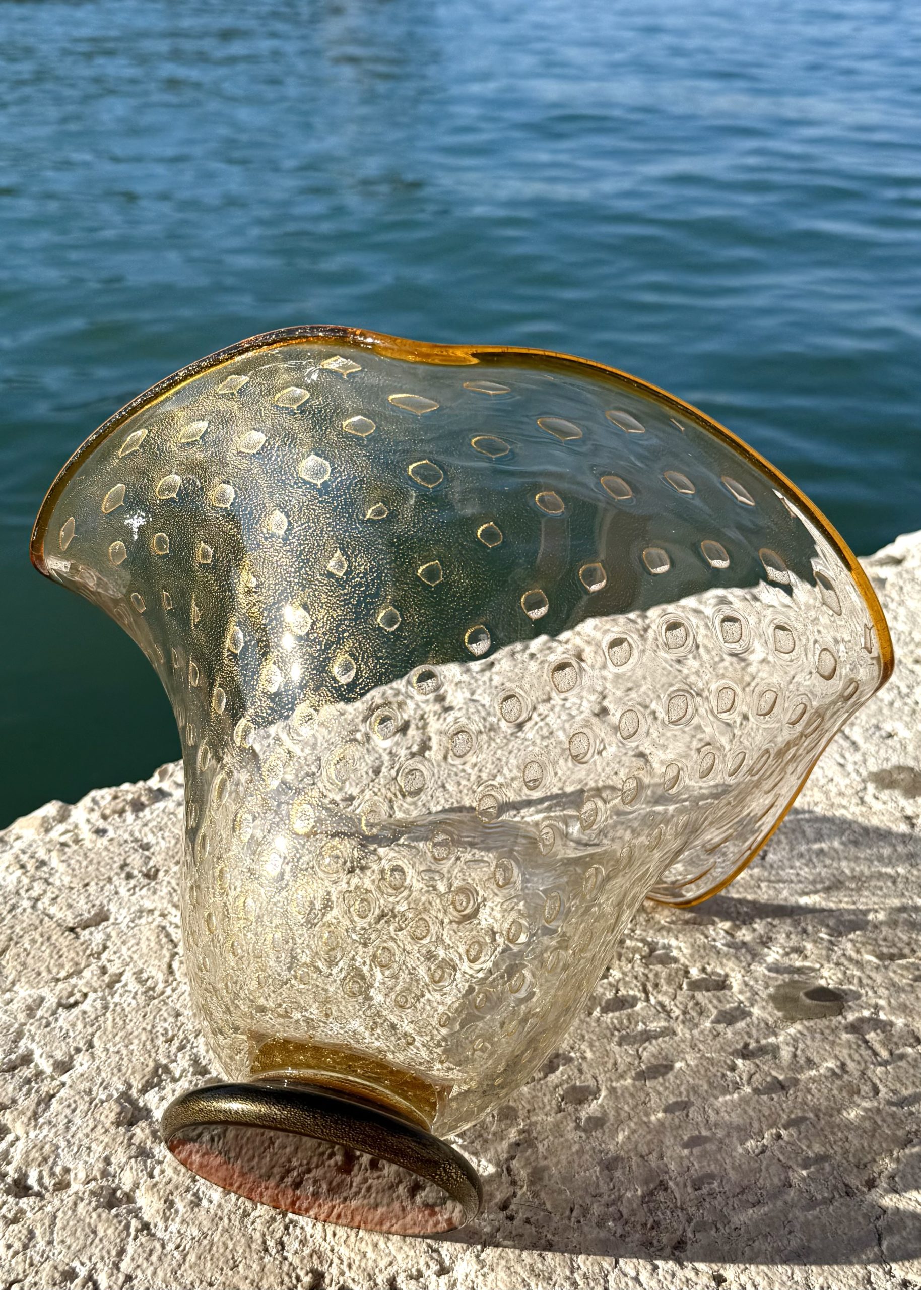 Murano glass centerpiece entirely covered in 24-karat gold leaf, made using the “Balloton” glass technique.