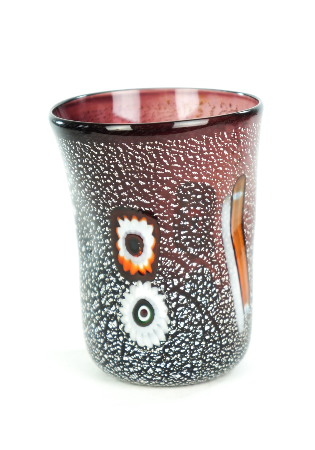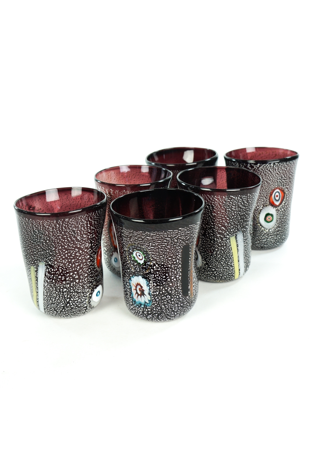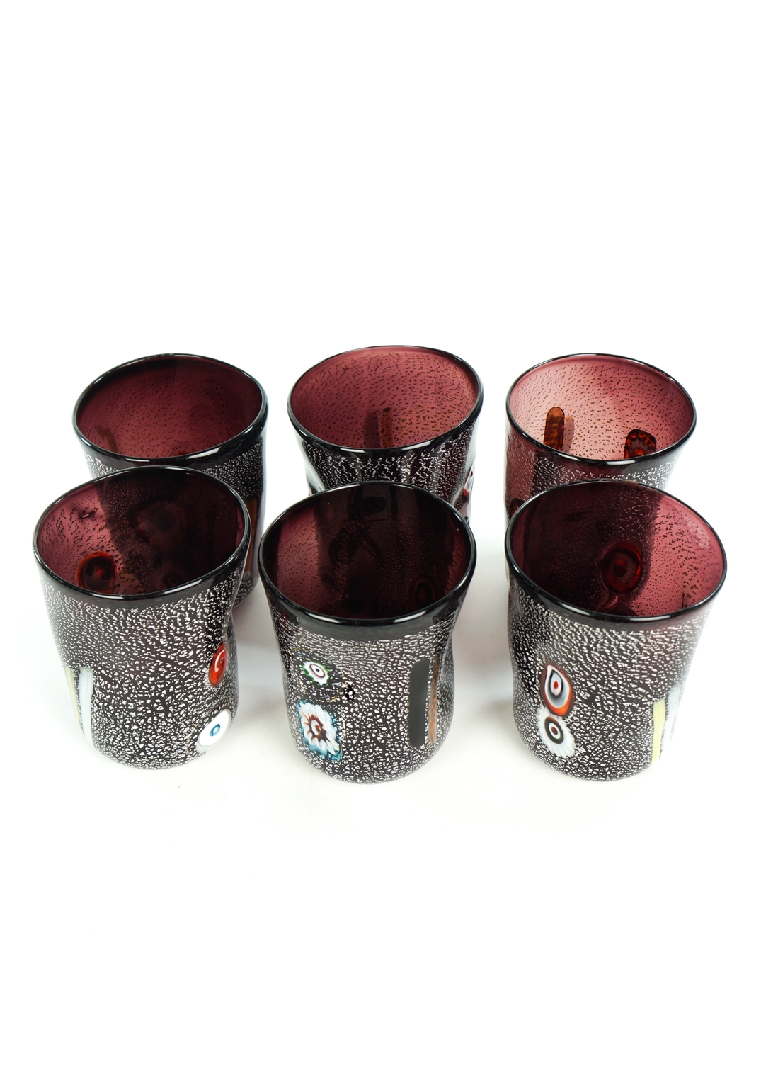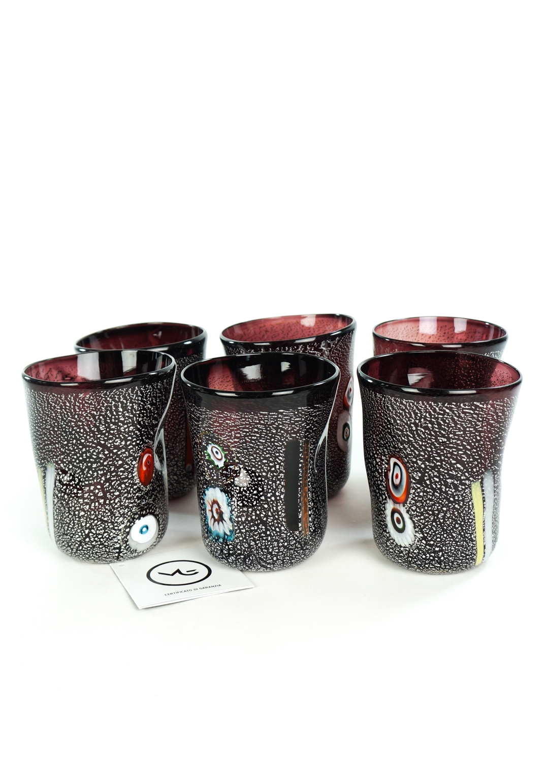 The set includes Six Murano Glass Tumblers with decoration in murrina Millefiori and real silver leaf.