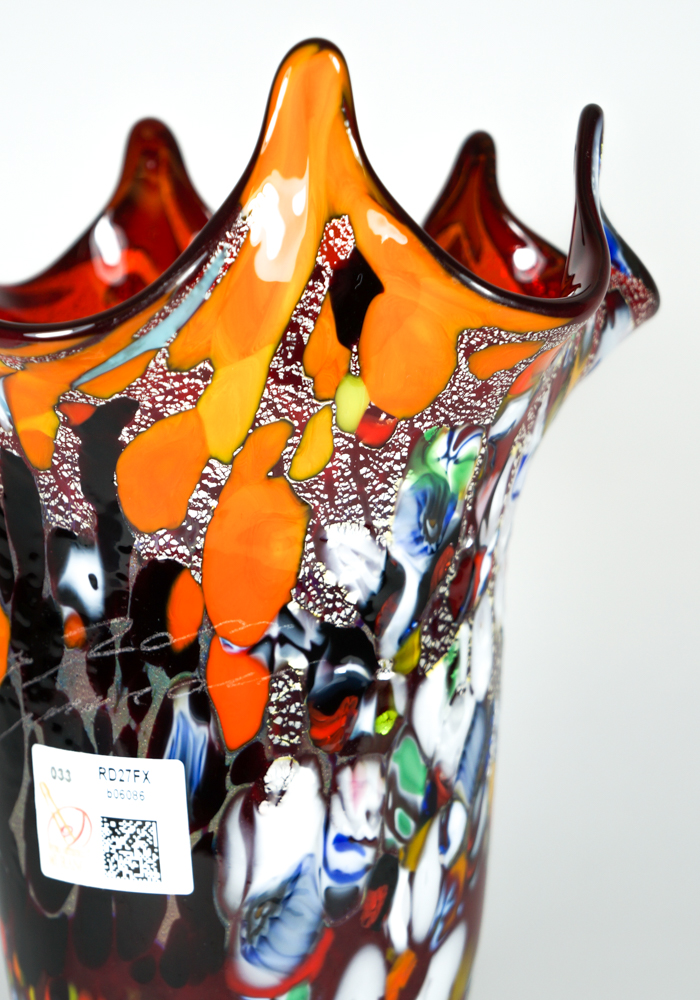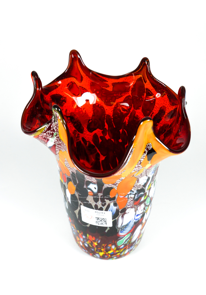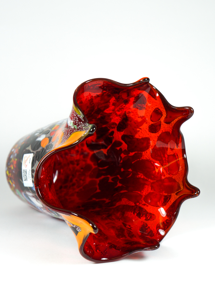 Venetian blown glass red vase with assorted filigree decorations, Millefiori, “Mace” and silver. “Mario Costantini” glassmaker Master mixes these colors in an ever different way, making the works so unique and inimitable. Vase signed with cold engraving as photos. The venetian glass vase has the label Marchio Vetro Artistico®.