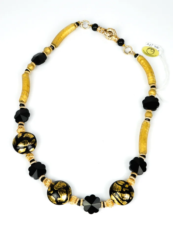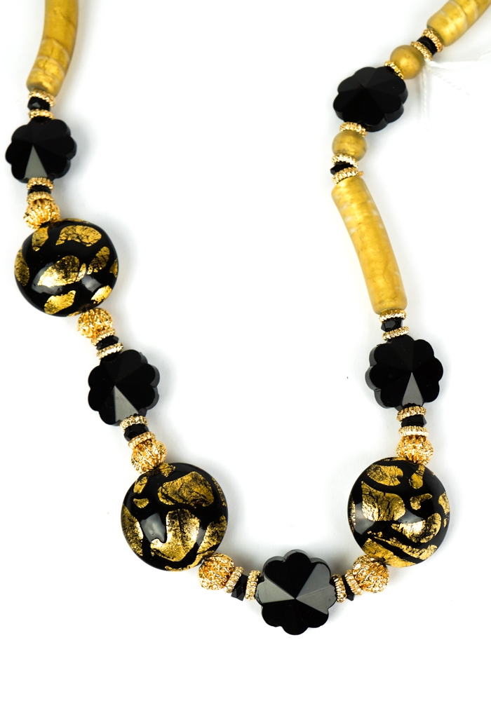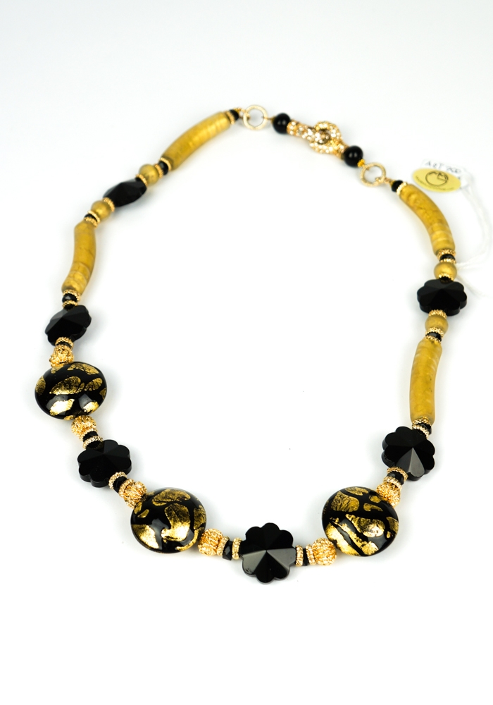 The pearls of this fantastic jewel in Murano blown glass have different shapes, assorted colors and processing in gold leaf 24k and aventurine.