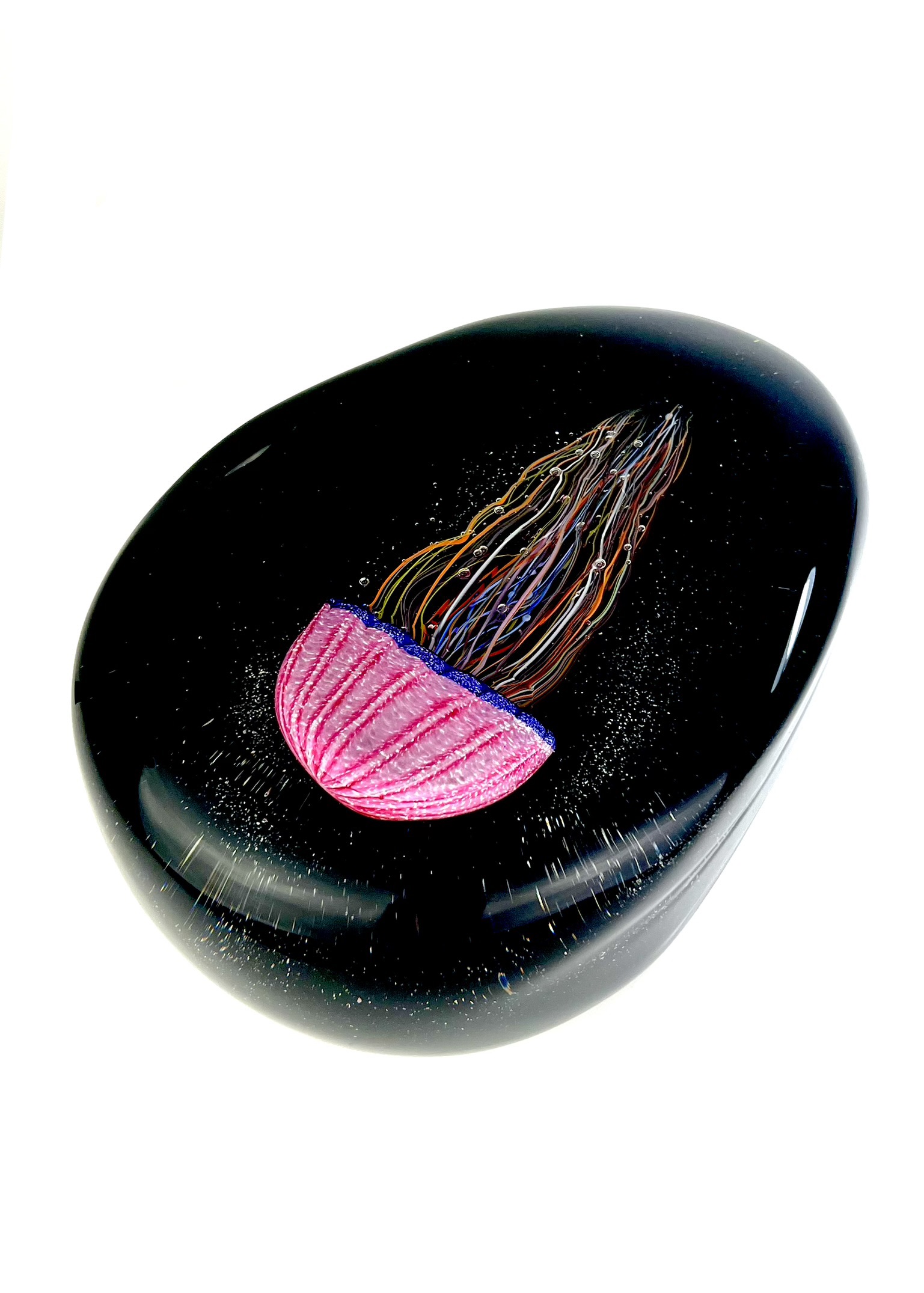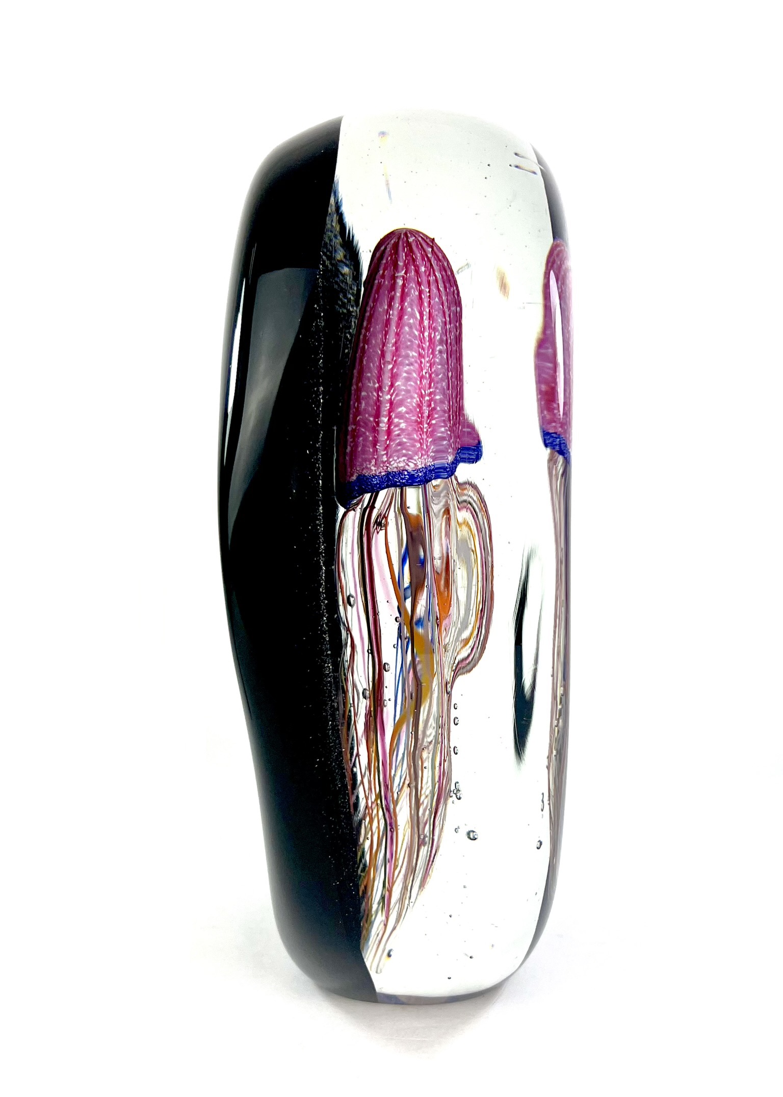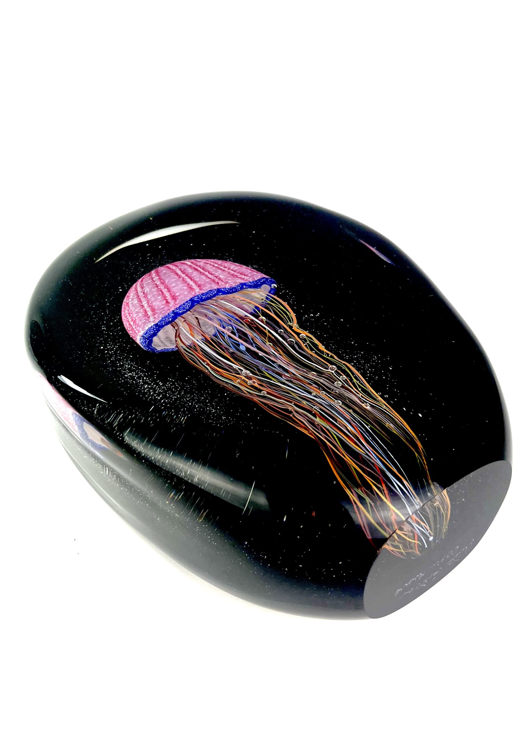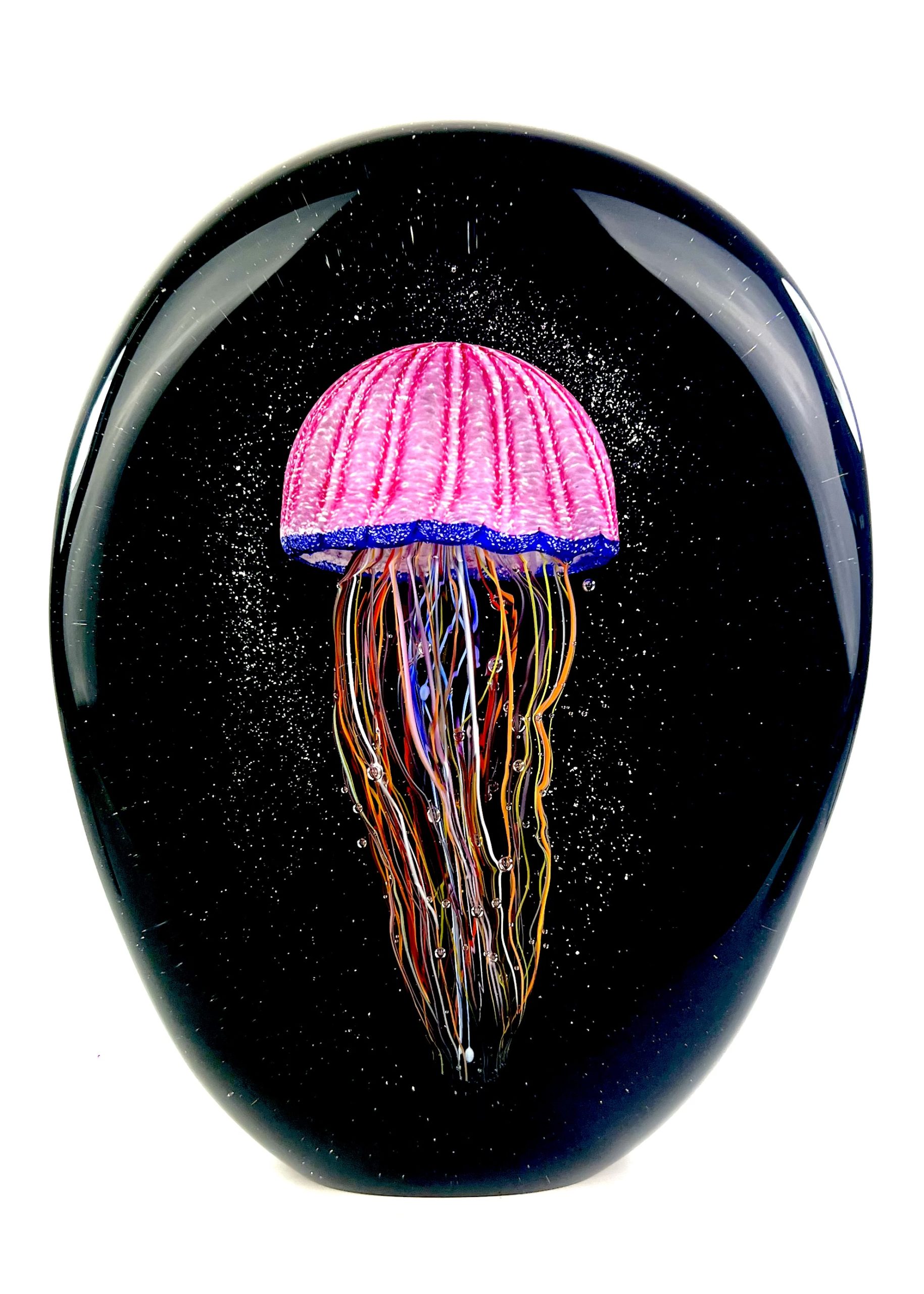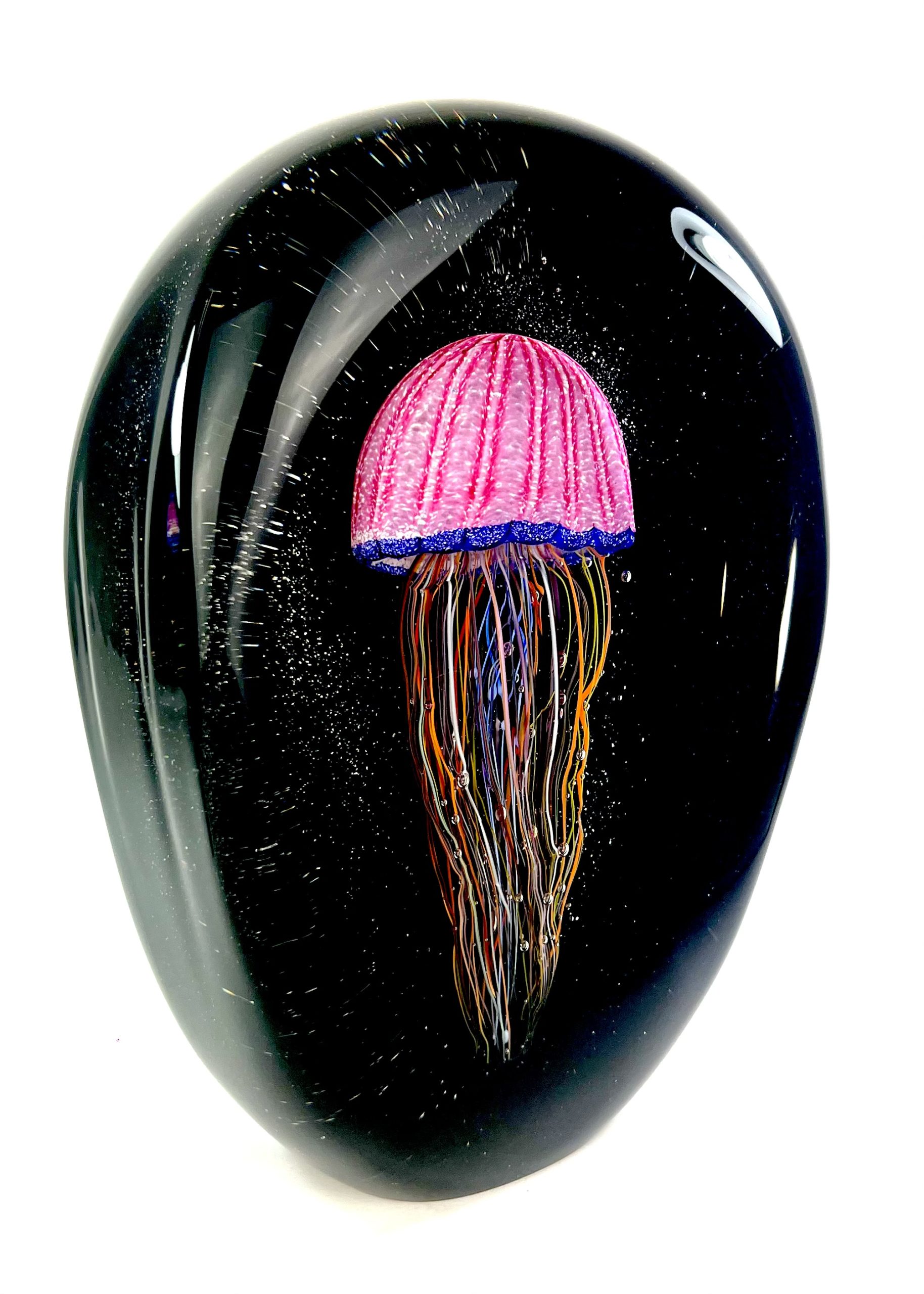 Oval sommerso Murano glass sculpture with pink jellyfish.