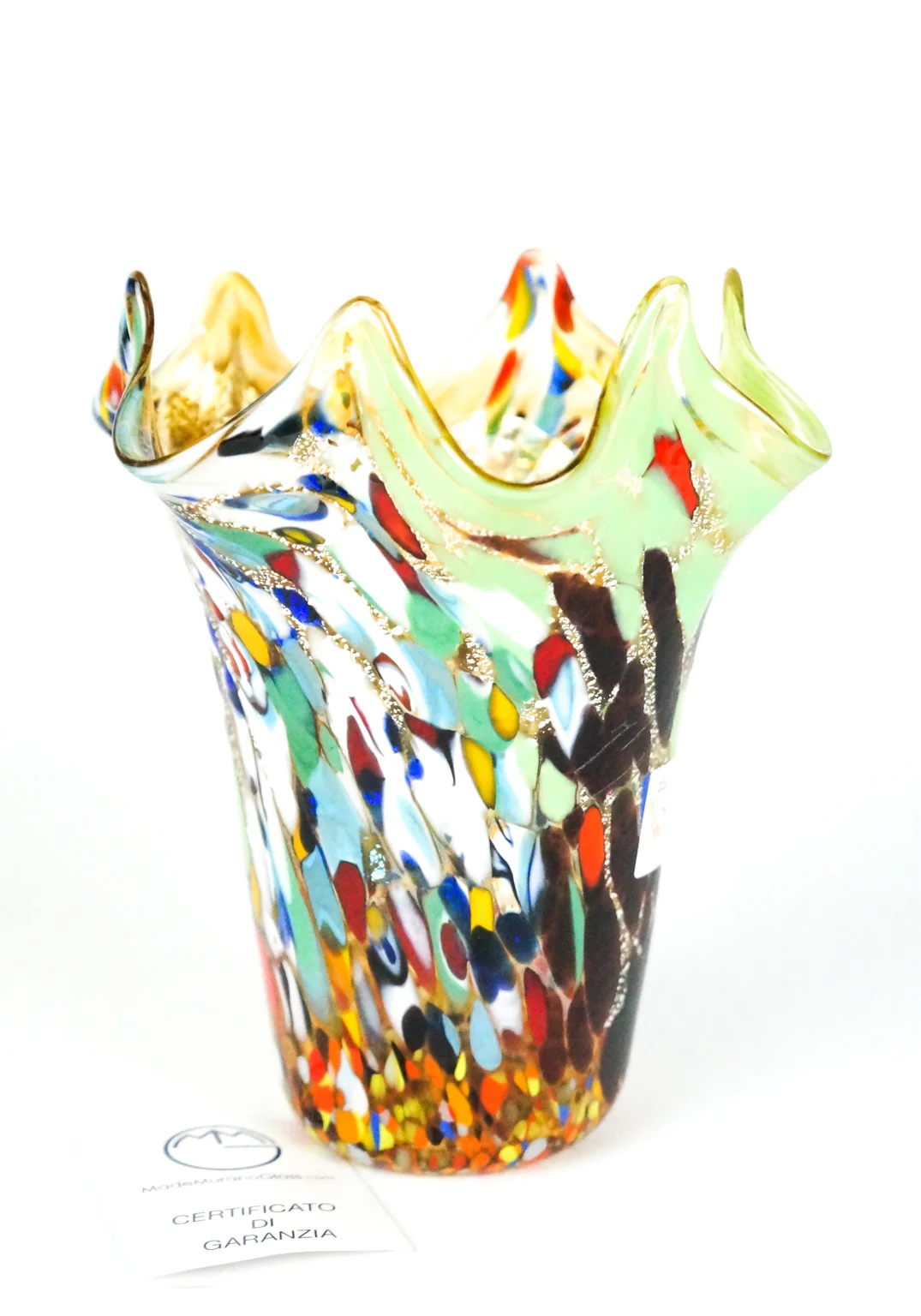 Venetian blown glass amber vase with assorted filigree decorations, Millefiori, “Mace” and silver. “Rossi” glassmaker Master mixes these colors in an ever different way, making the works so unique and inimitable. Vase signed with cold engraving as photos.