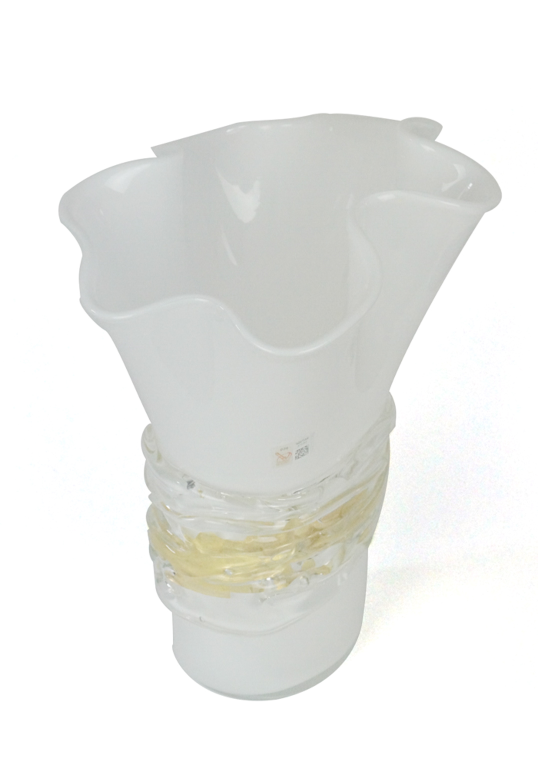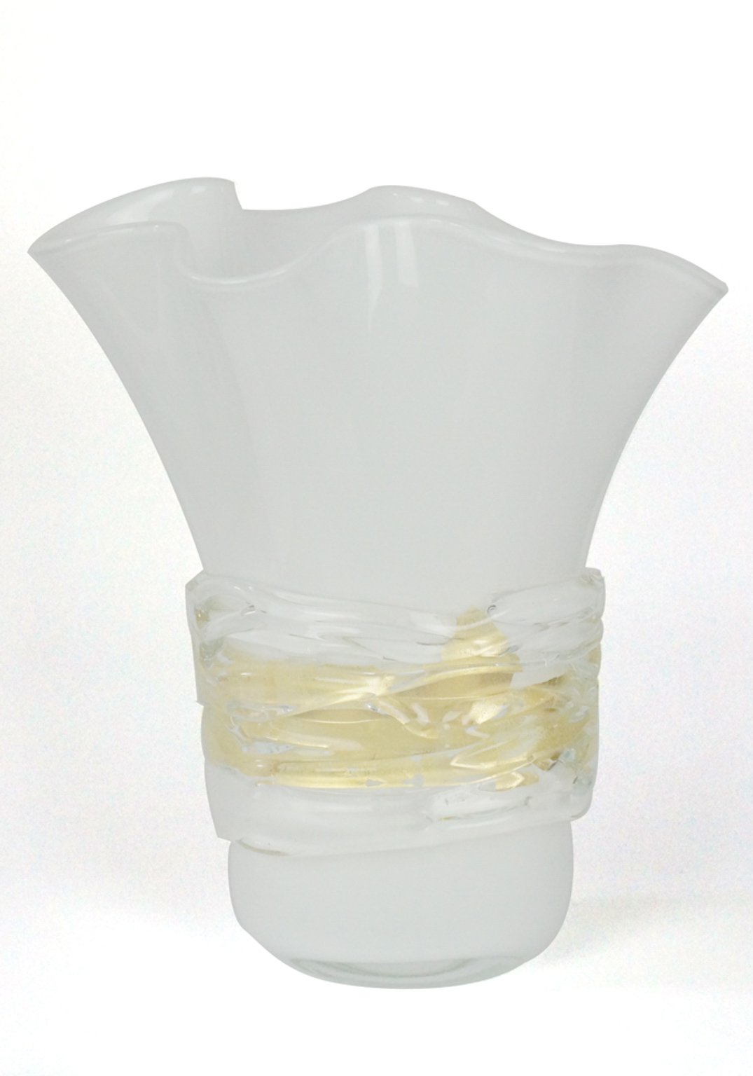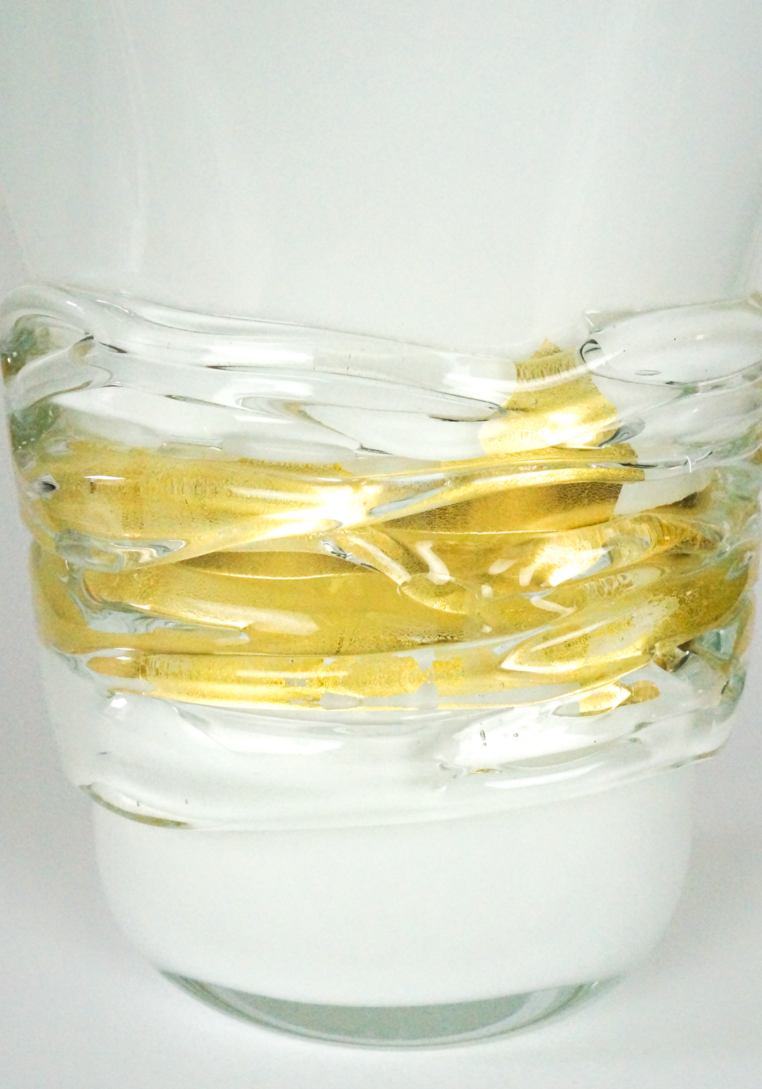 Orodory is an exclusive Murano blown glass vase entirely hand-made in white color with central band in real 24k gold leaf and external glass threads in relief, transparent crystal color.