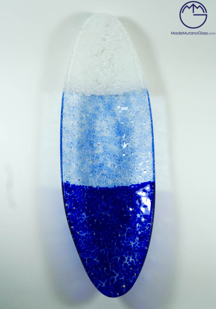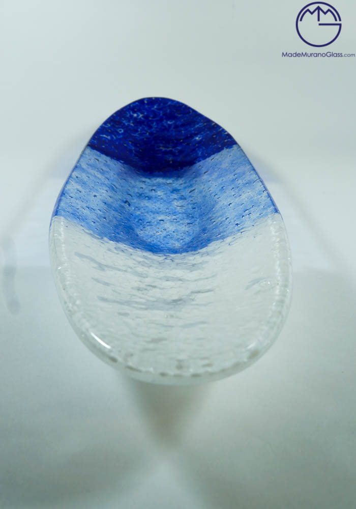 Oval plate with decorations in “Mace” colour blue, white and light blue, carried out with “glass hot plate” processing. This fantastic centrepiece or tray will give you a touch of class to any environment, spreading elegance and uniqueness.