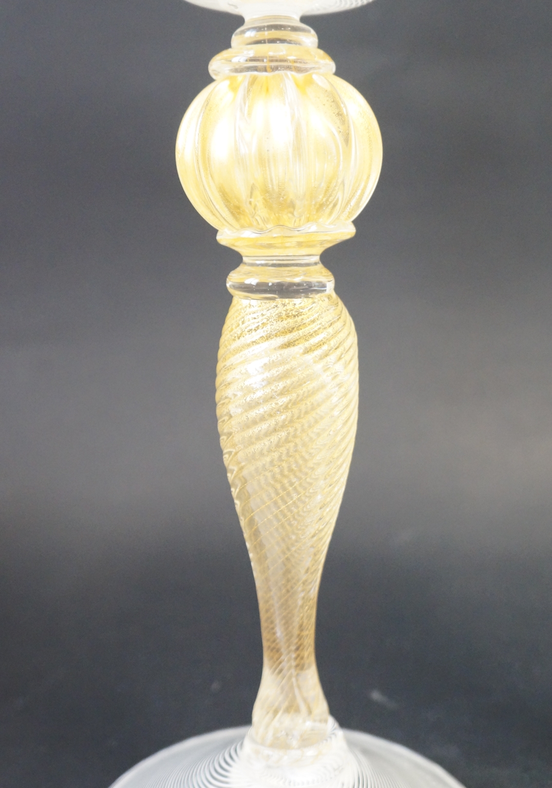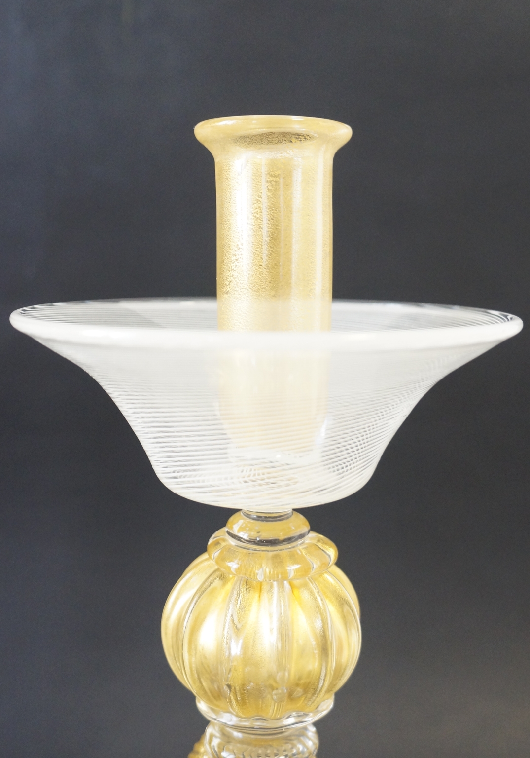 Elegant pair of candles holder in Murano glass with “filigrana” and decorations in gold 24 carats. All our items are entirely handmade by masters glassmakers of Murano, who, together with their co-workers create unique and inimitable works. This magnificent pair of candles holder will add a touch of elegance to any environment. To complete the work Master glassmaker signs the item (with cold engraving).
