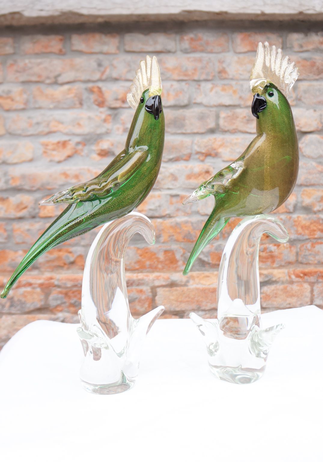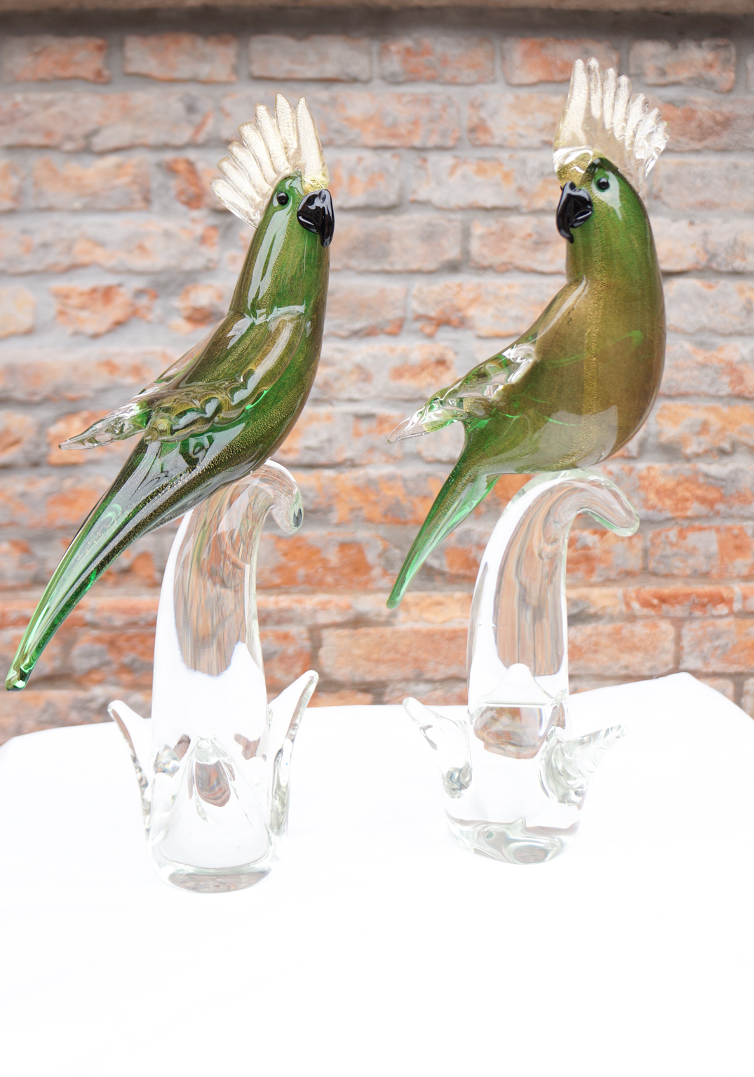 Pair of Green And Gold Murano Glass Parrots handmade with base in transparent crystal glass and sculptures in real silver leaf and 24kt gold.