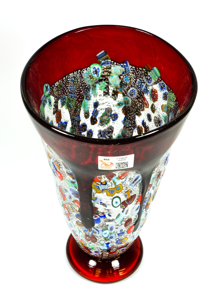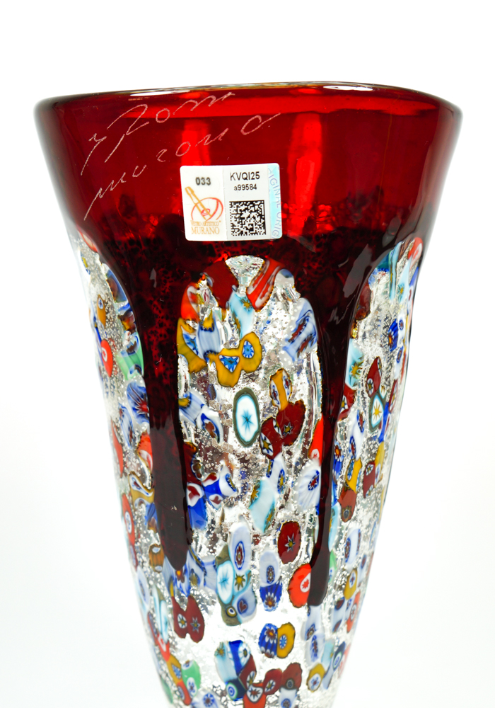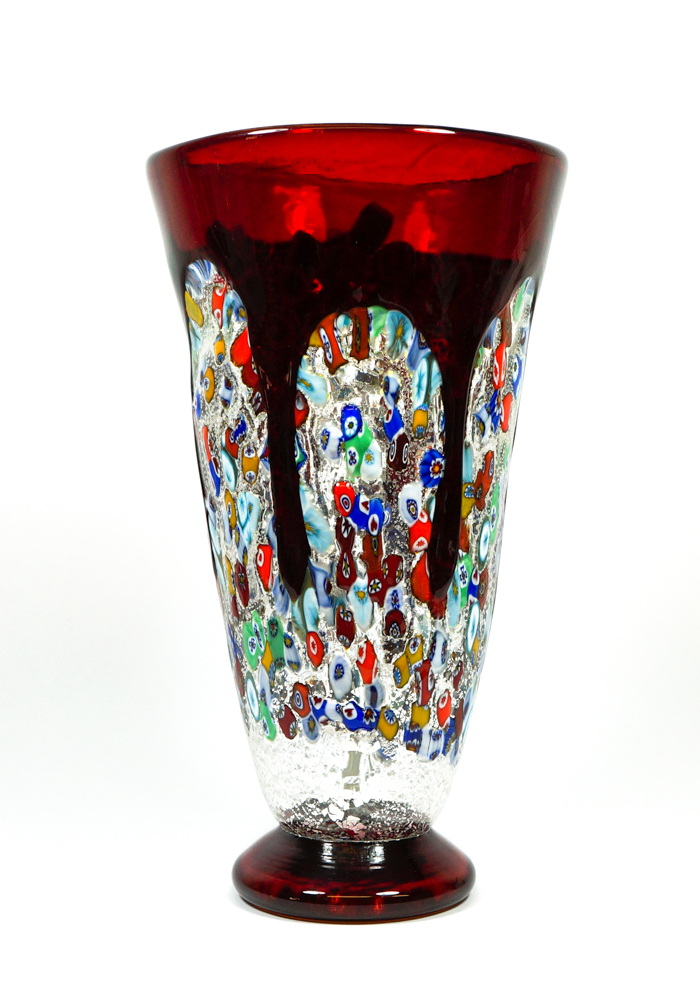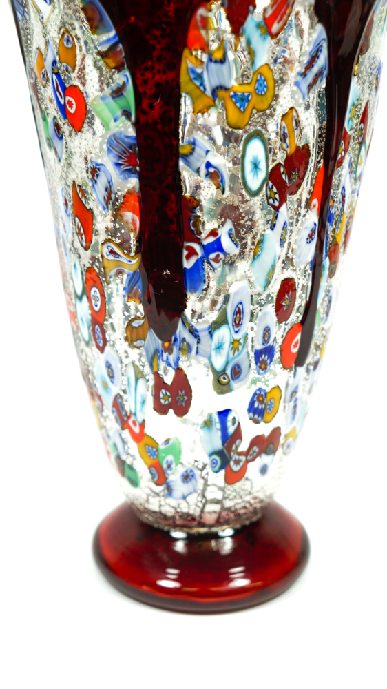 Bocca di Fuoco is a Vase in blown red glass with decorations in Murrina Millefiori and silver leaf.