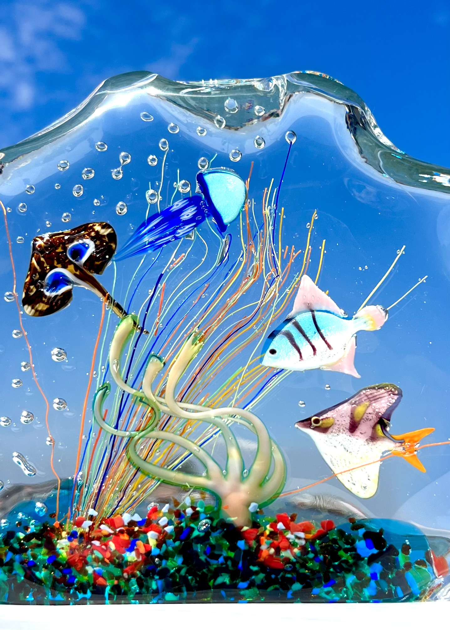 Half-moon aquarium sculpture in Murano glass.