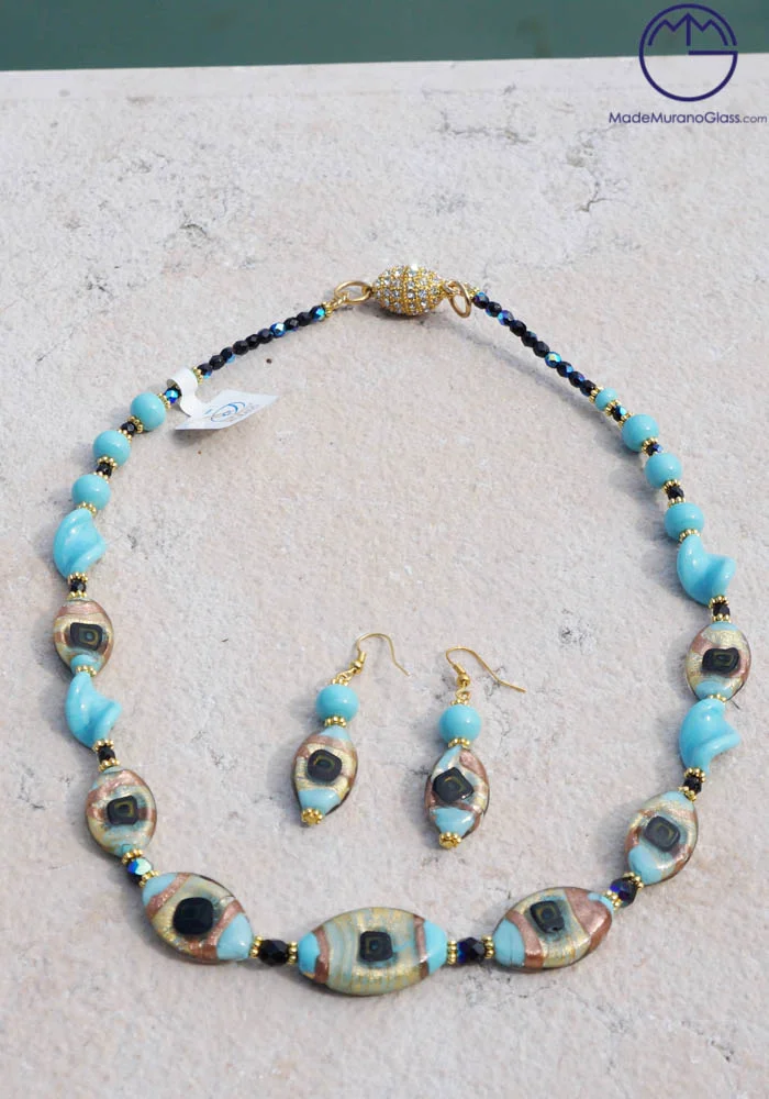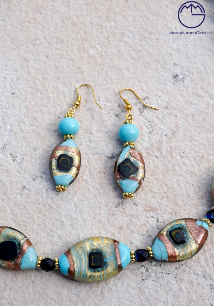 Wonderful necklace and earrings in Murano glass, completely handmade with coloured beads and “avventurina“. Venetian glass jewellery are carried out with “lume” technique. Elegant, class and sophistication are suitable words for this amazing Murano collection jewellery.