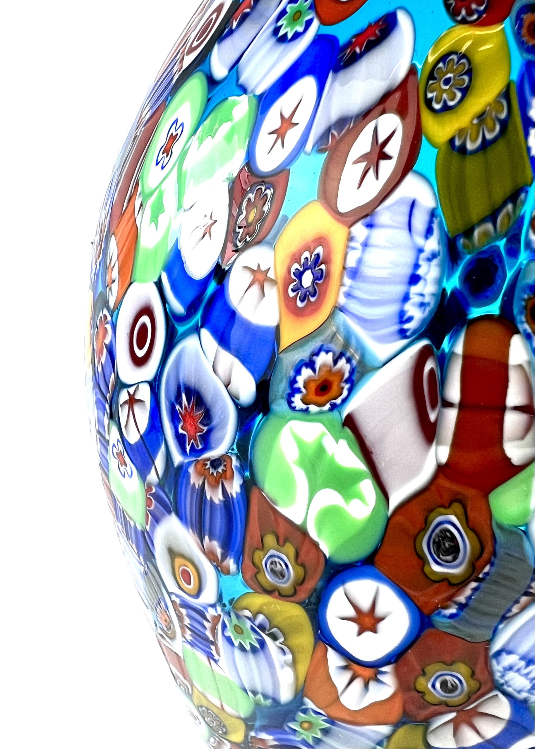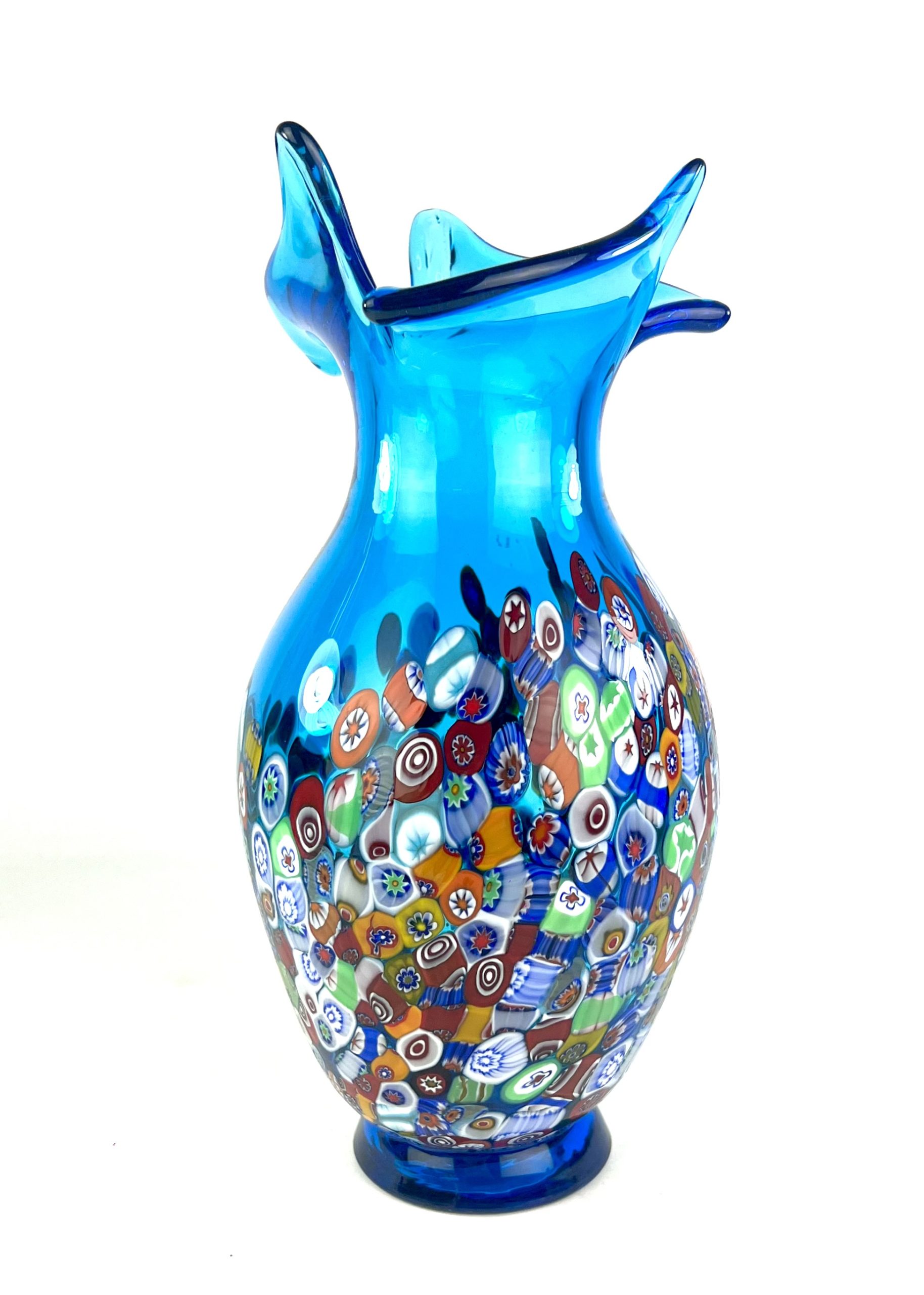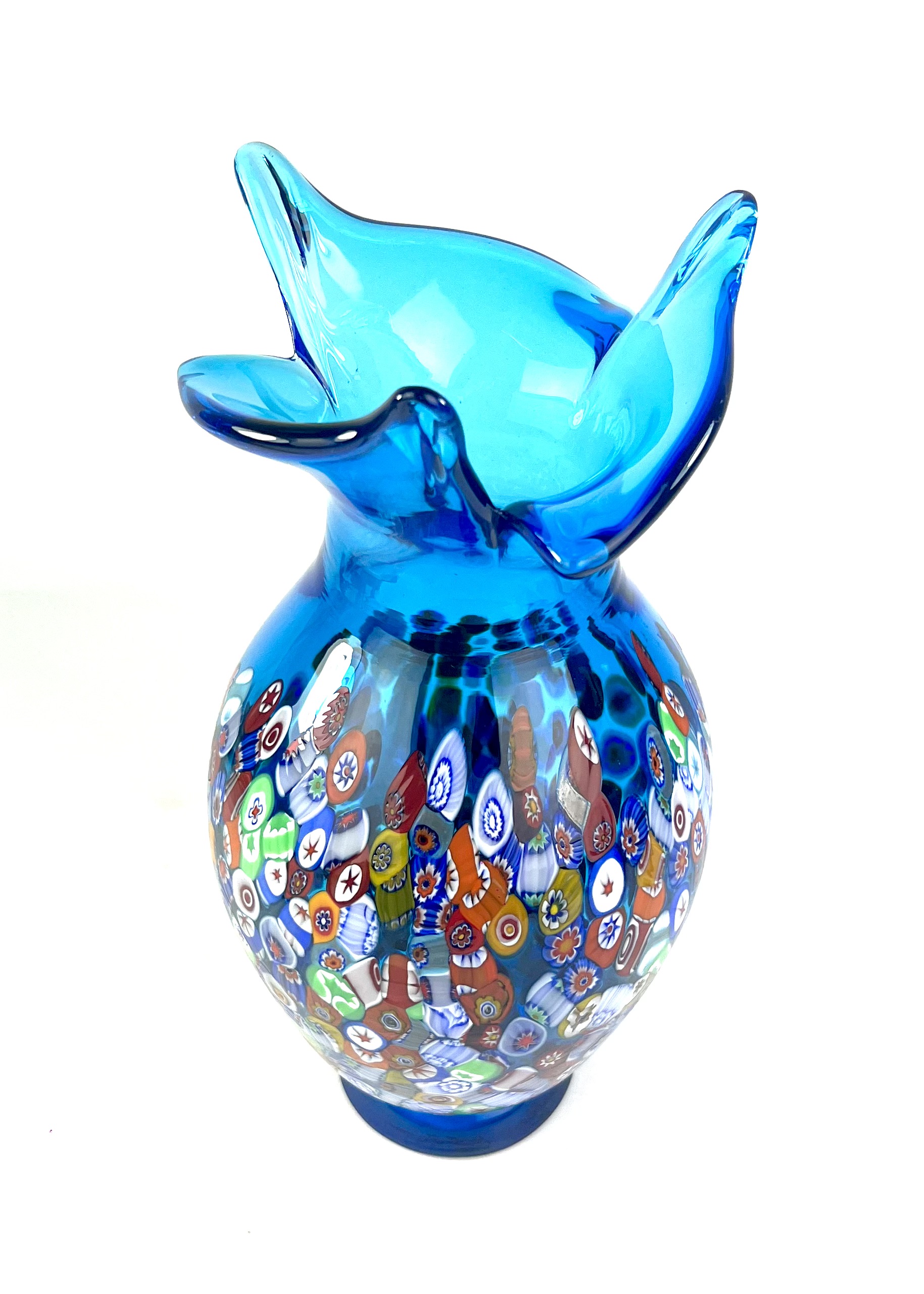 Murano blown glass vase covered with murrina millefiori with a band of color on the top.