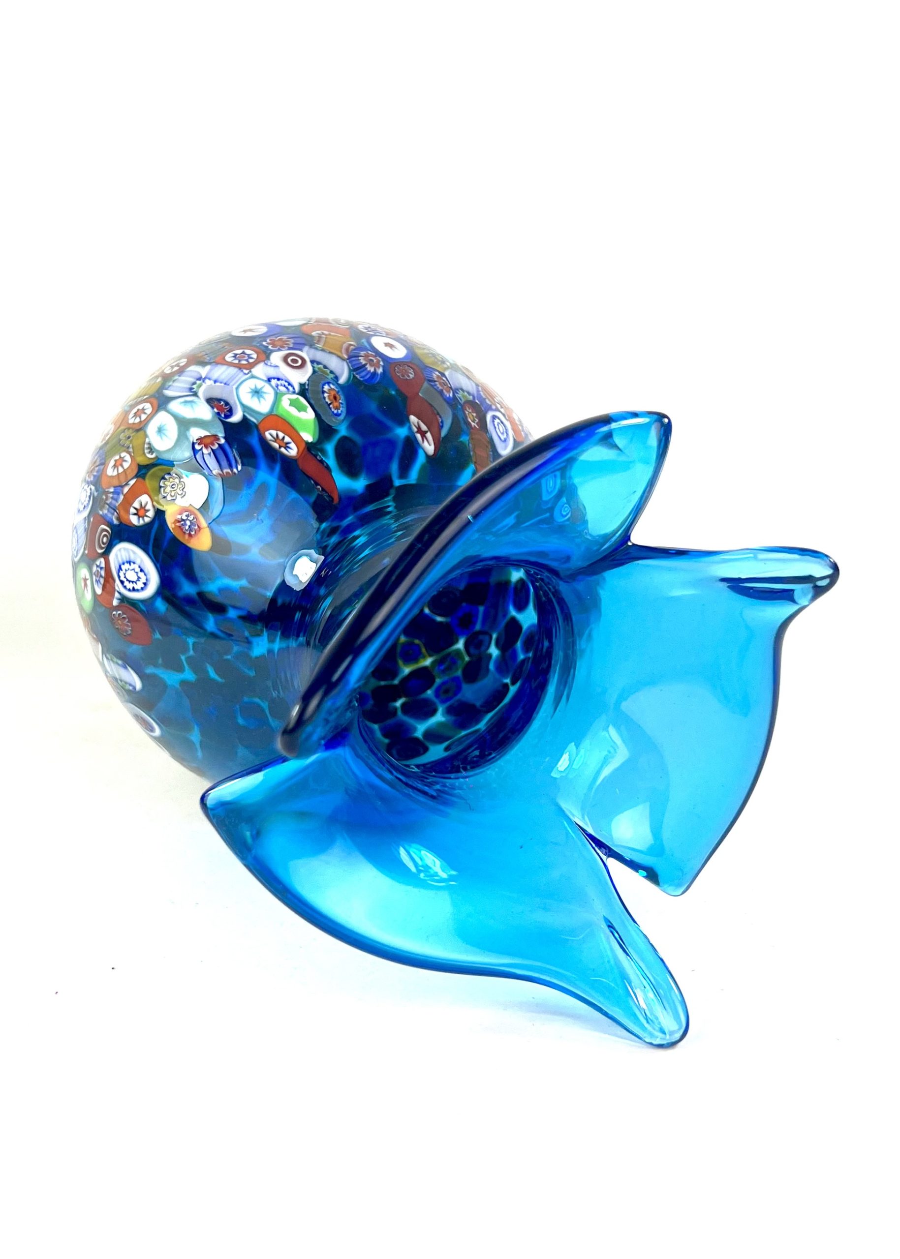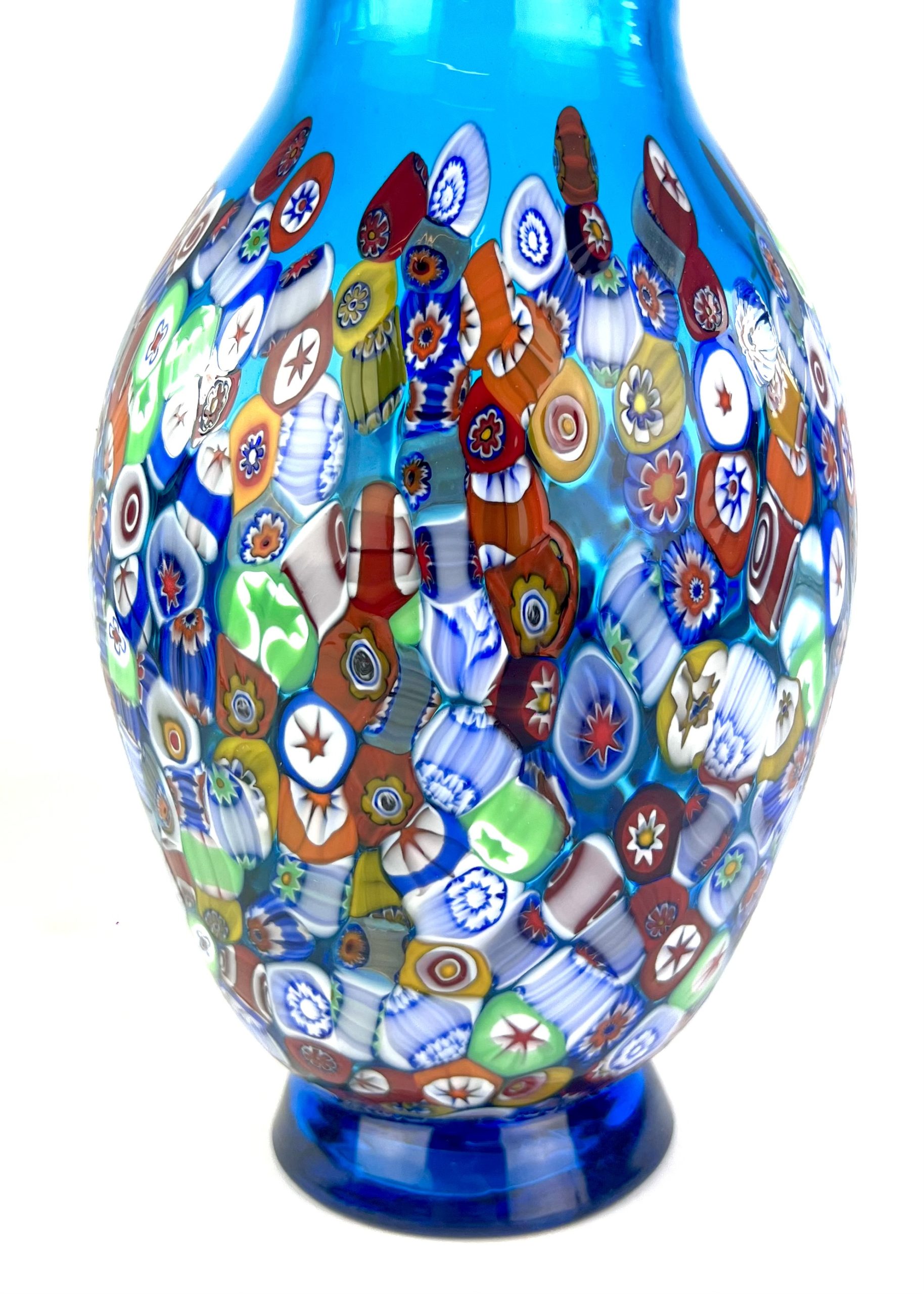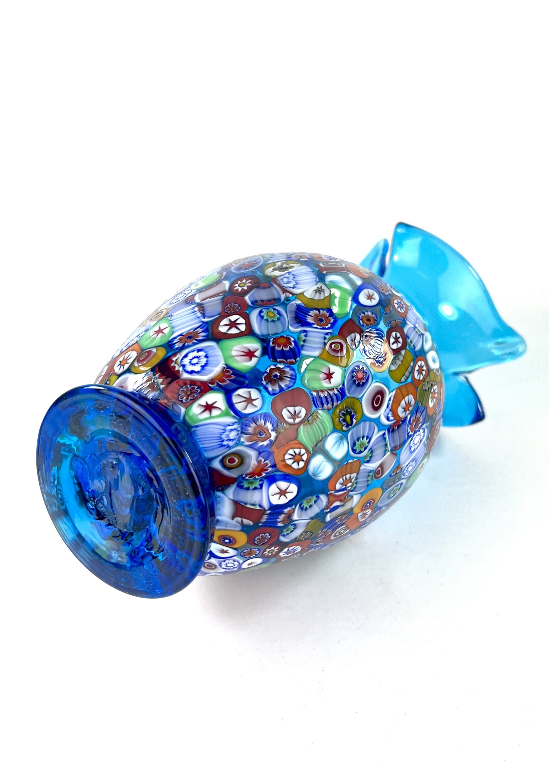 Murano blown glass vase covered with murrina millefiori with a band of color on the top.