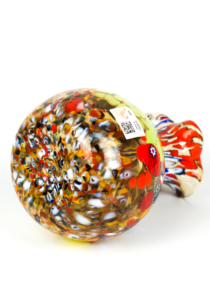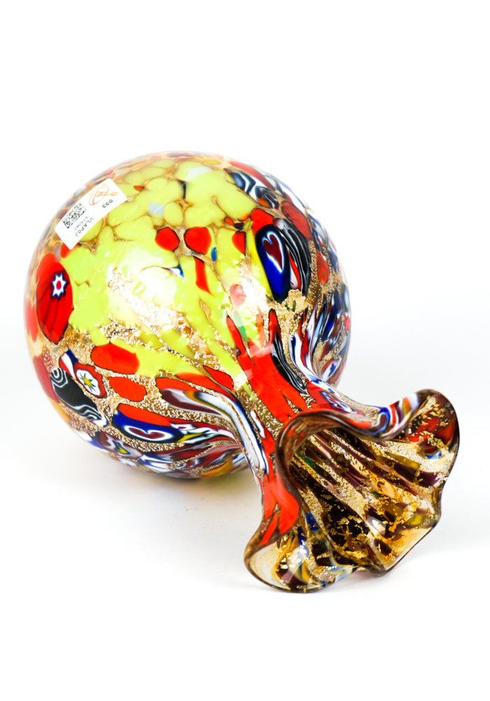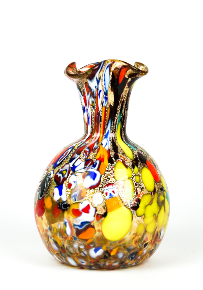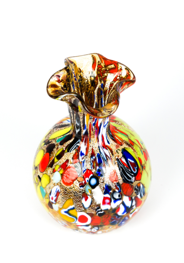 Murano blown glass vase with assorted decorations of millefiori murrina, mace and real silver leaf.