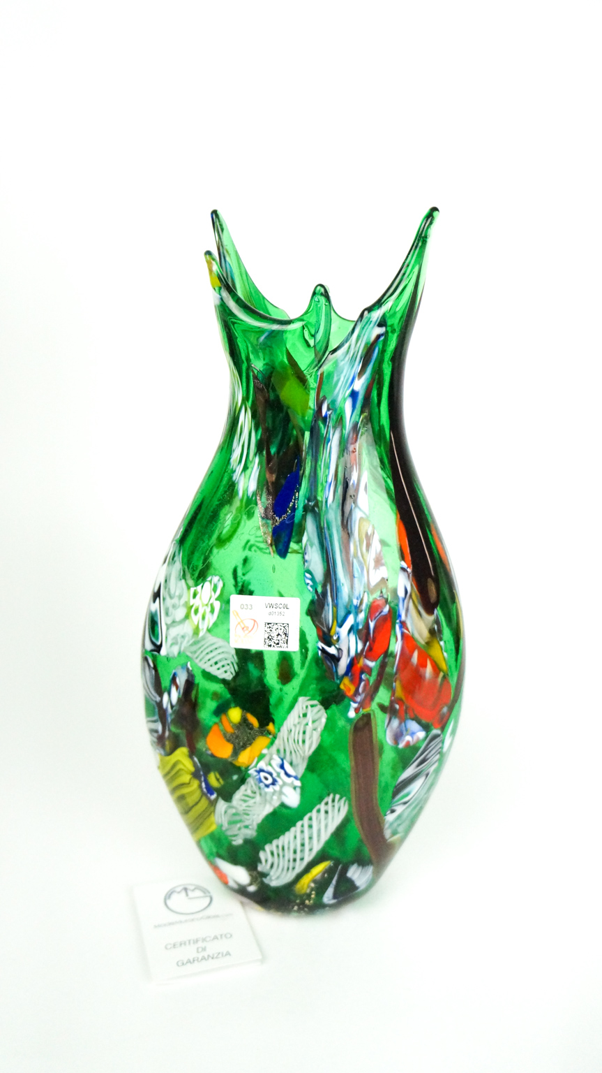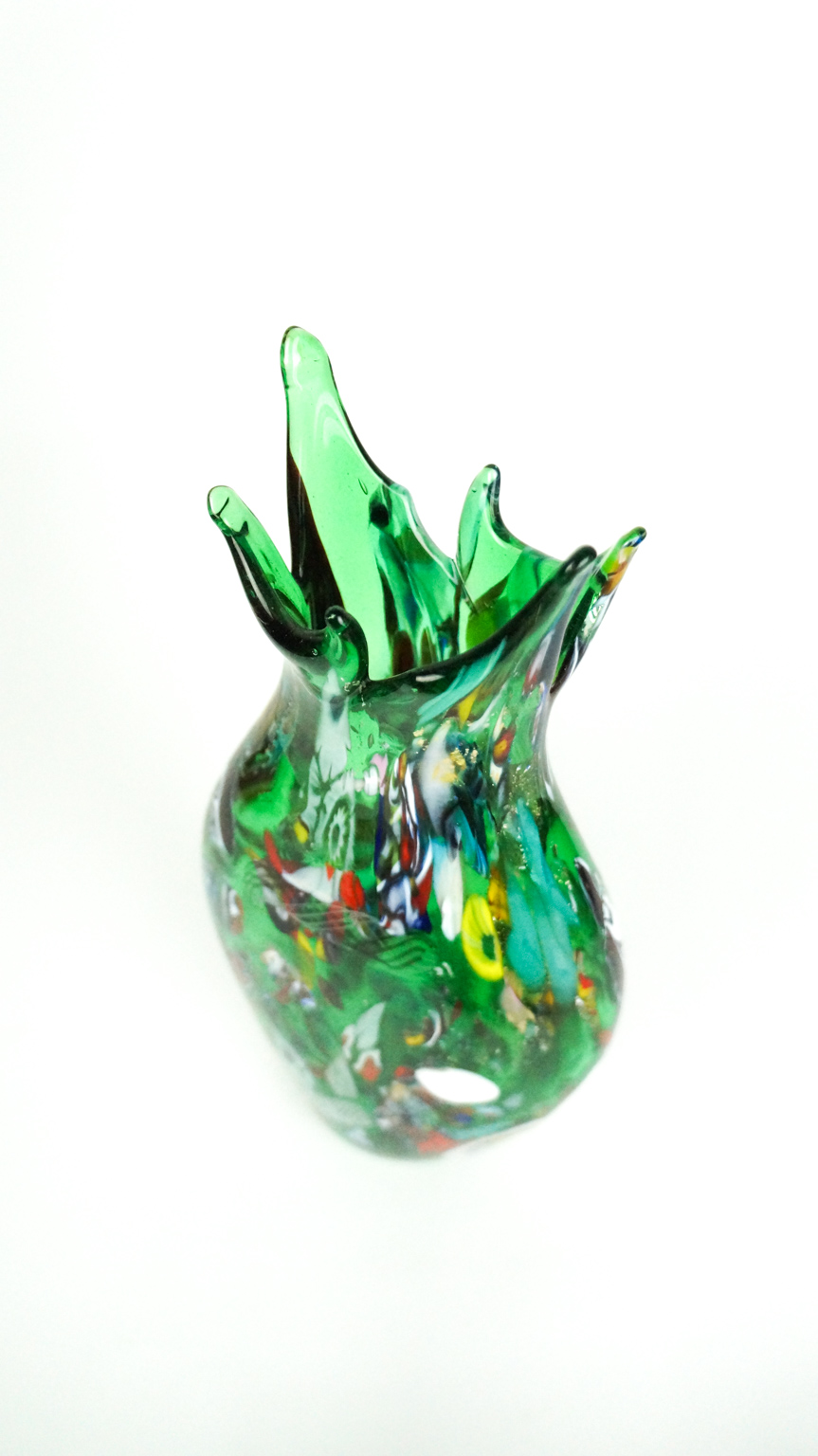 Venetian blown glass green vase with assorted filigree decorations, Millefiori and “Mace”.