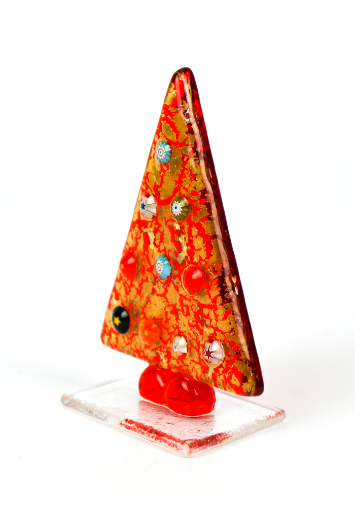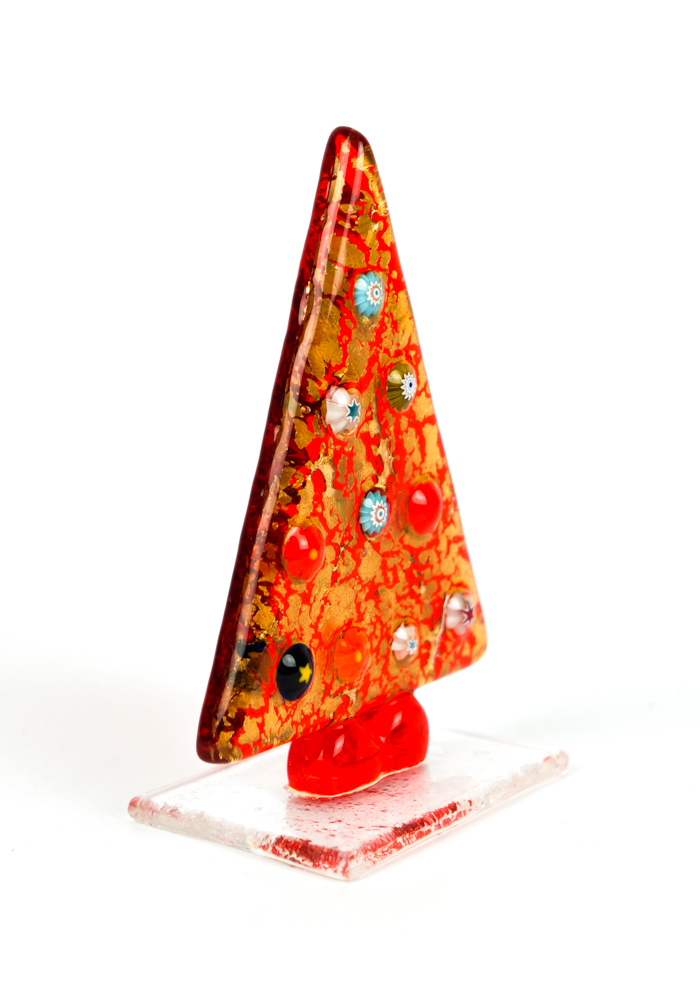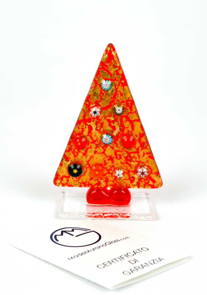 Christmas tree in Murano glass colour red with decorations in murrina “millefiori”, gold leaf 24 carats and base in Murano crystals.