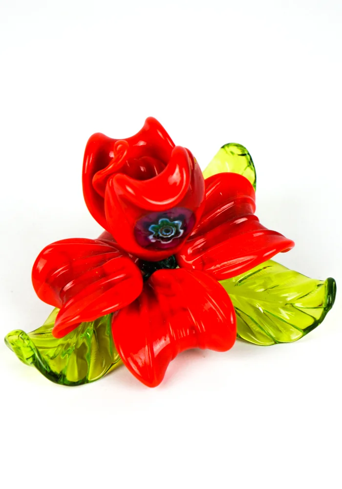 Red Rose Flower in Murano glass with green leaves and decoration in the murrina Millefiori petal.