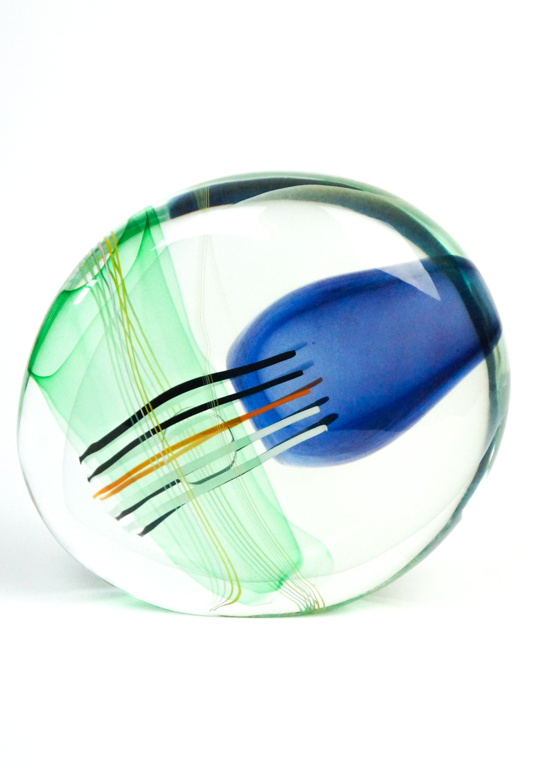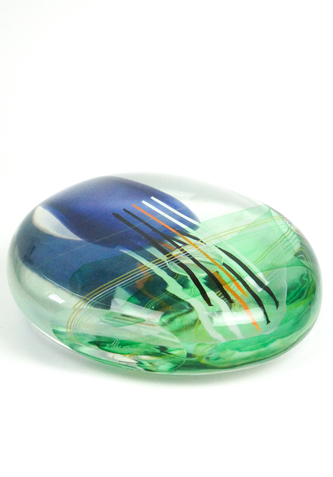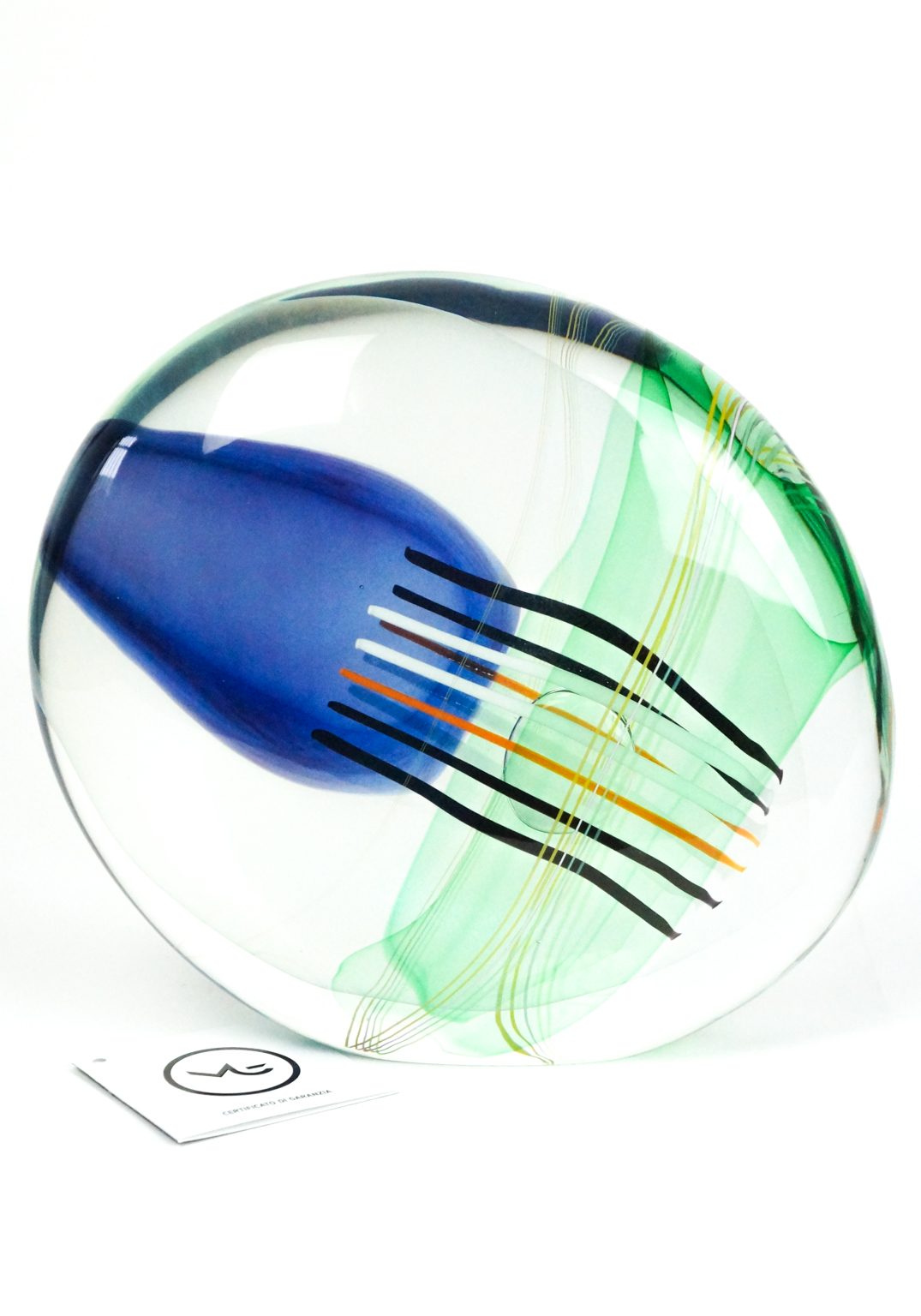 Exclusive Murano Glass Sculpture entirely handmade in thick, transparent crystal, blue, green color with colored filigree threads.