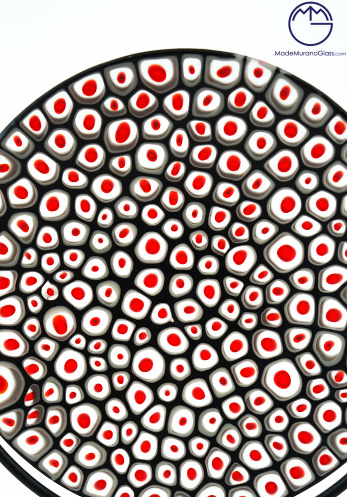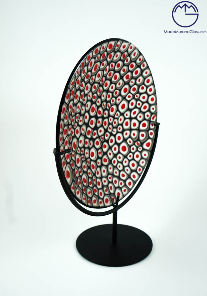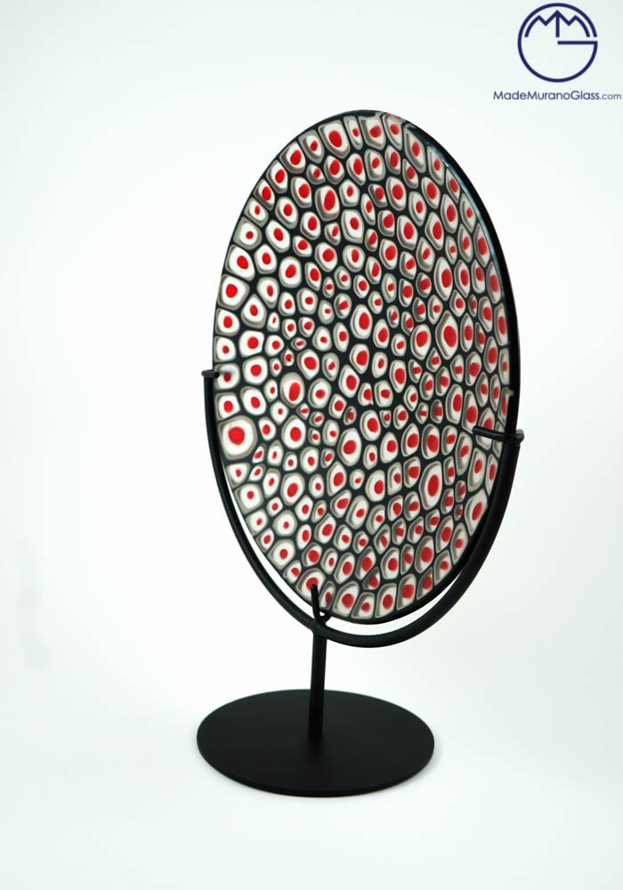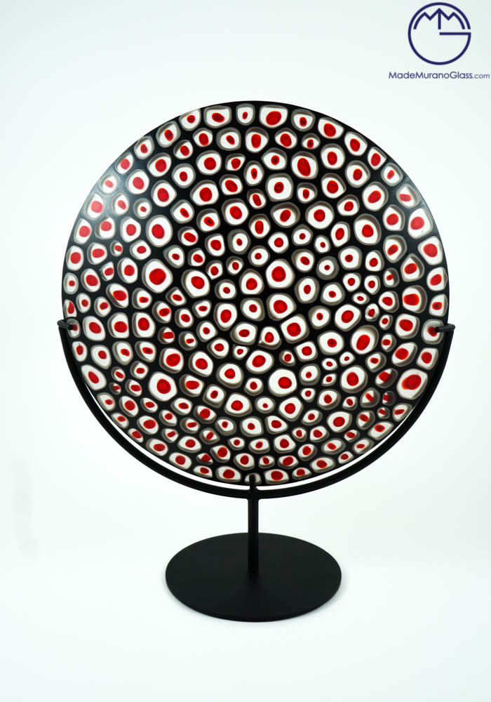 Elegant and exclusive plate in Murano glass colour black with decorations in red murrina and pedestal in black metal. Carried out with glass fusion technique by our skilled Murano artisans. This work will give you a touch of class to any environment, spreading elegance and uniqueness.