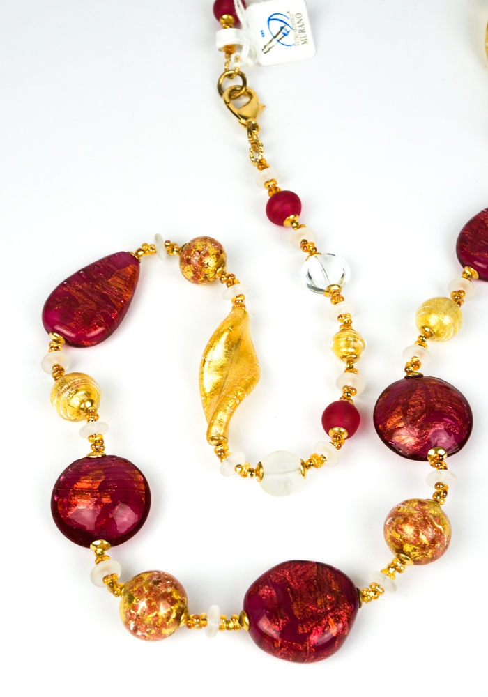 Murano glass necklace entirely handmade with “Lume” glass processing technique. The bright color, the refinement and the lightness with which these jewels are made, make the Made Murano Glass unique and inimitable. The pearls of this fantastic jewel in Murano blown glass have different shapes, assorted colors and processing in gold leaf 24k and aventurine. Murano glass jewels are artifacts of art and beauty that every woman would like to wear.